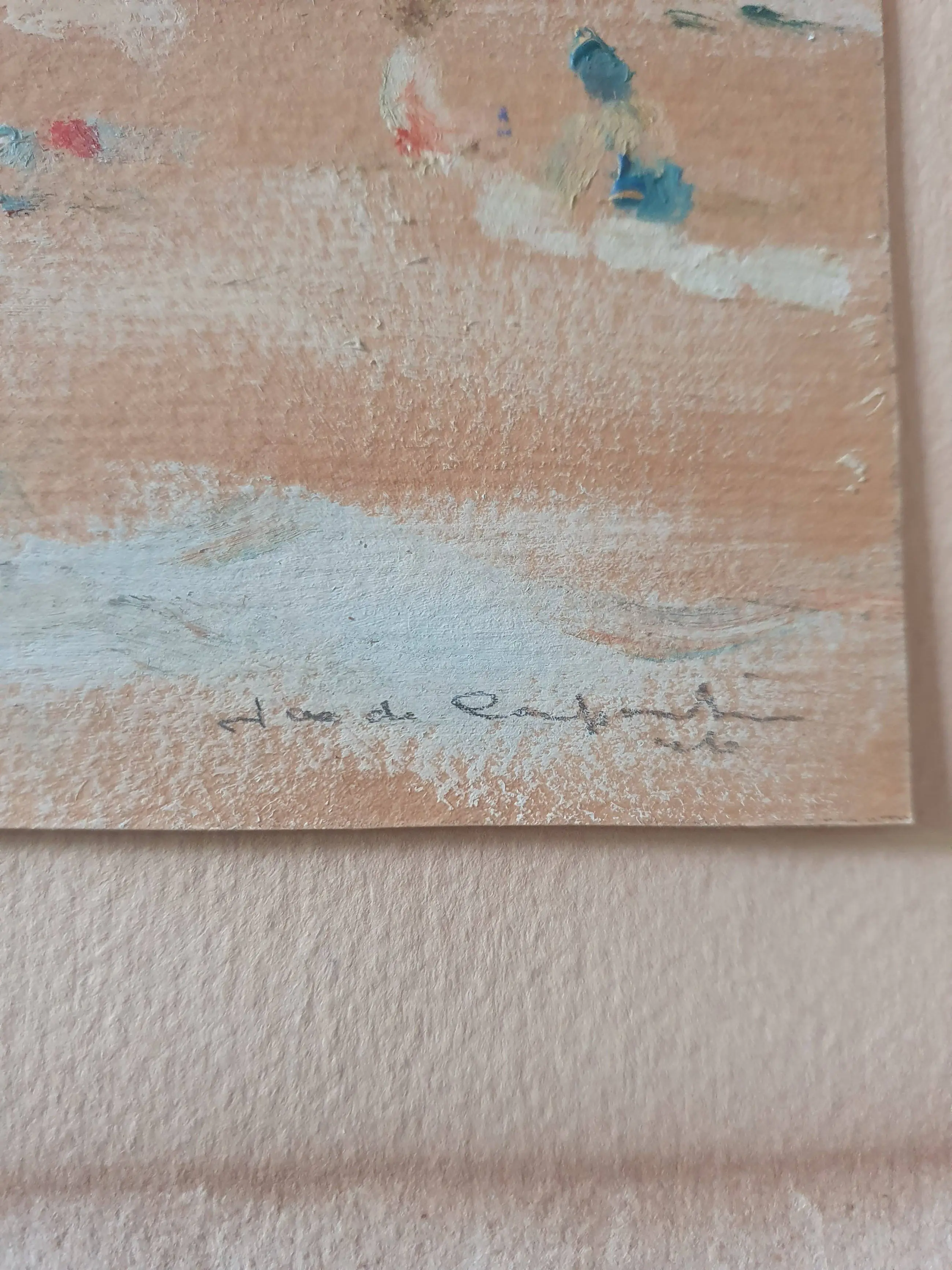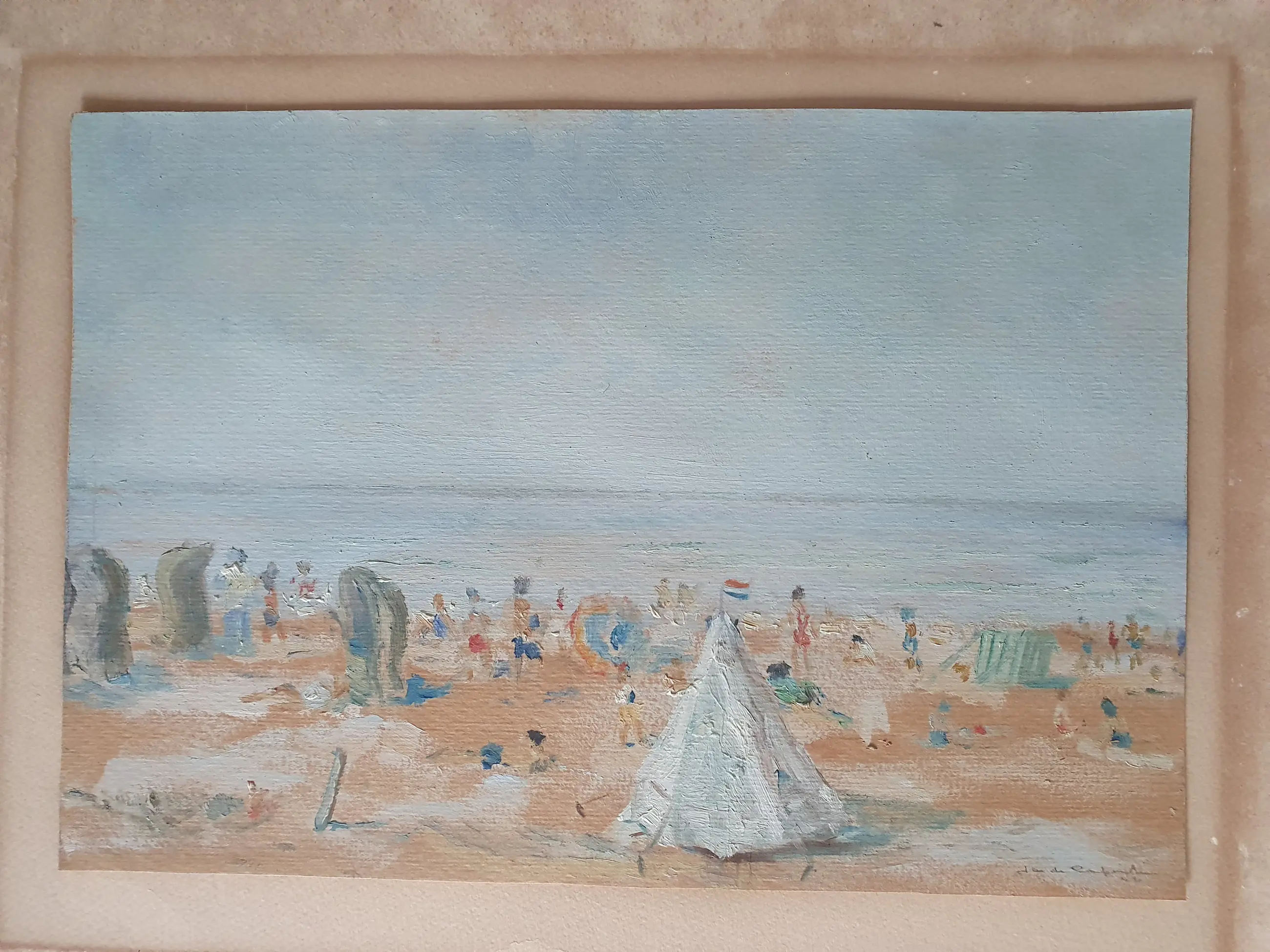 De aquarel is puntgaaf alleen het passepartout heeft een watervlek. Heeft altijd bij mijn ouders aan de muur gehangen en is rechtstreeks bij Jaap de Carpentier gekocht.