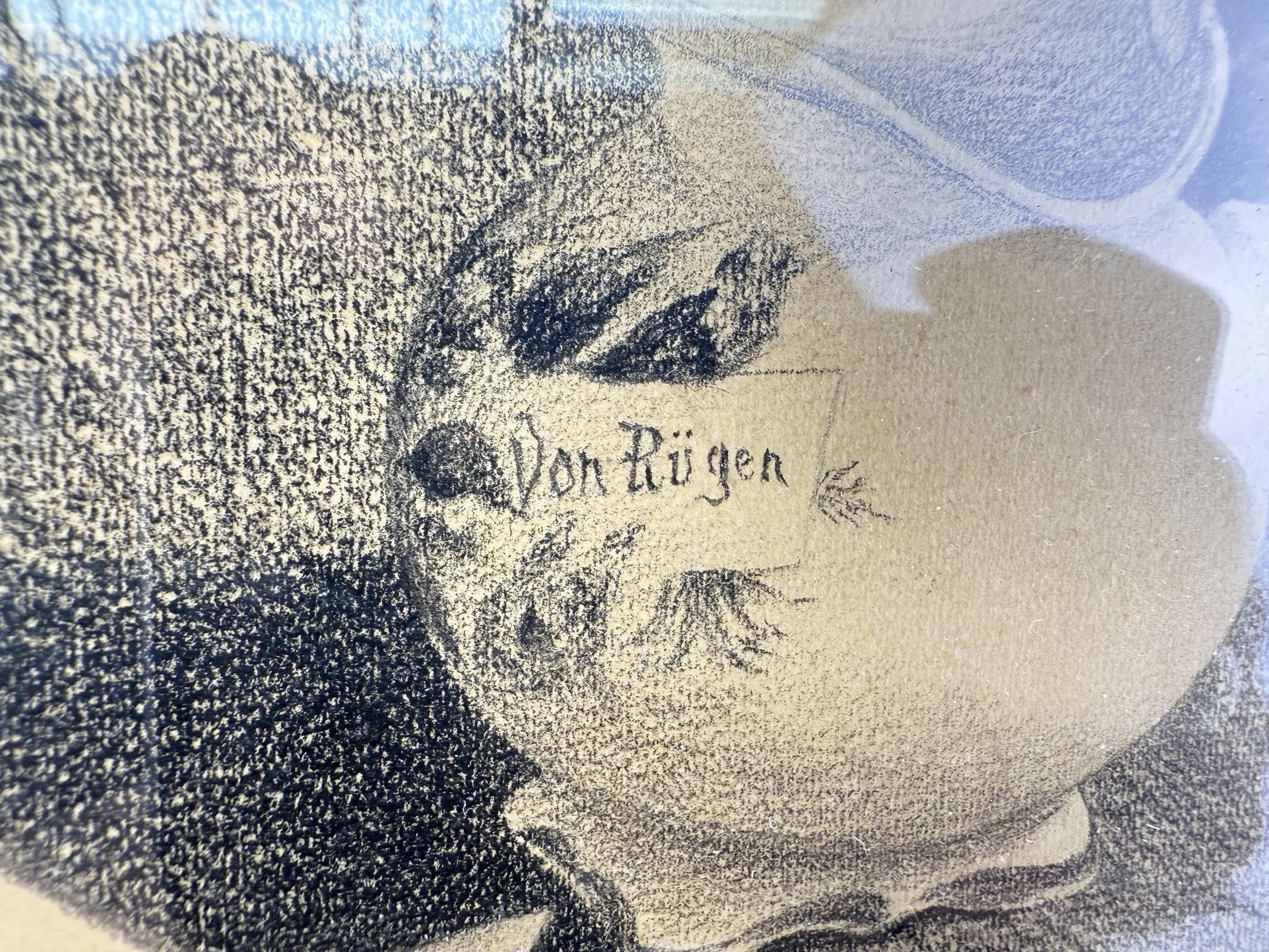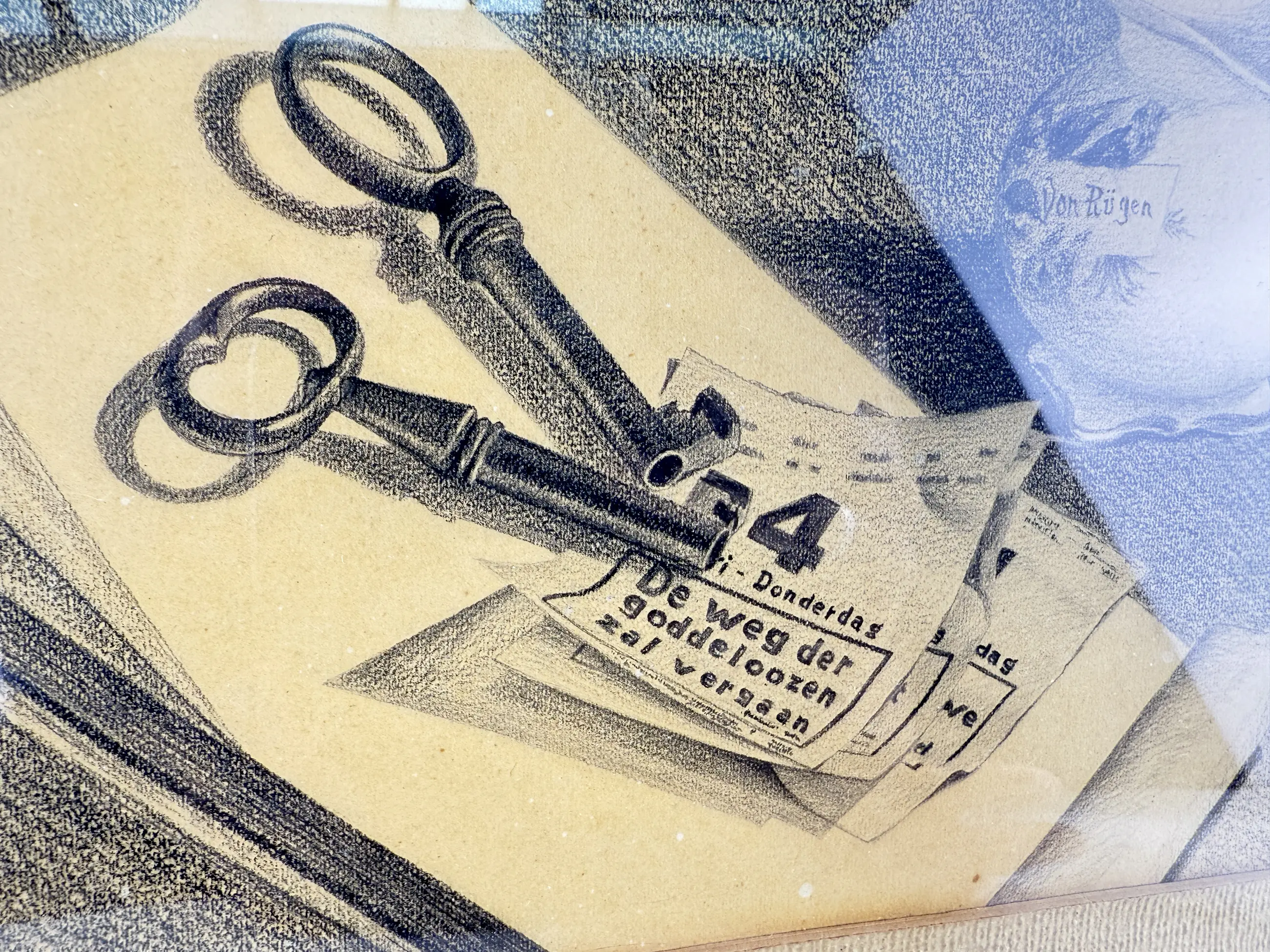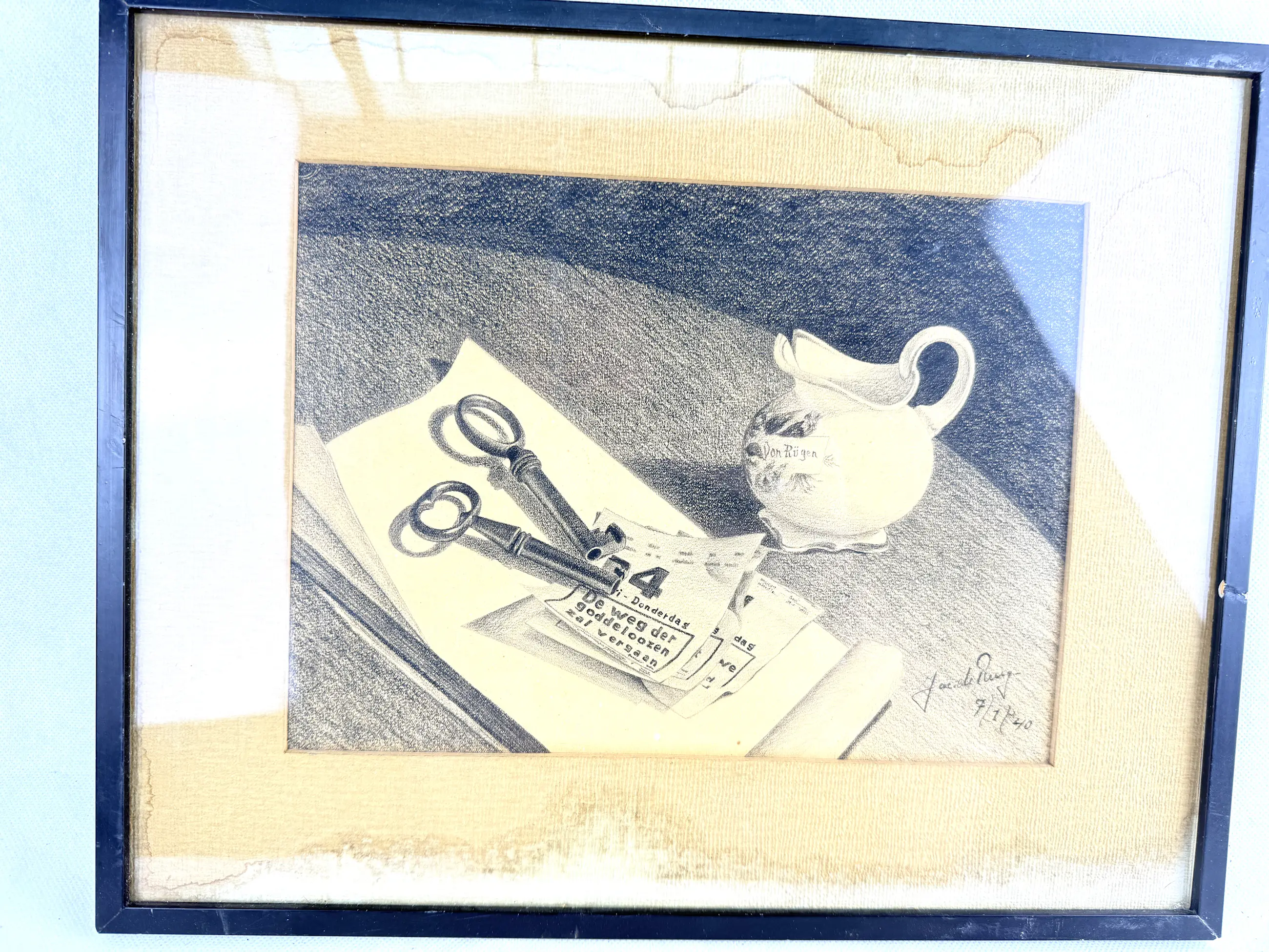 De compositie toont een intiem stilleven met een sleutelbos, verspreide papieren en een kan met het opschrift Von Rügen. Dit vroege werk, uitgevoerd met veel aandacht voor detail en delicate schaduwen, toont De Ruigs tekentalent. Jaap de Ruig, bekend om zijn landschappen, portretten en (bloem)stillevens, was werkzaam in Baarn en gaf er tekenles.
