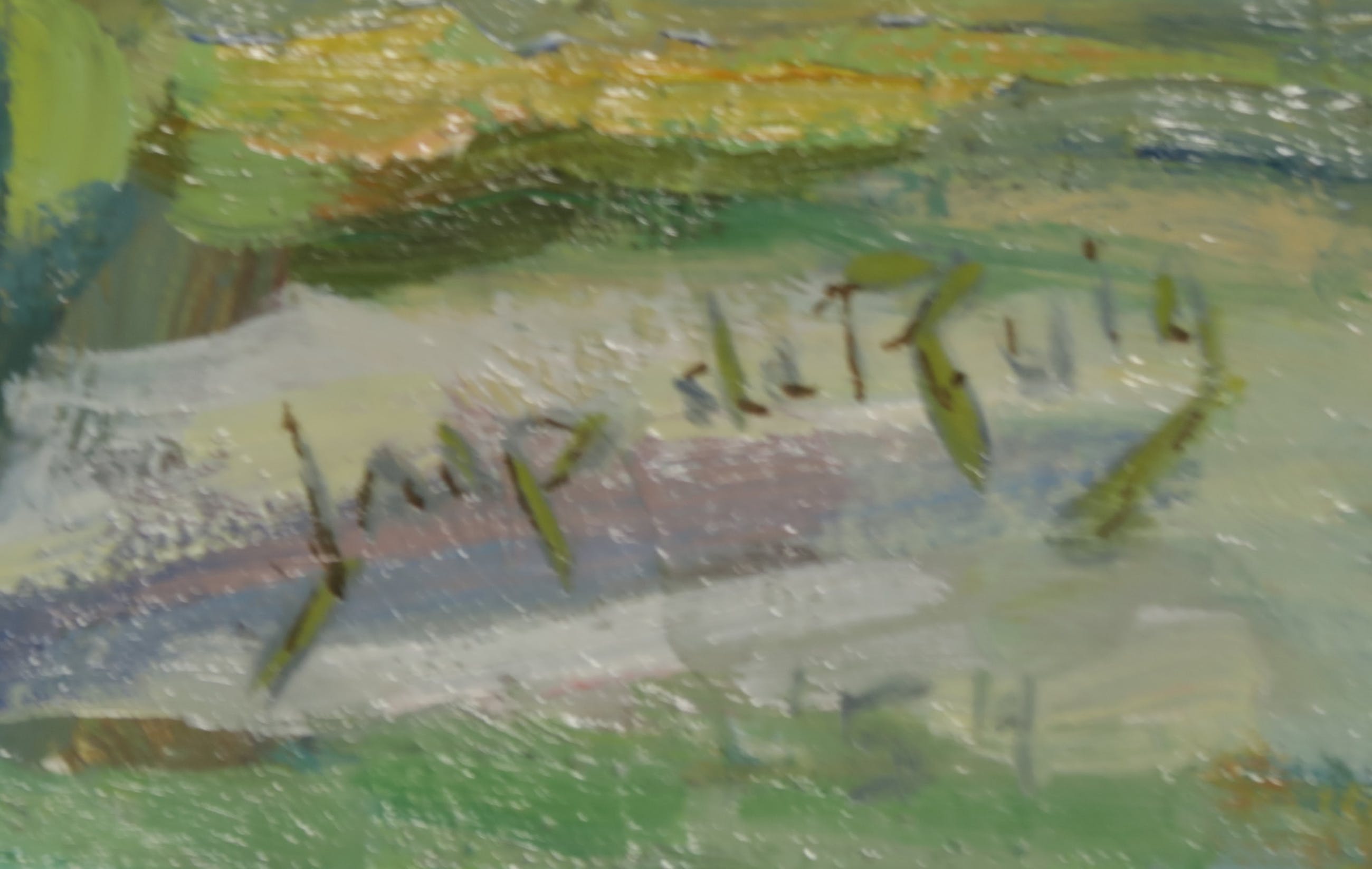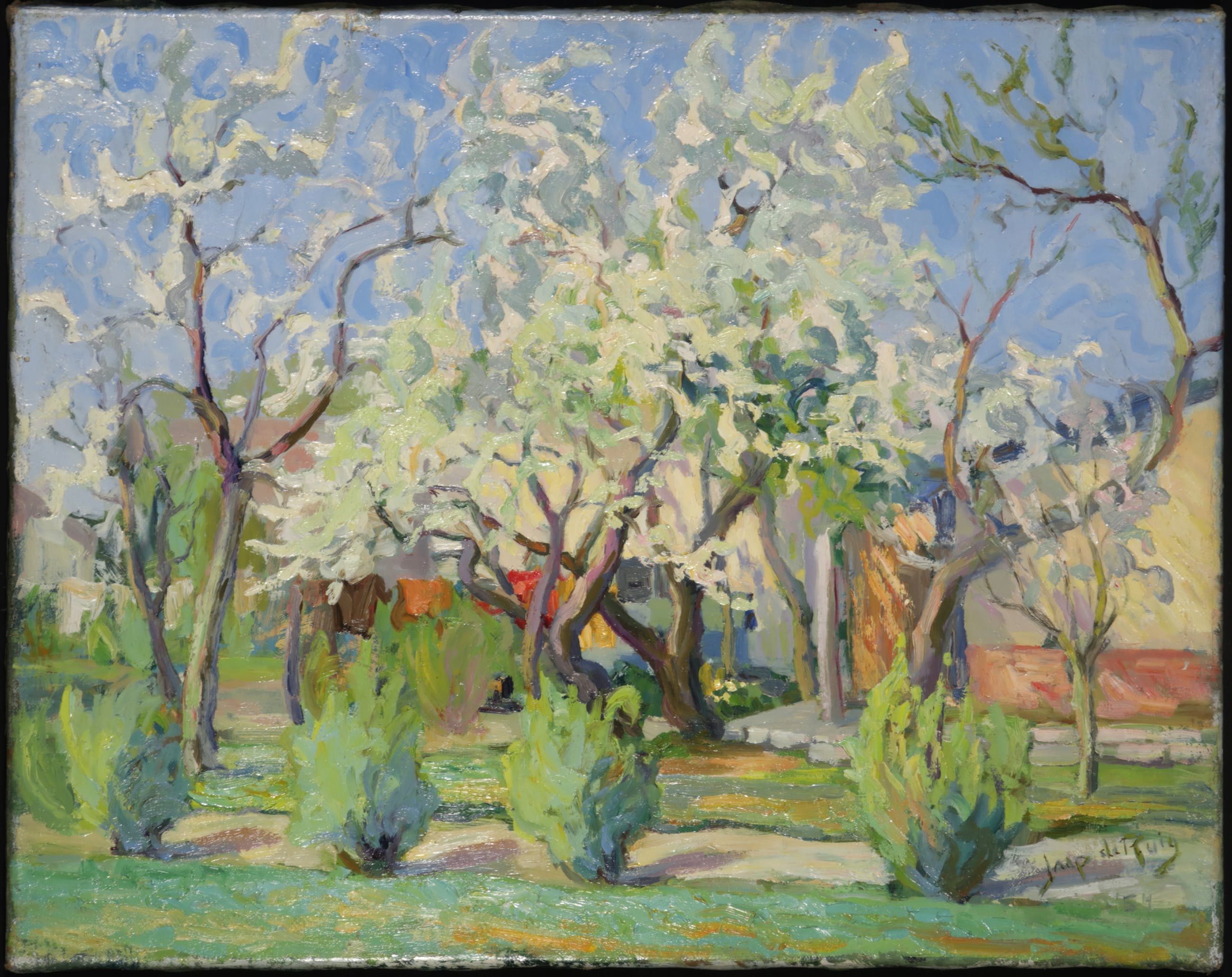 Kleurrijke voorstelling van bomen met bloesem. Gesigneerd rechtsonder in de hoek en op verso.
