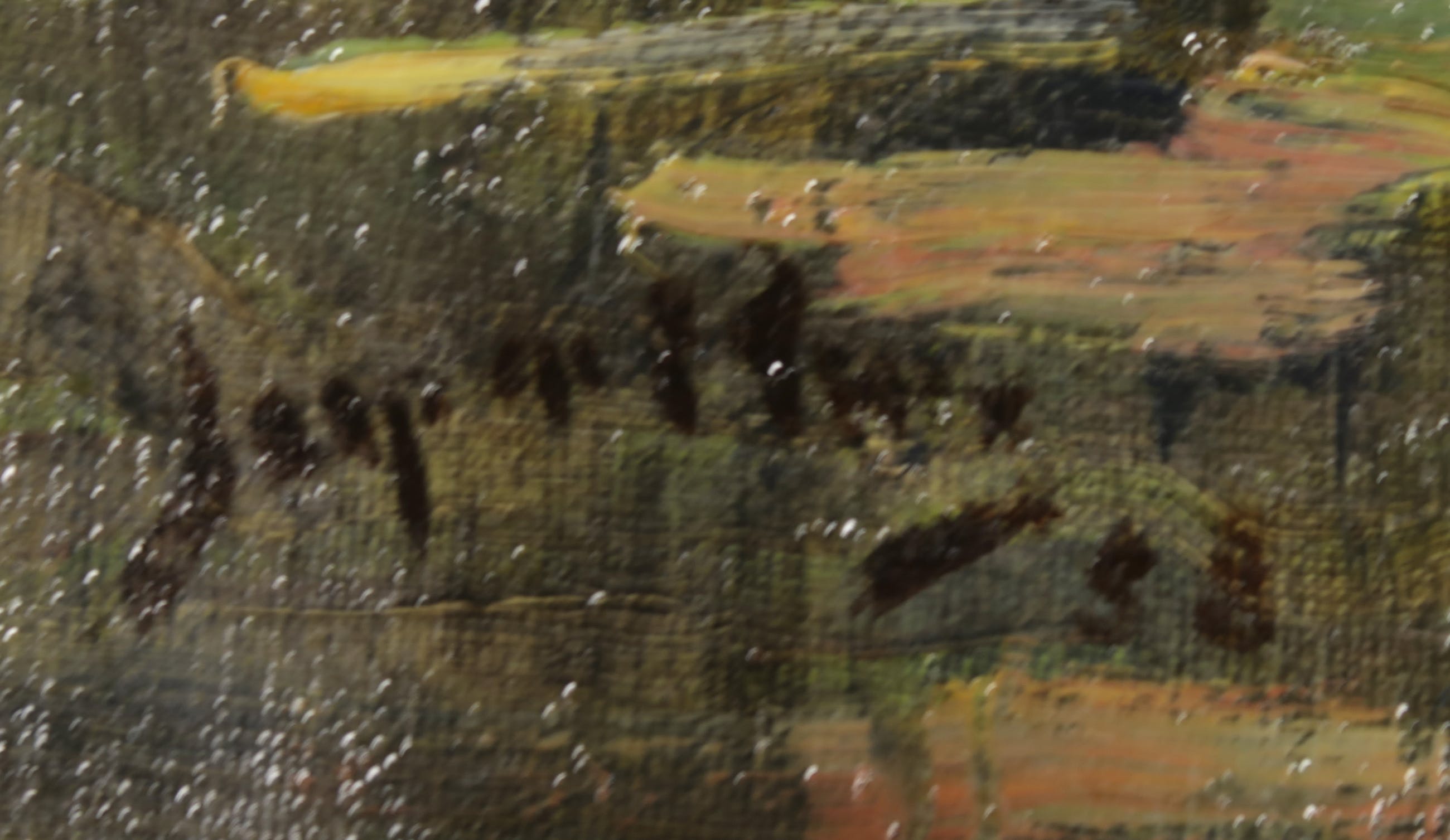 | Het doek is in de hoeken rondom voorzien van kleine gaatjes. De randen en de hoeken van het canvas zijn verweerd door ouderdom. | |