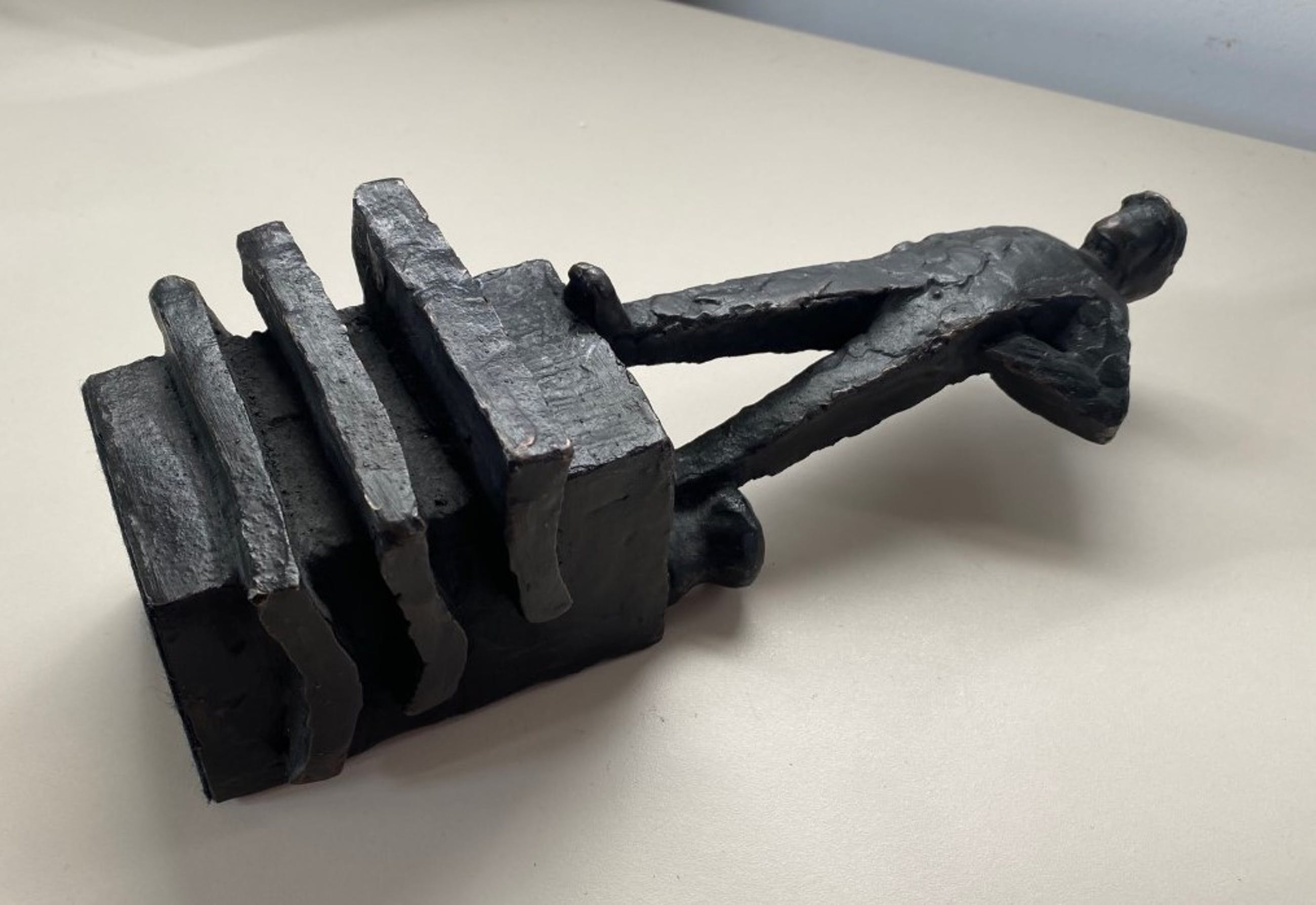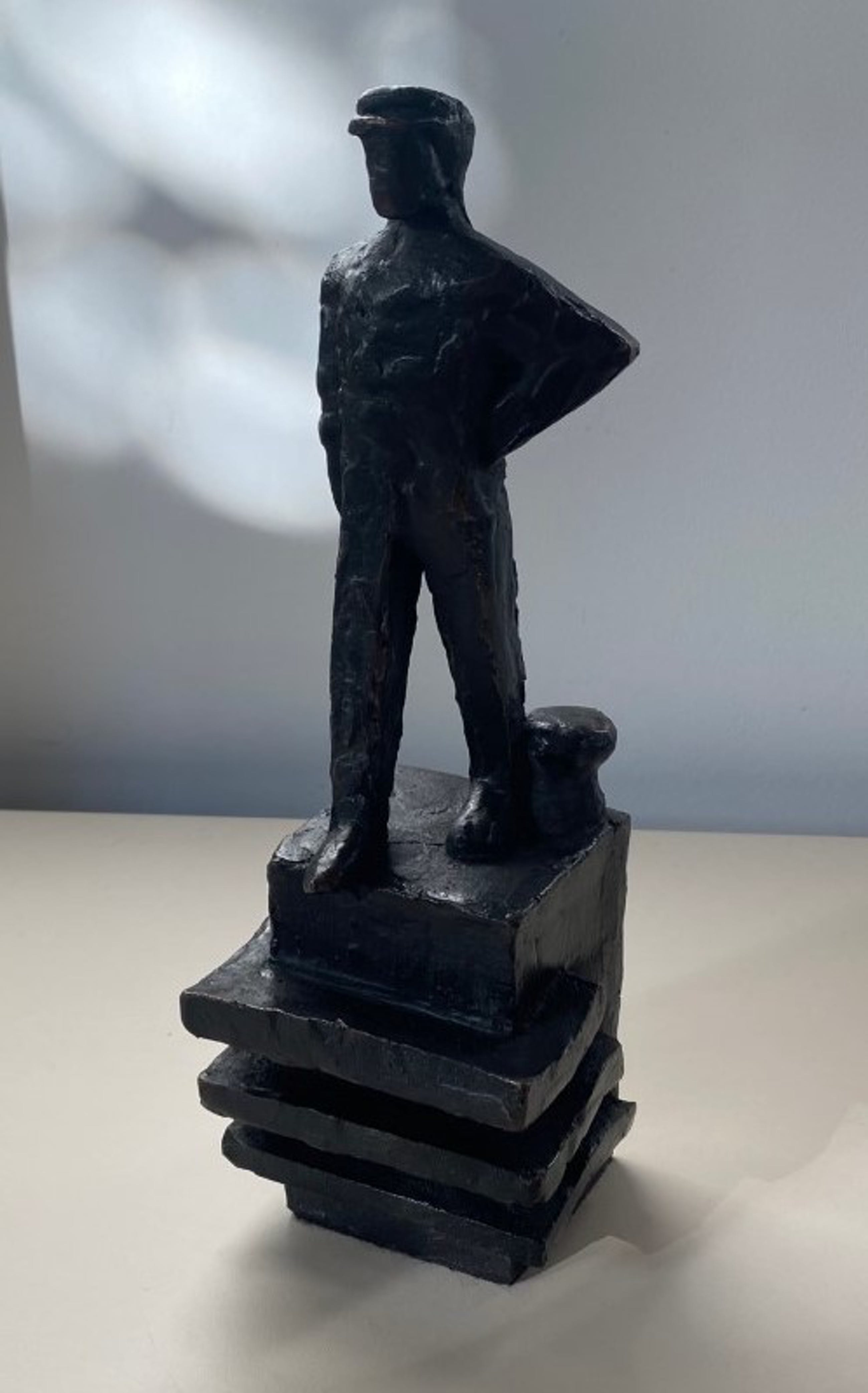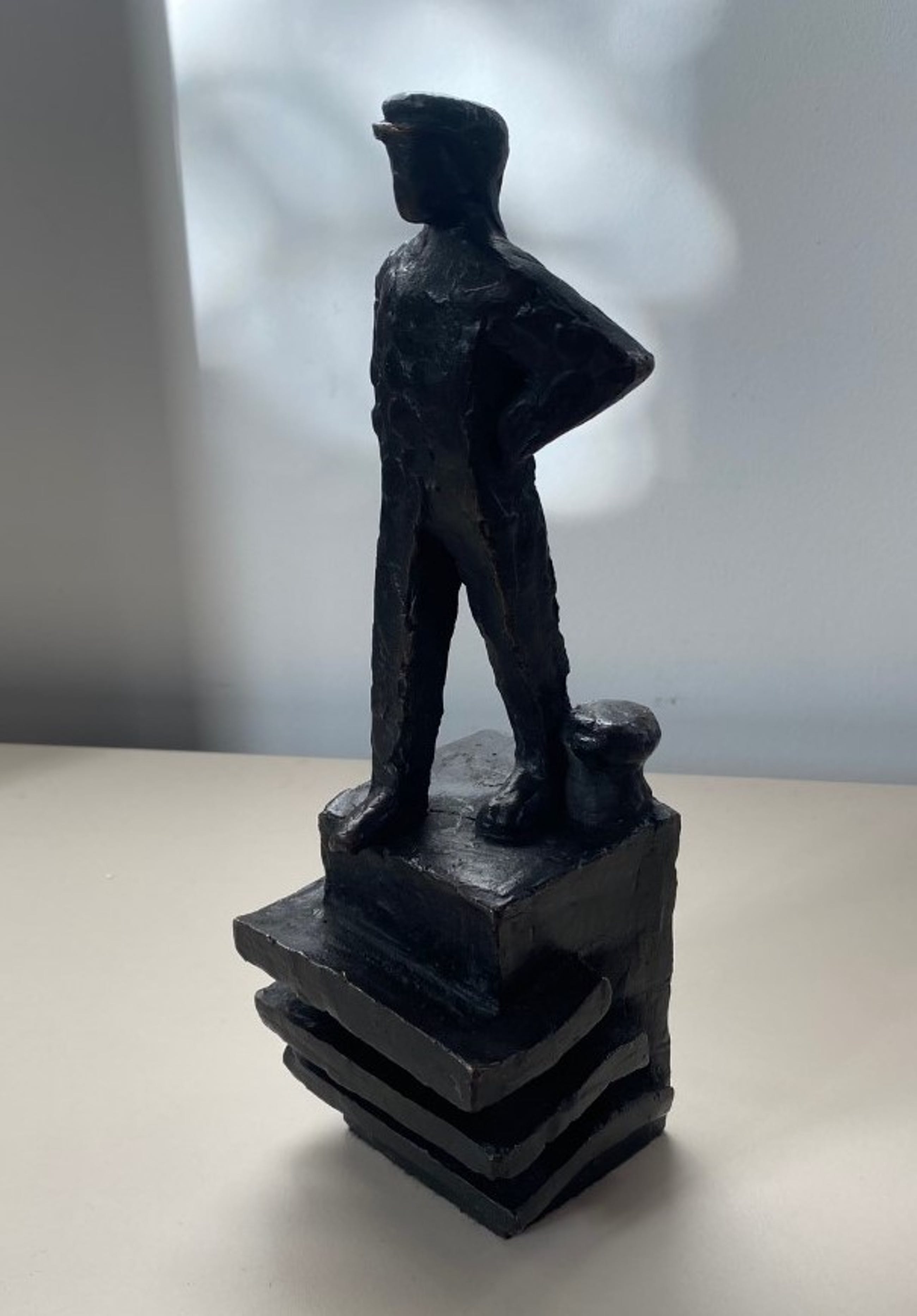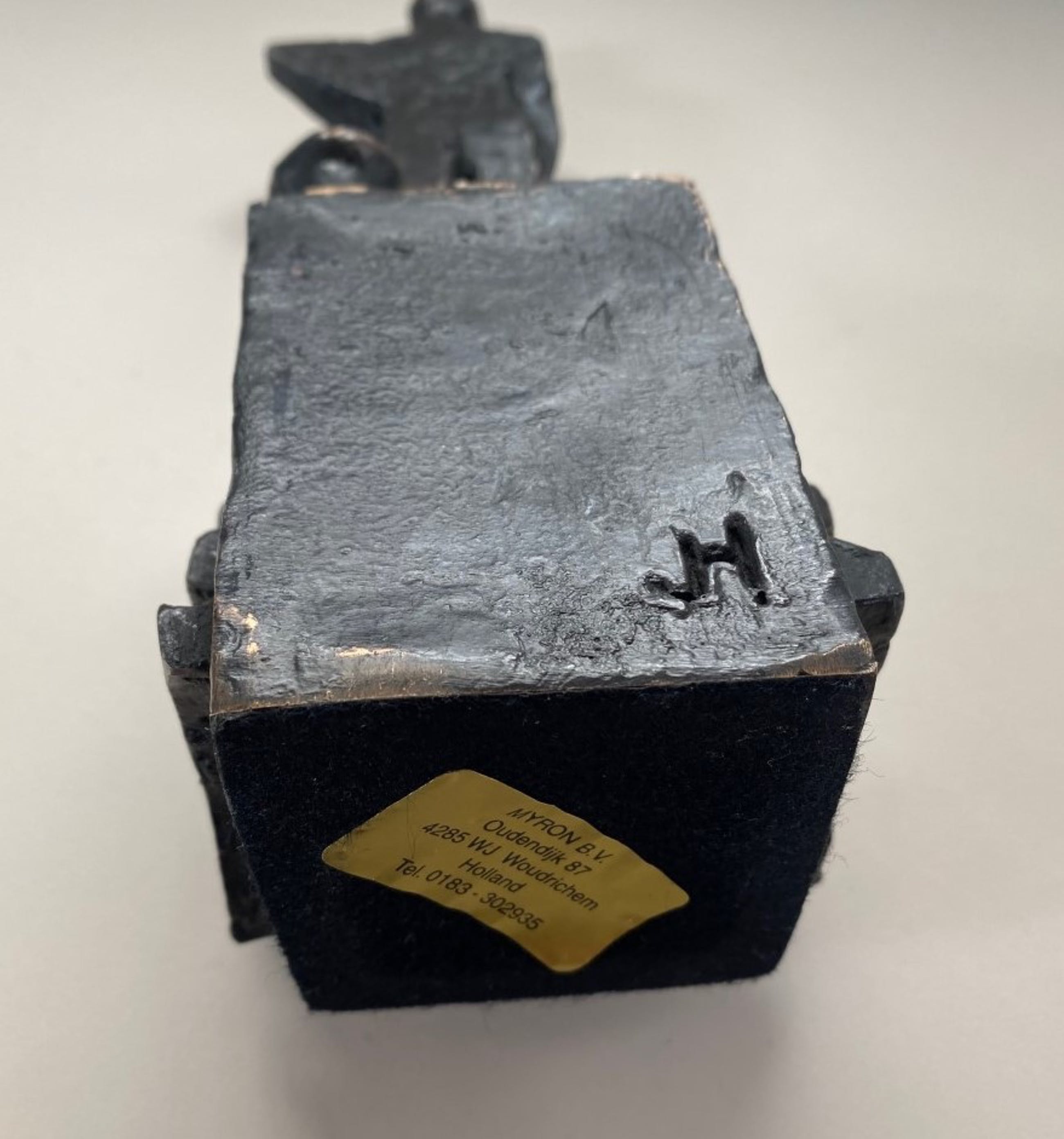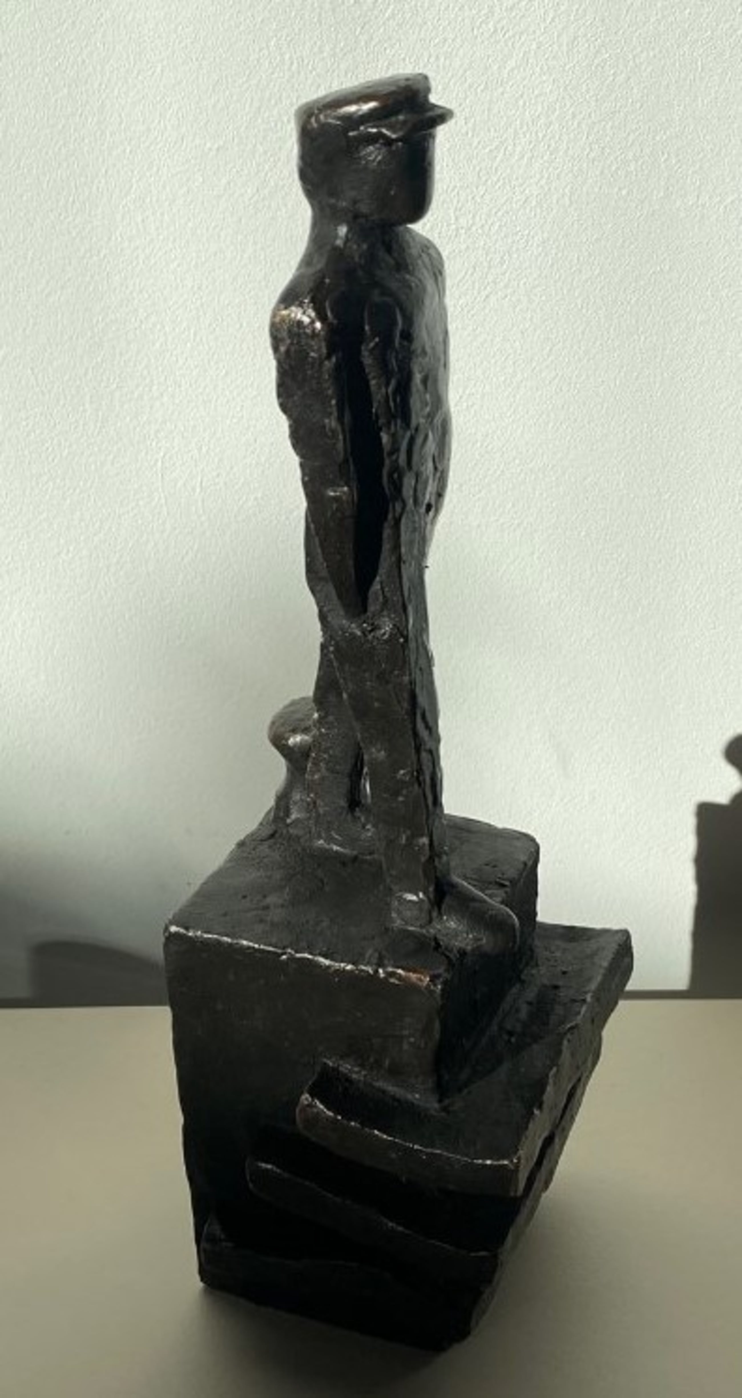 Mooi bronzen beeld van Jaap Hartman (1950): Binnenschipper. Gemaakt in een kleine oplage (ongeveer 15 stuks volgens de kunstenaar). Jaap Hartman is nog steeds actief als beeldhouwer en als bronsgieter. Dit beeld is in zijn eigen bronsgieterij gegoten. De sokkel is ook van brons.
