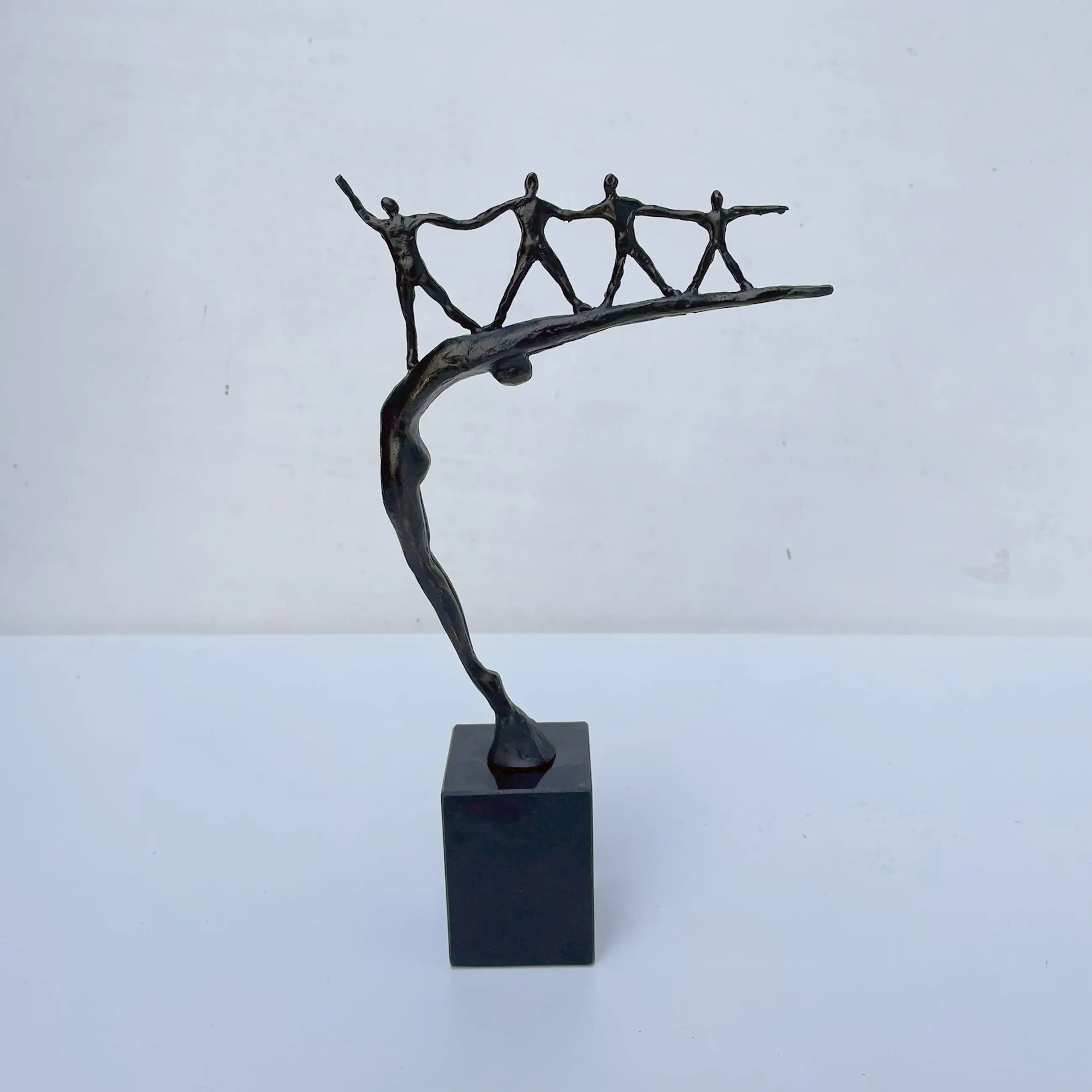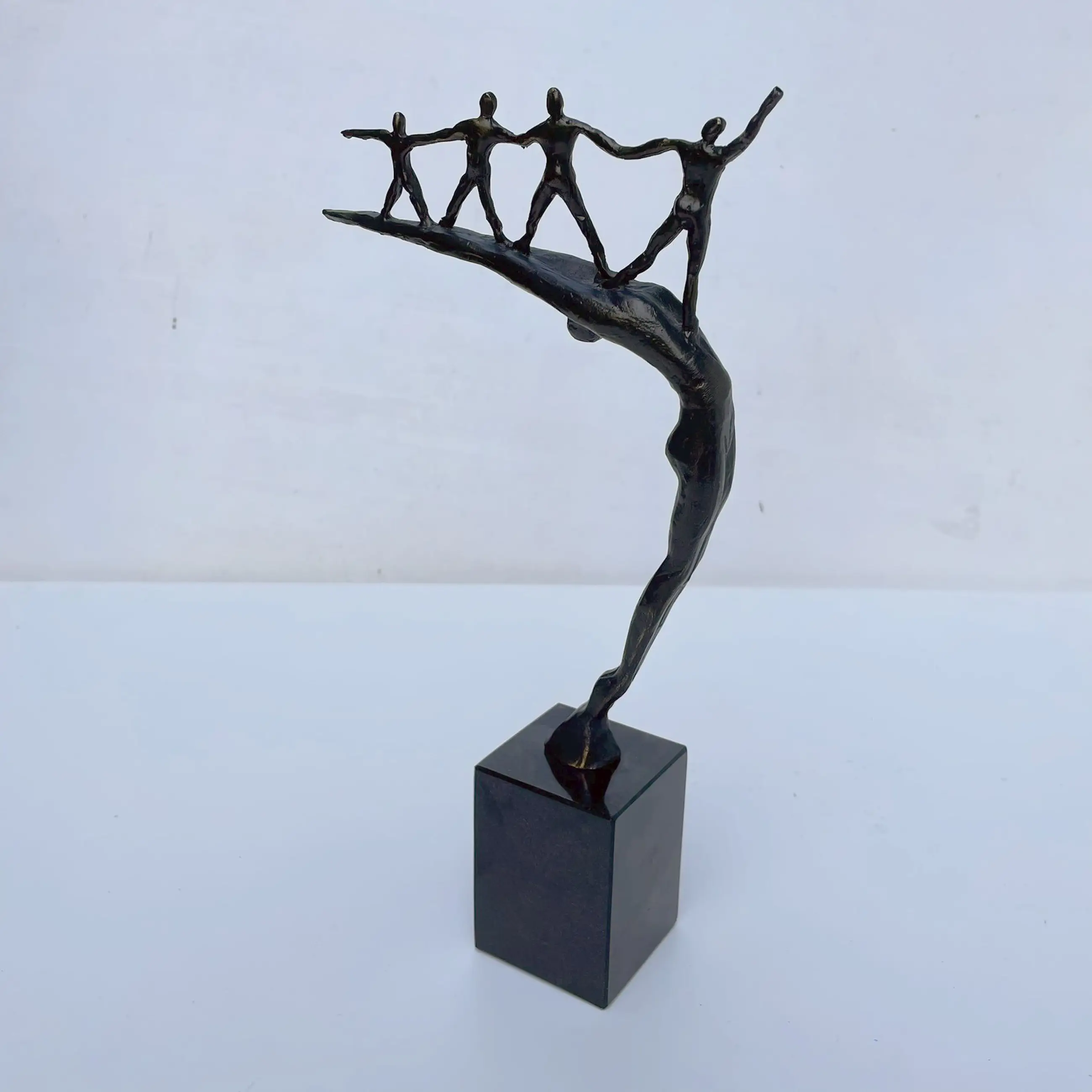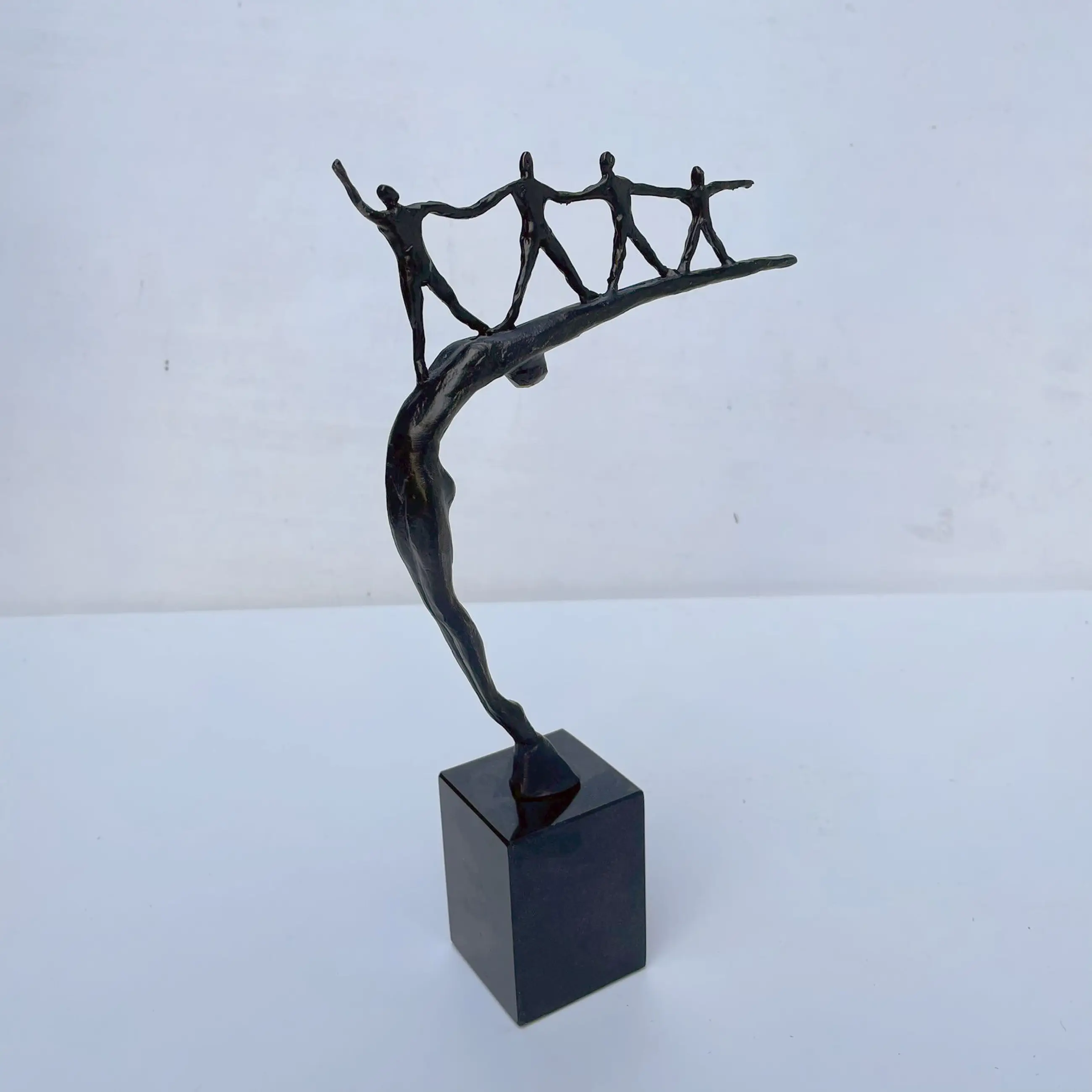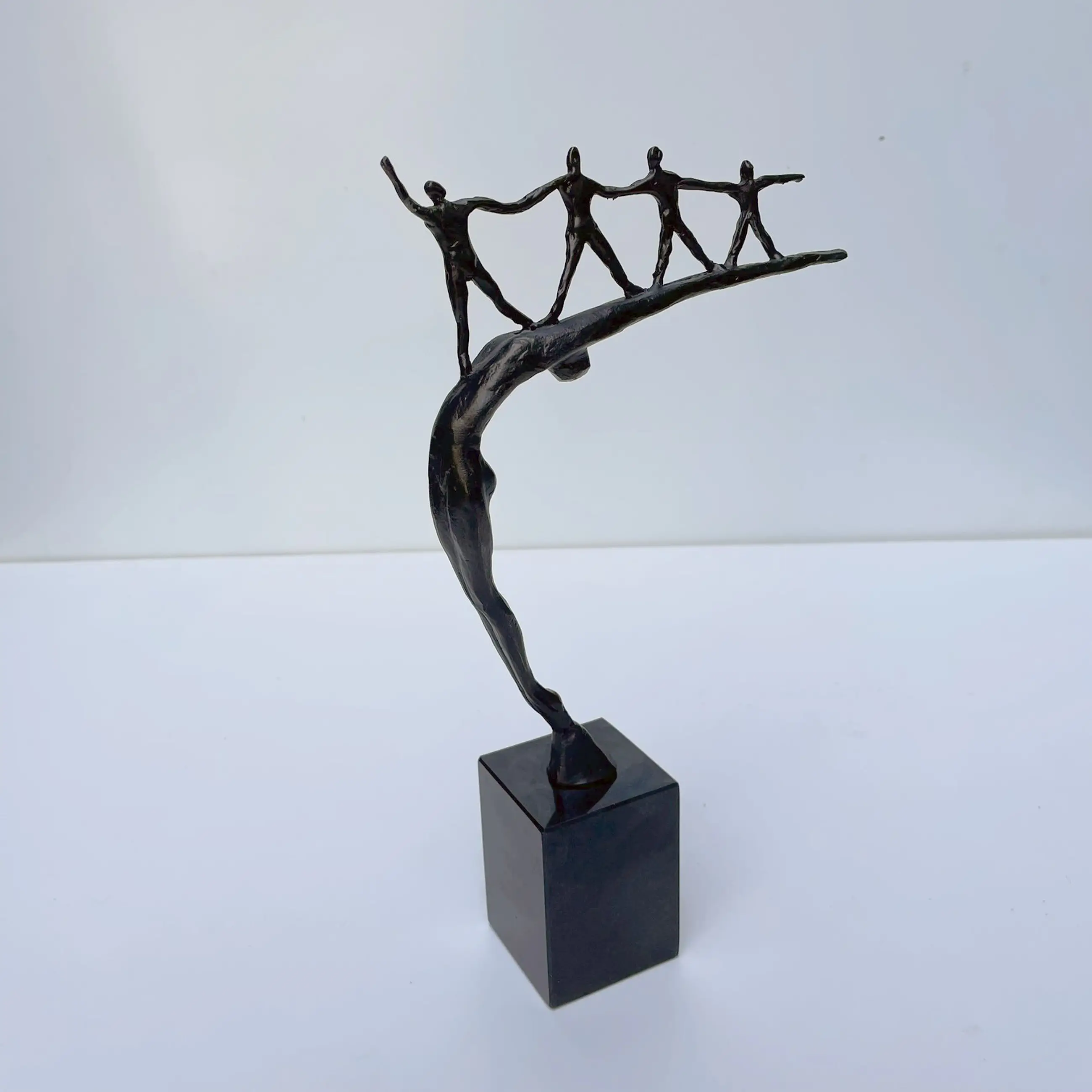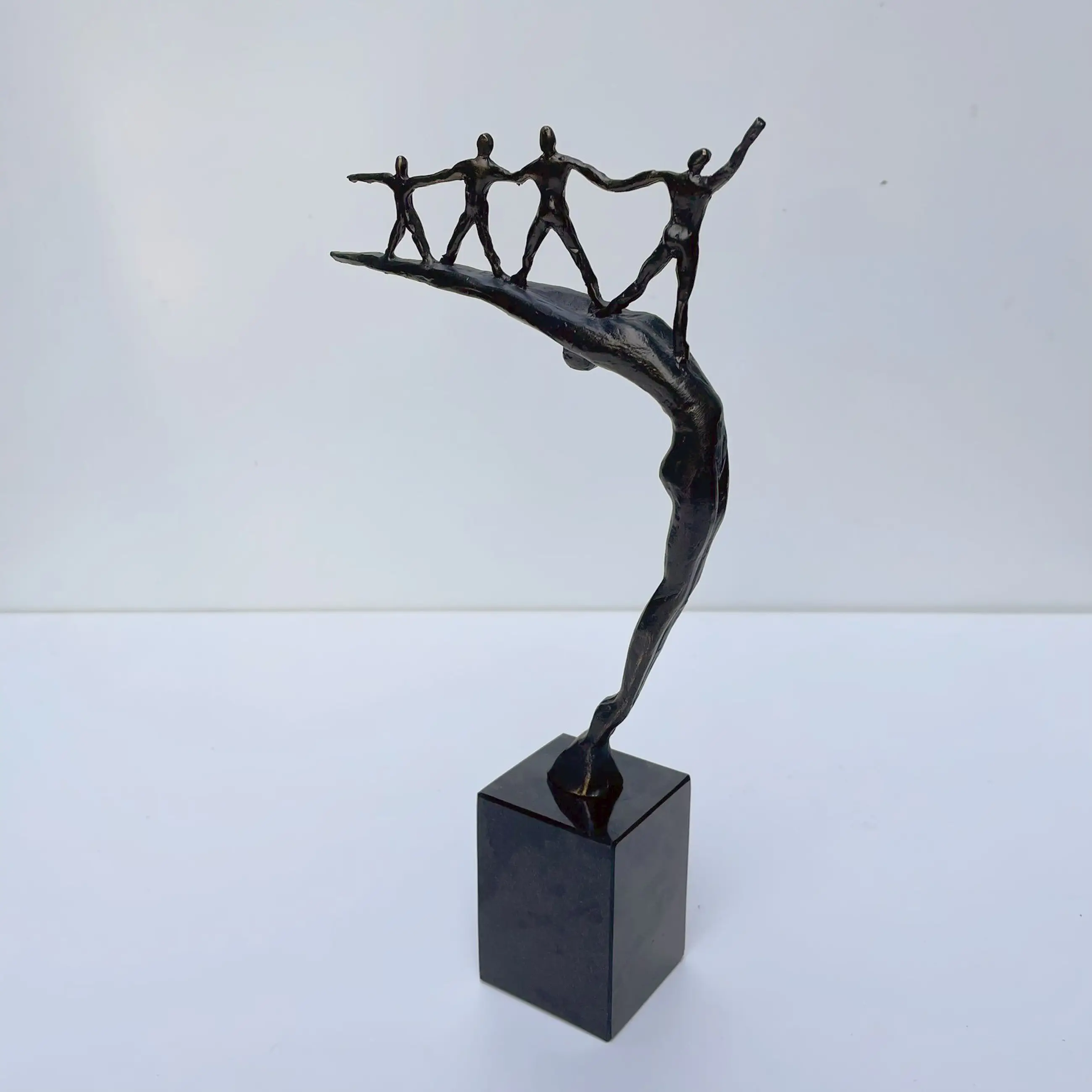 Mooie sculptuur van een naar achteroverleunende mensfiguur met daarop vier kleine figuurtjes, symboliserend: “ De ondersteuning “