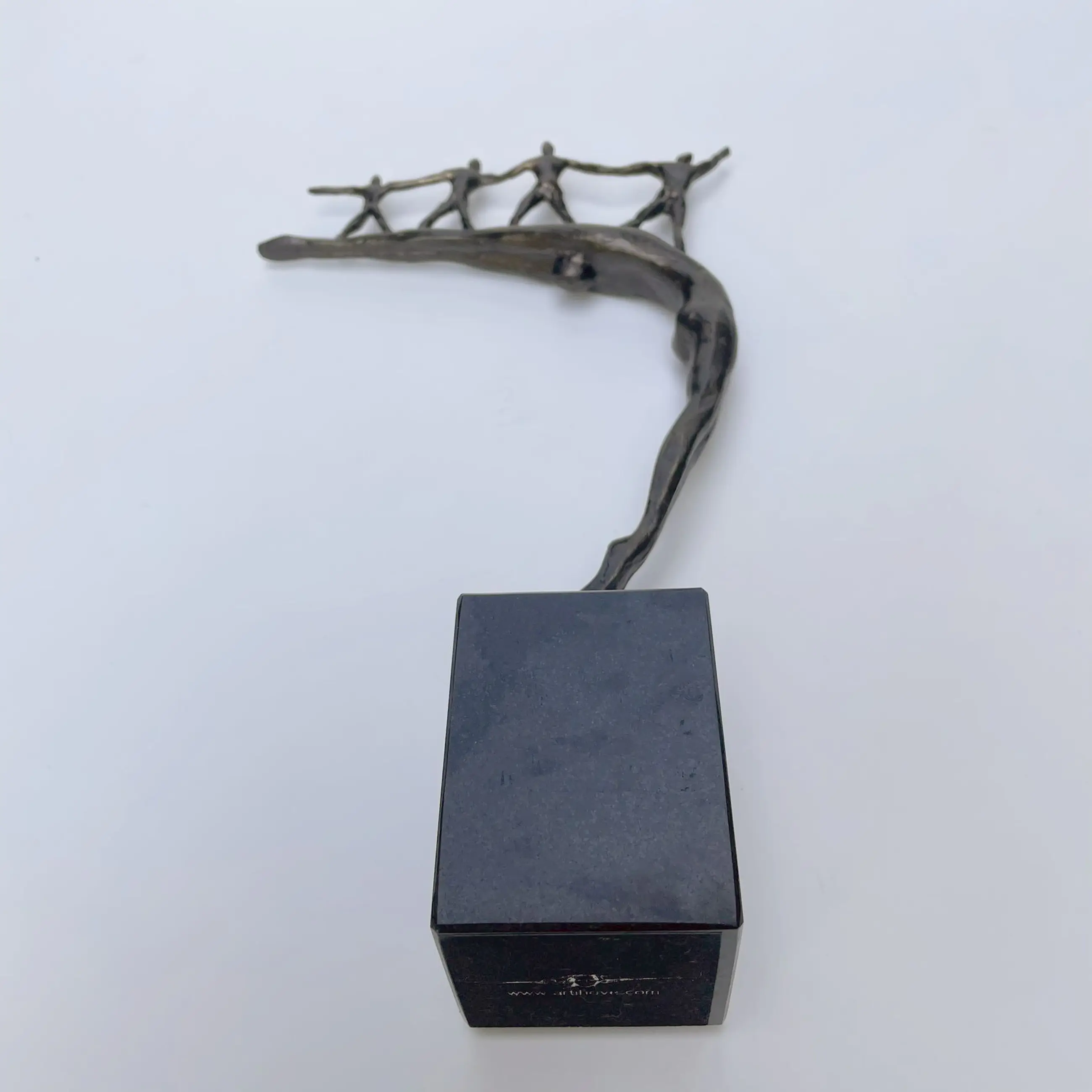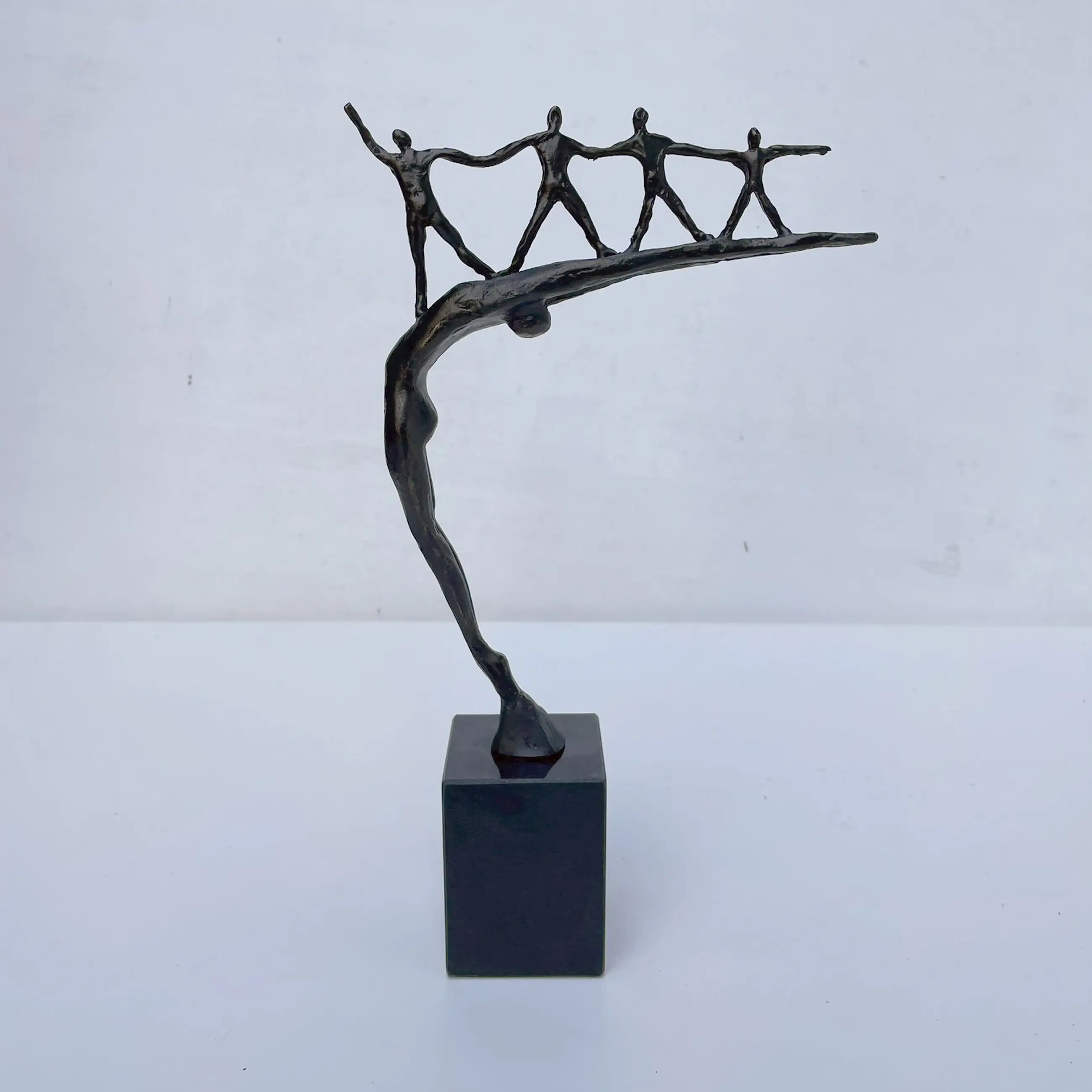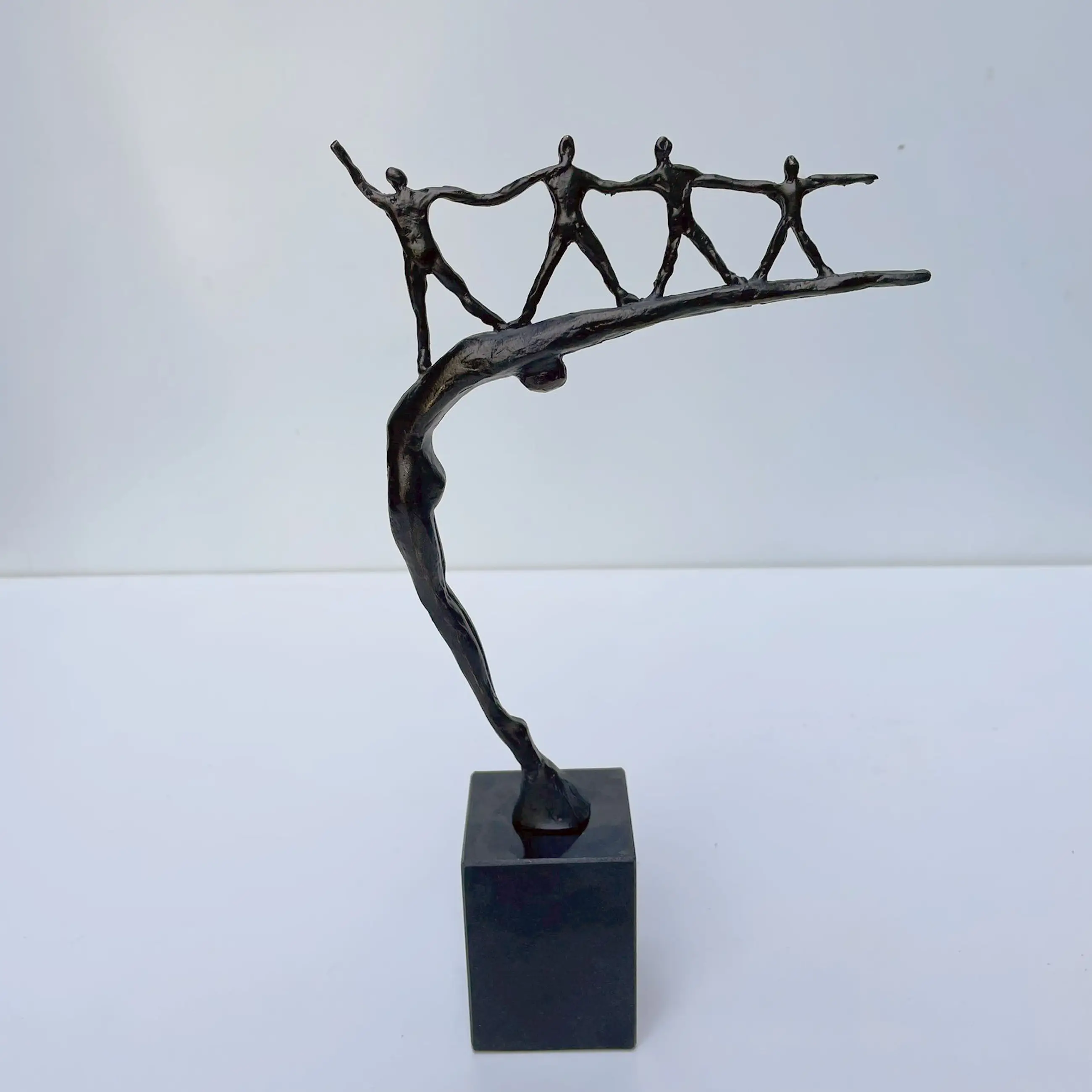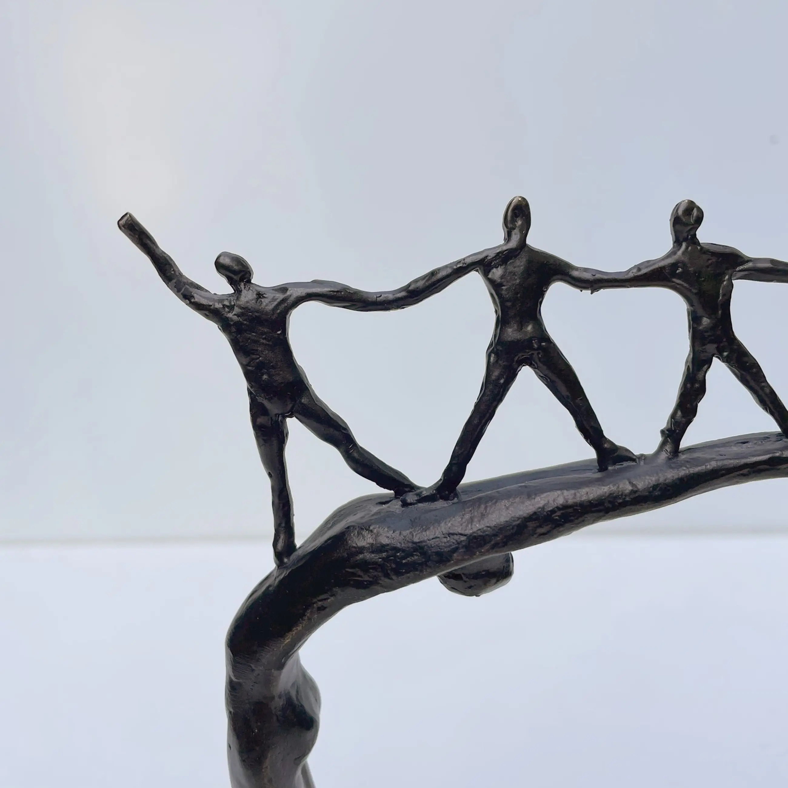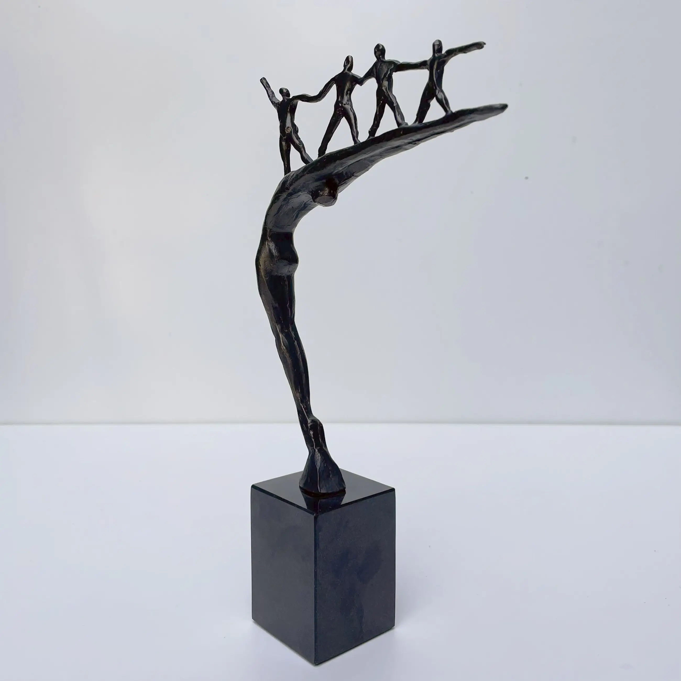 Mooie sculptuur van een naar achteroverleunende mensfiguur met daarop vier kleine figuurtjes, symboliserend: “ De ondersteuning “