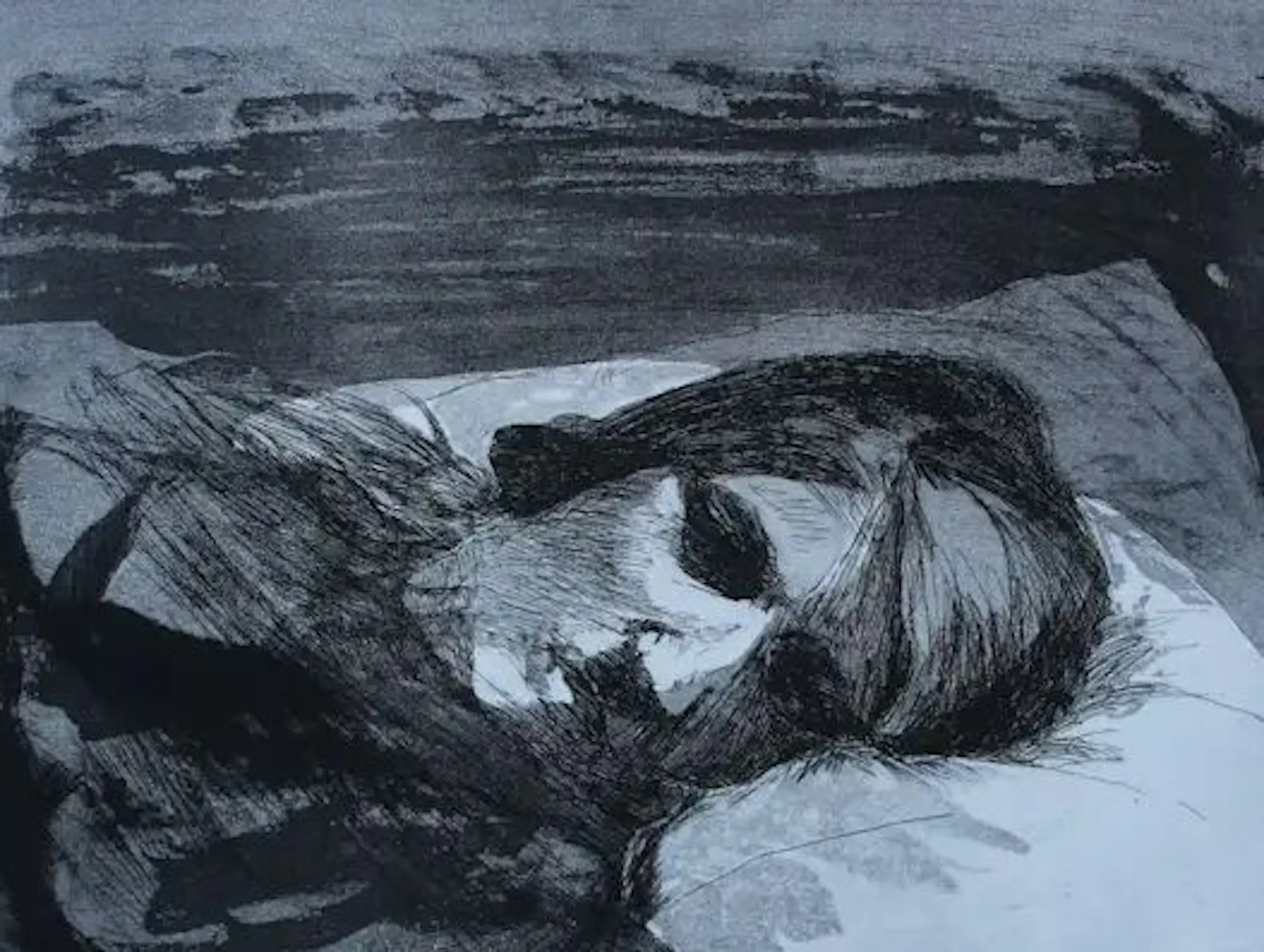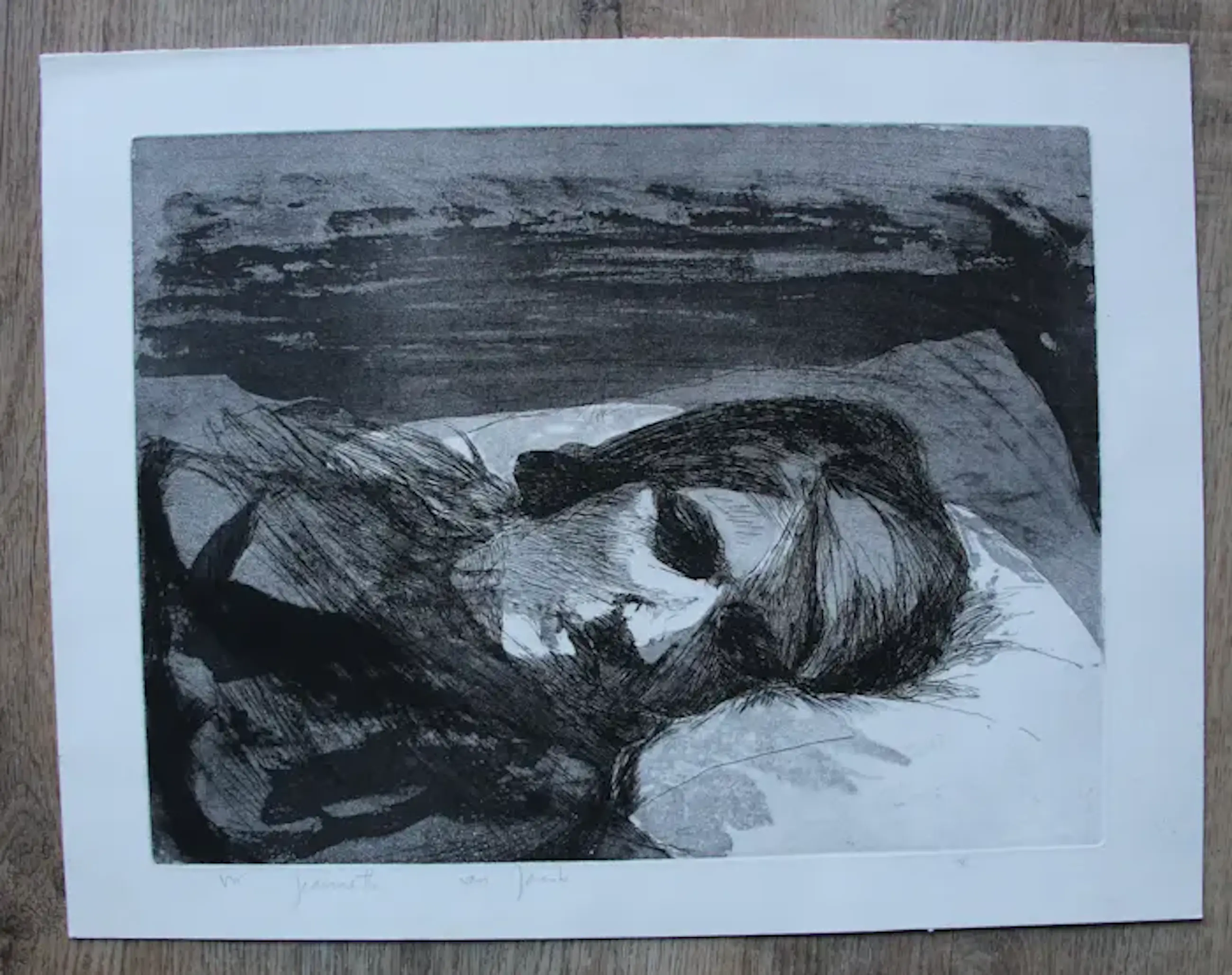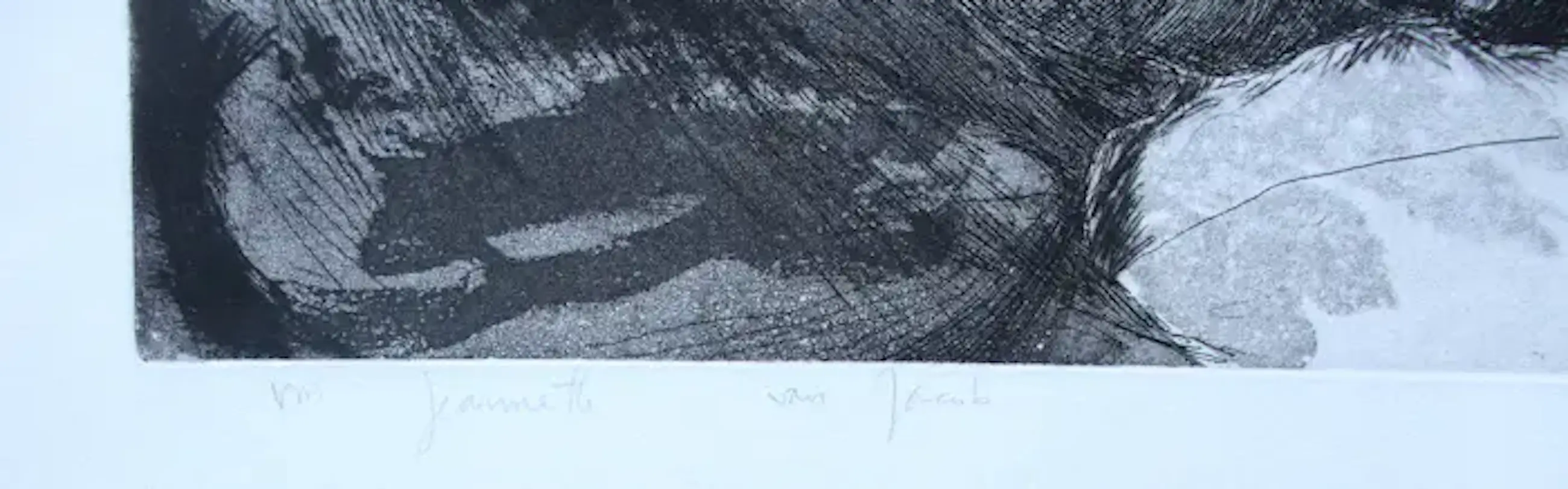Ets van Jaap Hillenius. Afmetingen blad: H36,5 xb47,5cm. Afmetingen voorstelling: H29,5 x b39,5cm. Het werk is links onder gesigneerd door de kunstenaar (voor Jeanette van Jacob). De authenticiteit van het aangeboden werk wordt volledig gegarandeerd. Een certificaat van echtheid kan, op aanvraag, worden gemaild.