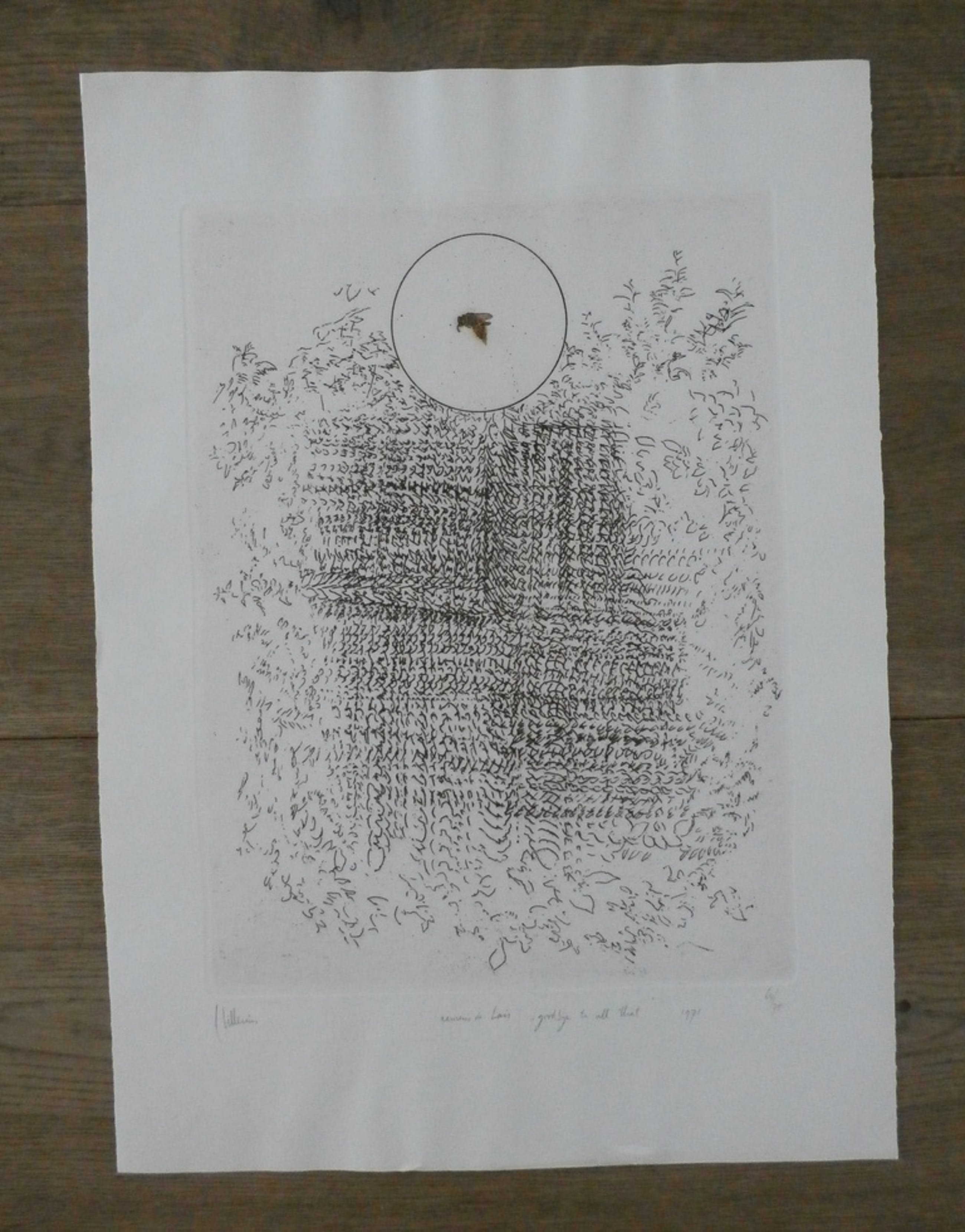 Litho van Jaap Hillenius uit 1971. Nummer 64/75. Titel: Namens de Luis "goodbye to all that". Afmetingen blad H44.5 x b32. Afmetingen voorstelling H32 x b23.5. De authenciteit van het aangeboden werk wordt voor 100% gegarandeerd. Een certificaat van echtheid kan, op aanvraag worden meegestuurd. Conditie: In goede staat.