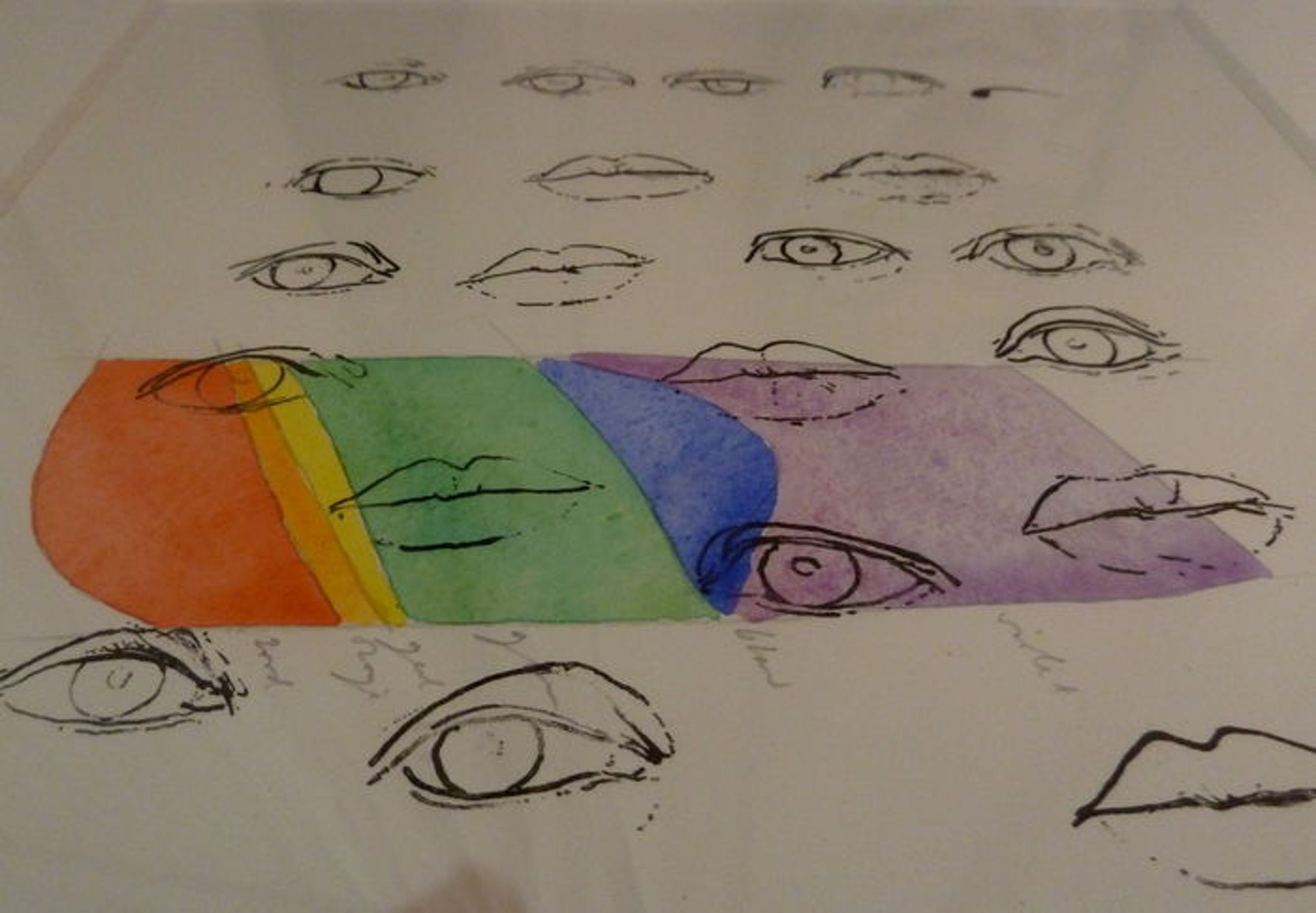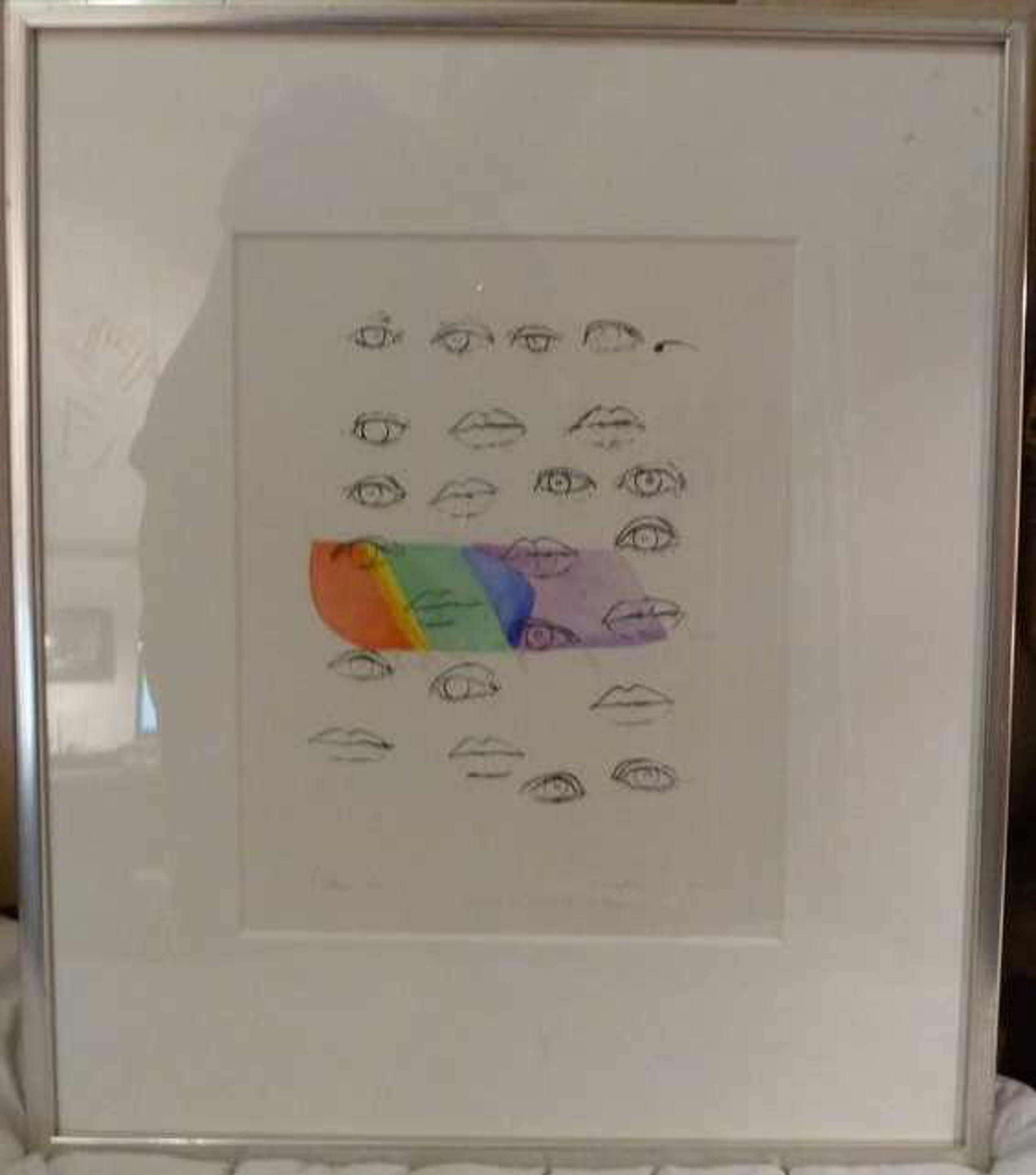 Deze dubbel druk, een aquarel uit 1980 waarin hij later met het licht dat door een prisma viel alle kleuren op een blanco vel in zijn atelier in Loenen aan de Vecht waar hij een loods huurde sinds begin jaren 60 van architect Aldo van Eyck. In deze loods stond een oude pers uit 1881 . Later in 1992 heeft hij de Litho gemaakt met de ogen en monden, die is uiteindelijk gedrukt over de kleurboog.