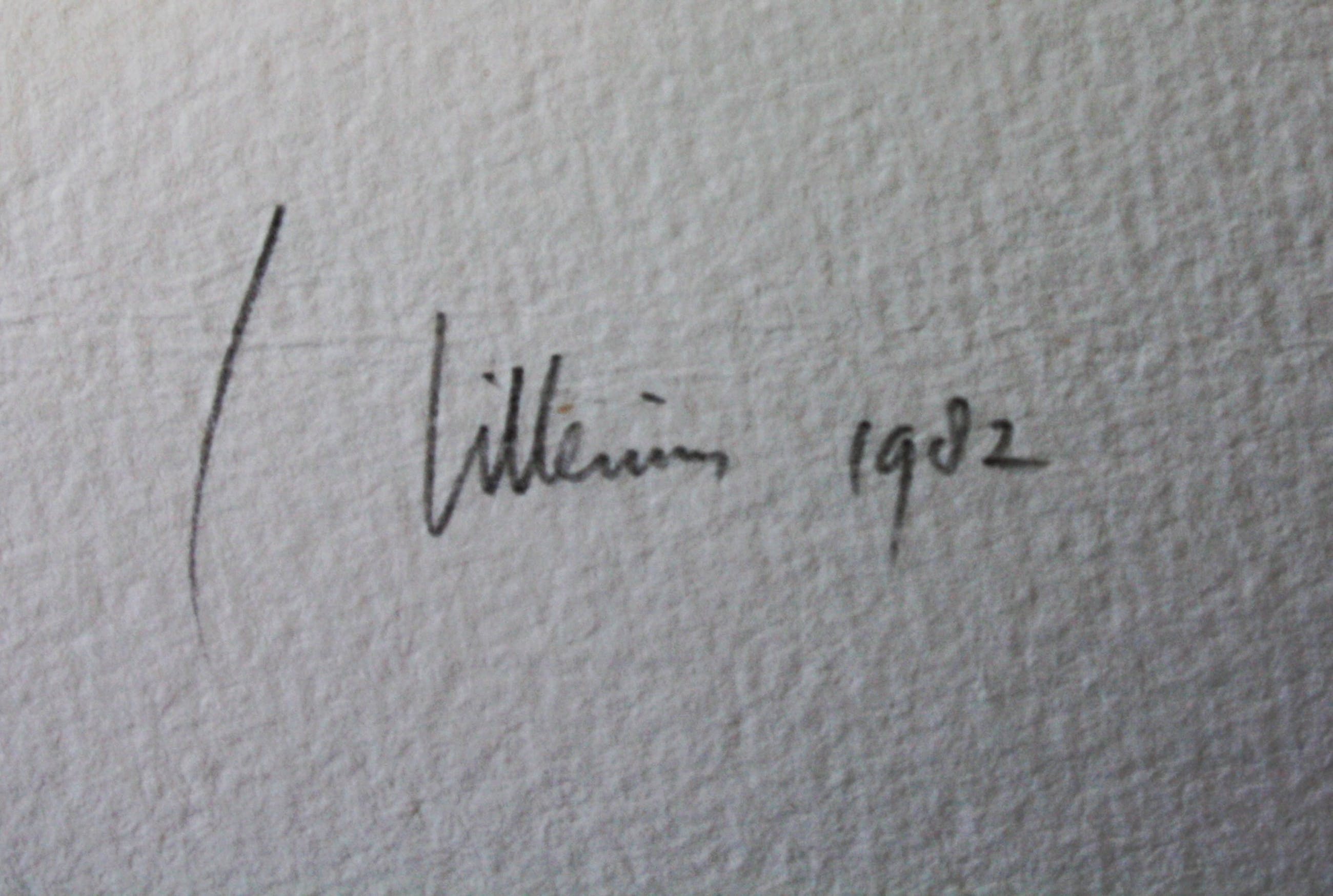 Poging om dichterbij te komen - ets/aquarel - 1980/1991 Er staat met potlood "Poging om dichterbij te komen " . Het werk zit in een strakke zilverkleurige lijst. Jaap Hillenius hield zich bezig met de mens en de natuur,werkte altijd met daglicht. Schatting expert€ 450 - € 650 De tekening is op een Litho steen getekend met zwarte inkt en later geprint over het aquarel heen.
