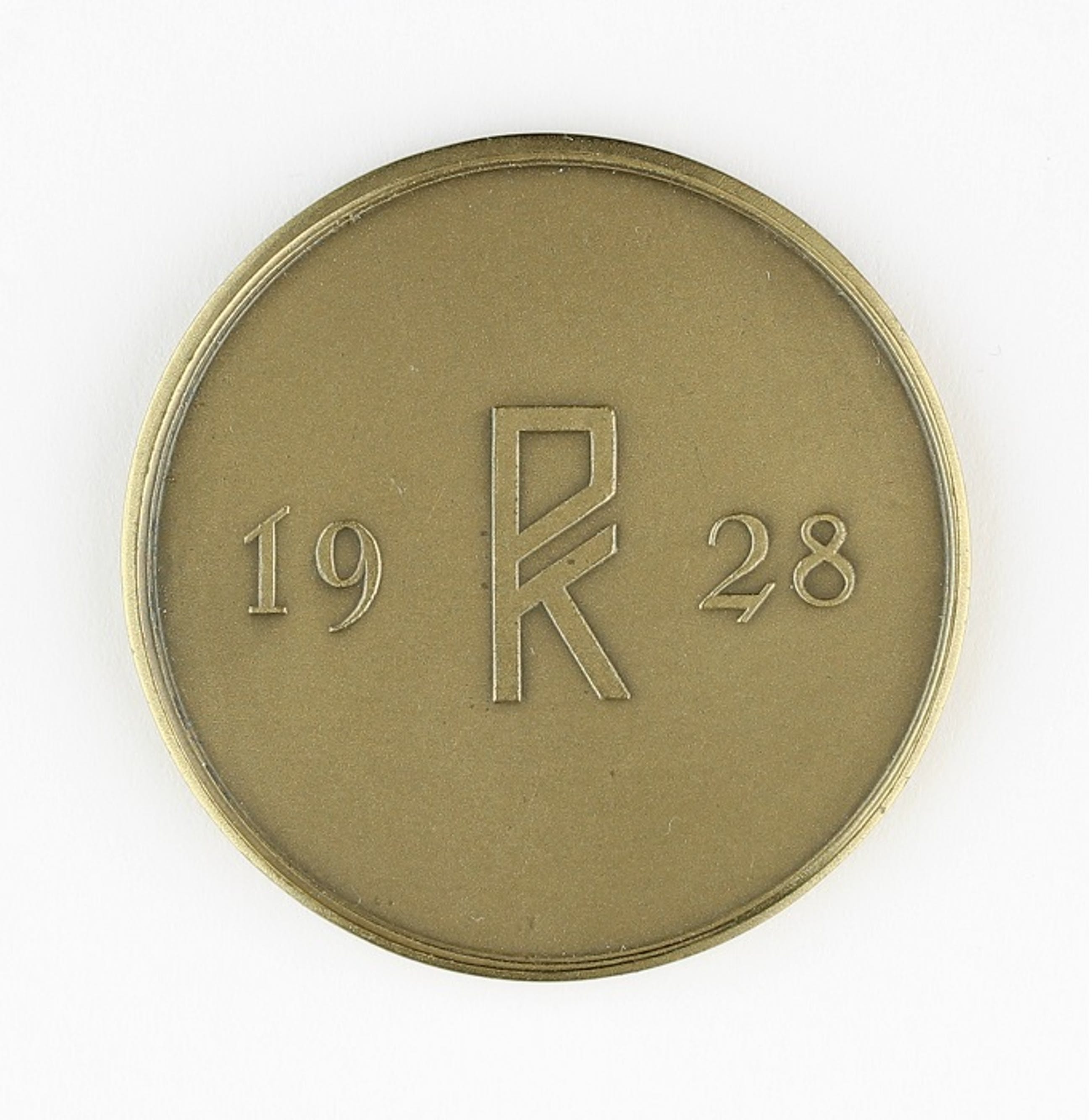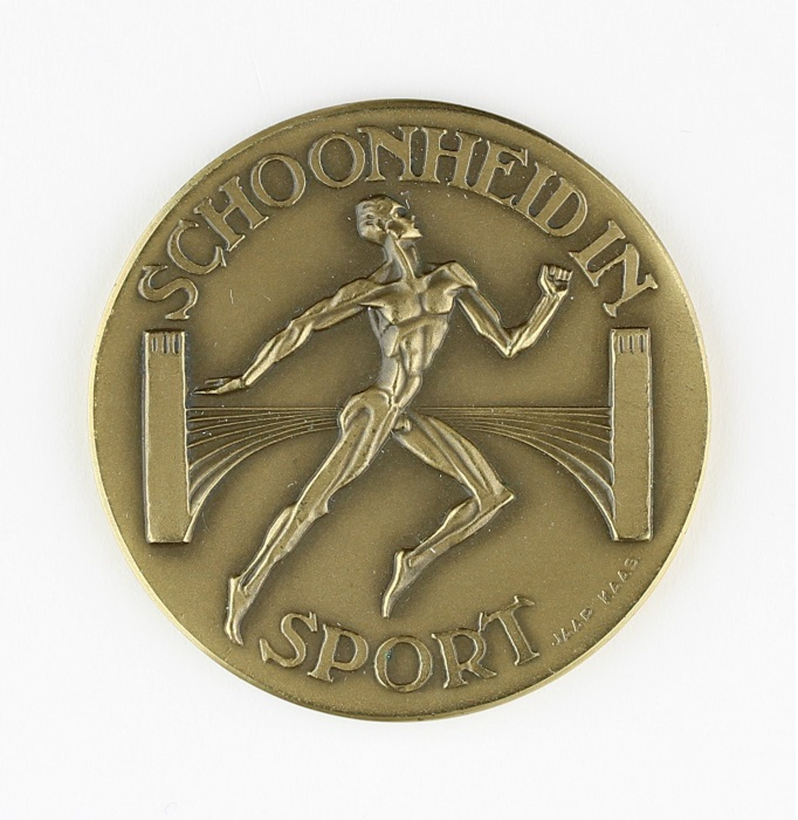De beeldhouwer en tekenaar Kaas, leerling van Bronner heeft zich vooral toegelegd op dierfiguren, een genre dat opgekomen is in de 19-de eeuw. Hij gaf die belangstelling door aan zijn leerling, de beeldhouwer Arie Teeuwisse. Het is onwaarschijnlijk dat opdrachtgever of ontwerper, die net van de Rijksakademie kwam, echt gelukkig is geweest met de penning 'Schoonheid in sport': een hardloper in een gestileerd stadion. De hardloper zelf is ook gestileerd en heeft de nadrukkelijke spieren en pezen die populair waren bij de expressionisten van de Amsterdamse School. De keerzijde is doodsaai: het hoekige en stijve monogram van de Vereniging op een kaal fond met het jaartal 1928. Voor een tijdgenoot was de betekenis van deze penning duidelijk: in 1928 werden de Olympische Spelen in Amsterdam gehouden. #Louk Tilanus, Handzame Sculptuur