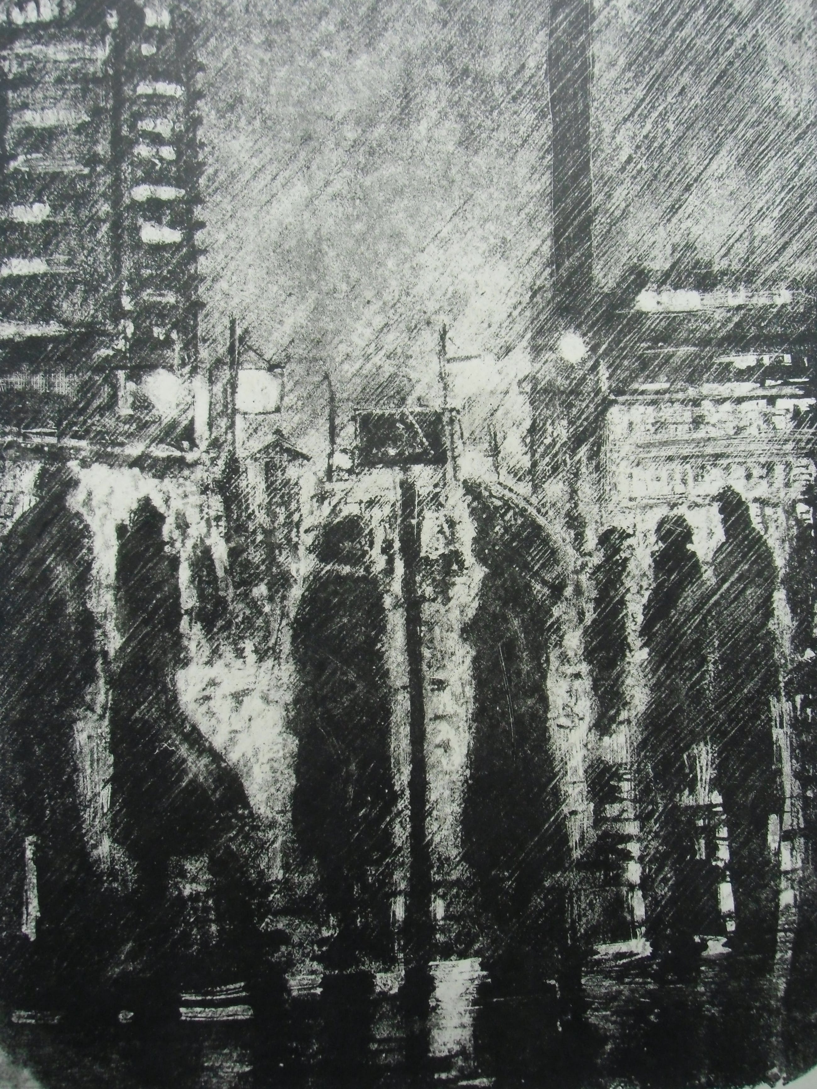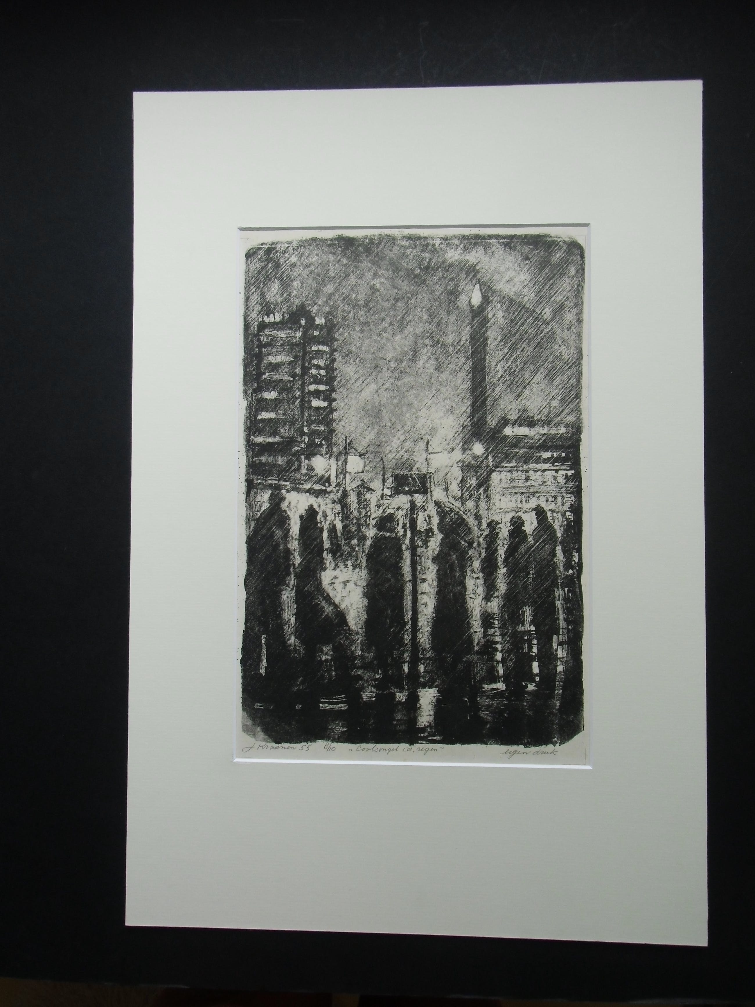 Litho met de dynamiek van een herfstavond aan de Coolsingel in de vijftiger jaren van de vorige eeuw. Gesigneerd en betiteld met potlood. Kleine oplage en eigen druk. Zeer goede conditie.