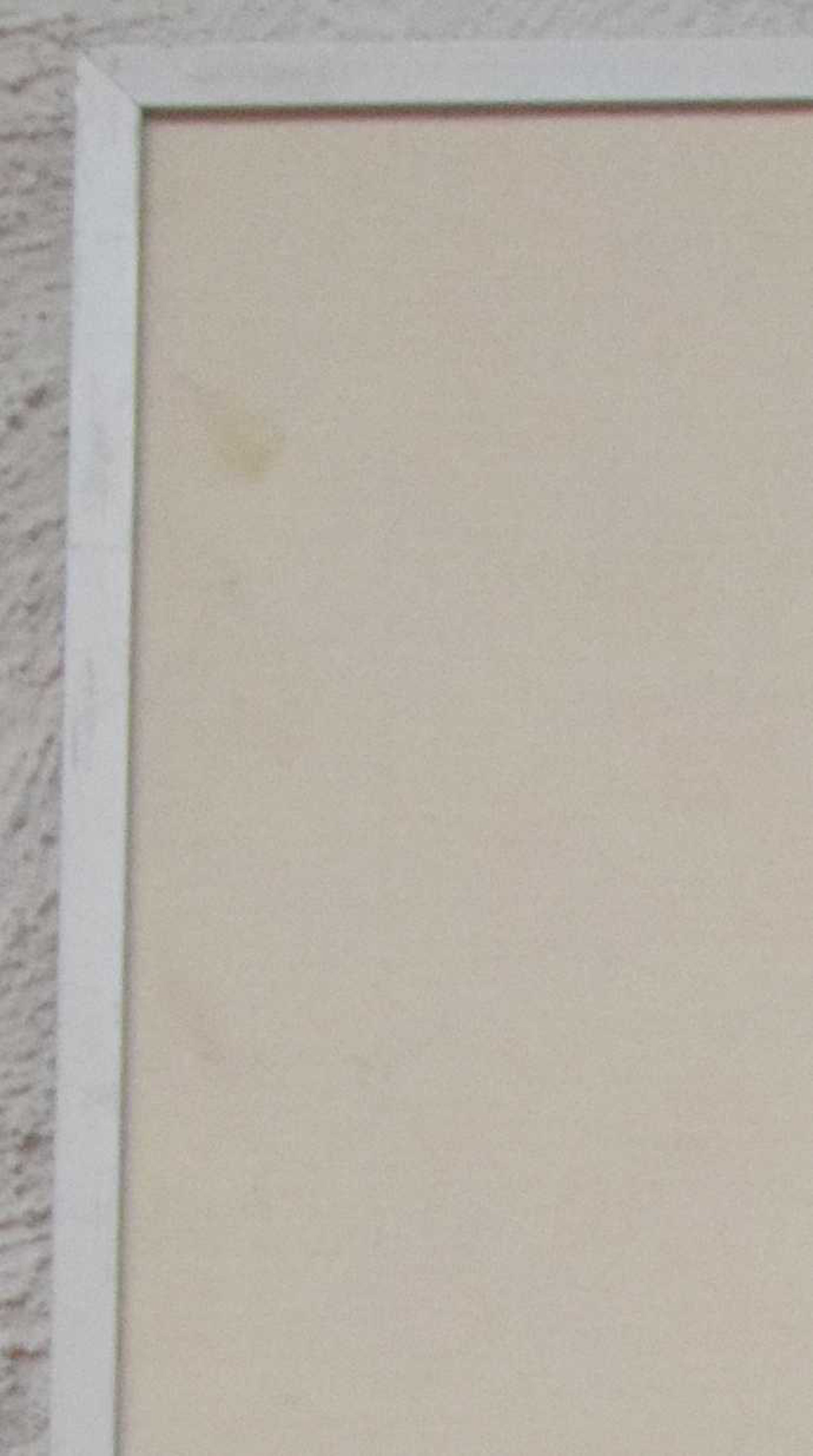 | Het blad is vergeeld en de glasplaat is uit de lijst verwijderd. Het werk is opnieuw ingelijst door de vorige eigenaar. Er is een SZ-nummer op de voorzijde met potlood aangebracht. Daarbij heeft het passe-partout vingerafdrukken op de boven- en linker zijde | |
