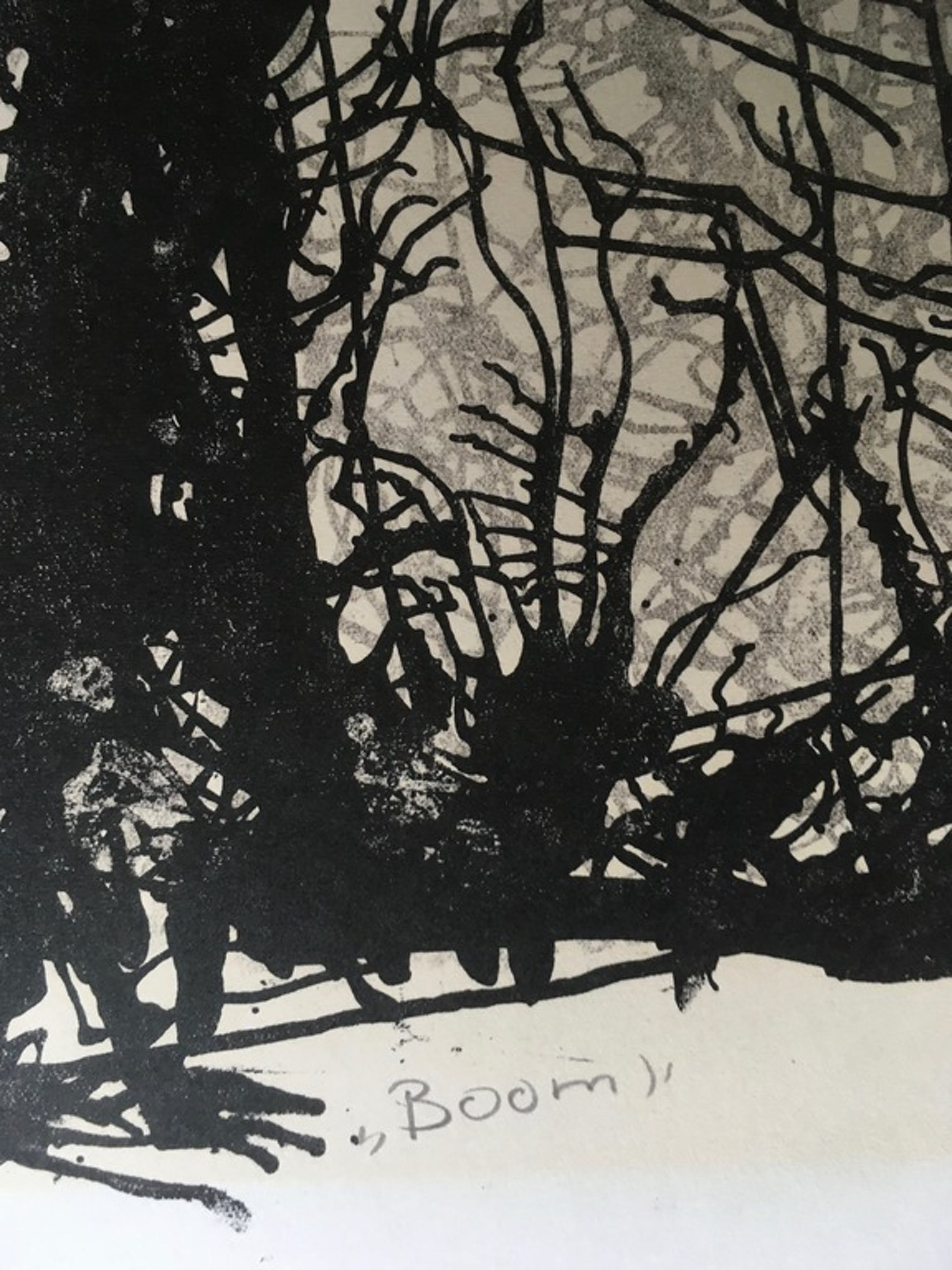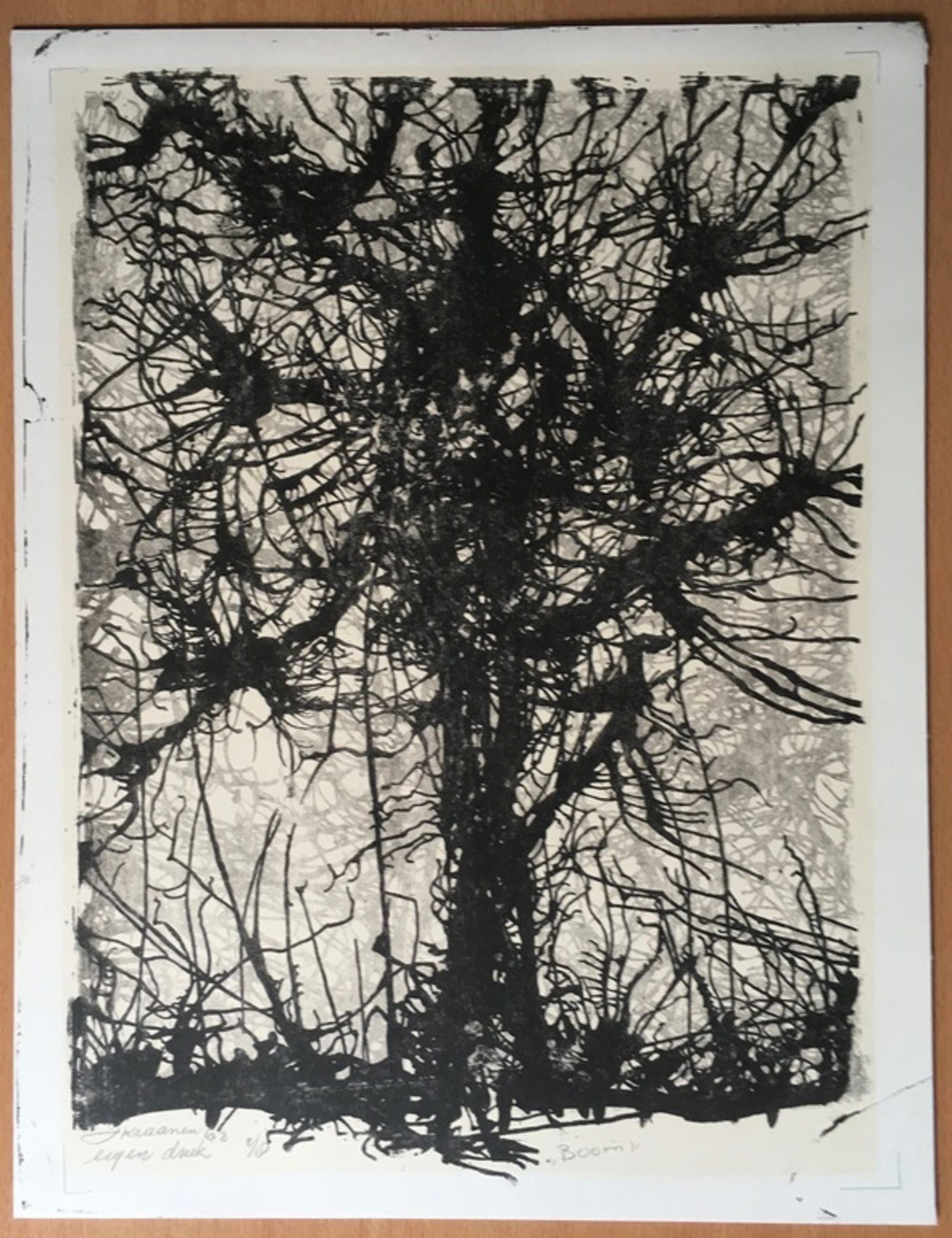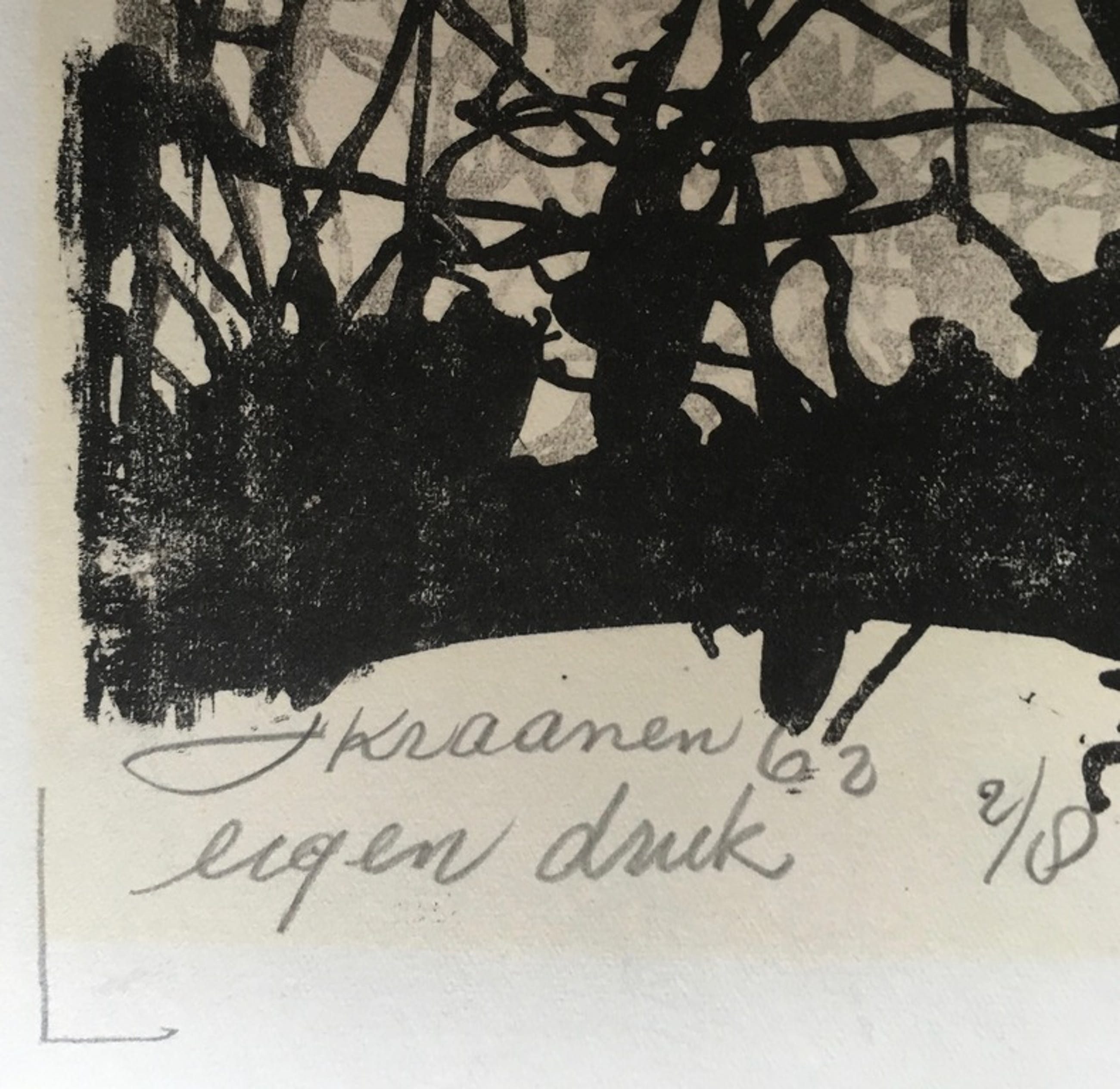 Volledig blad stevig papier (48,5 x 37 cm.), beeld: 45 x 33 cm., in goede staat, gesigneerd, getiteld en genummerd onder in potlood: 'J Kraanen 62 eigen druk 2/8' en "Boom".
