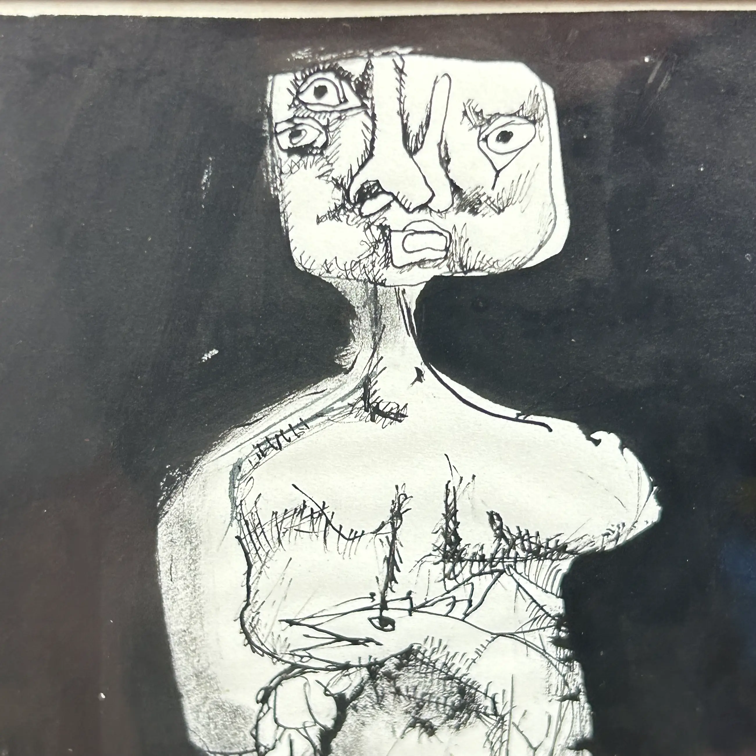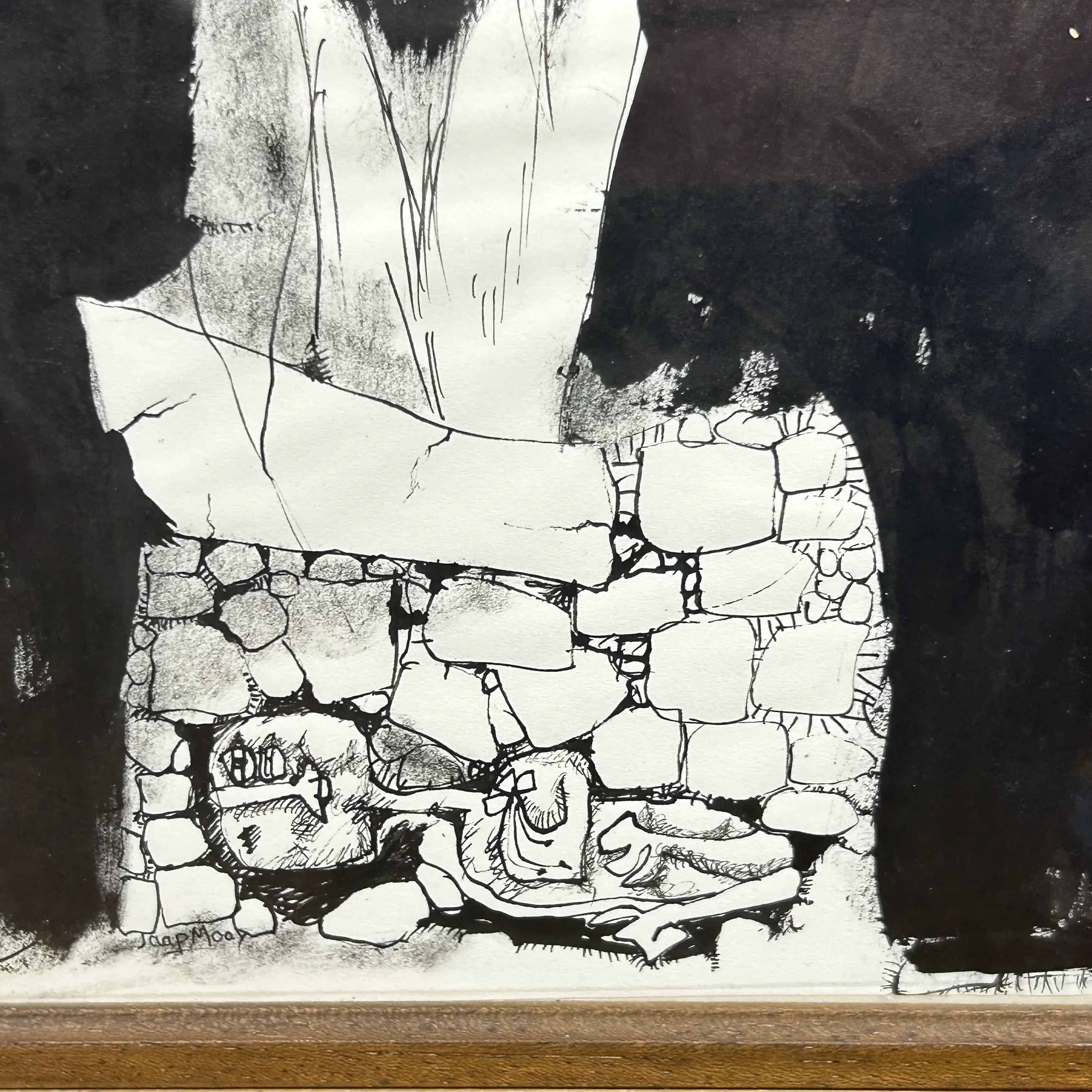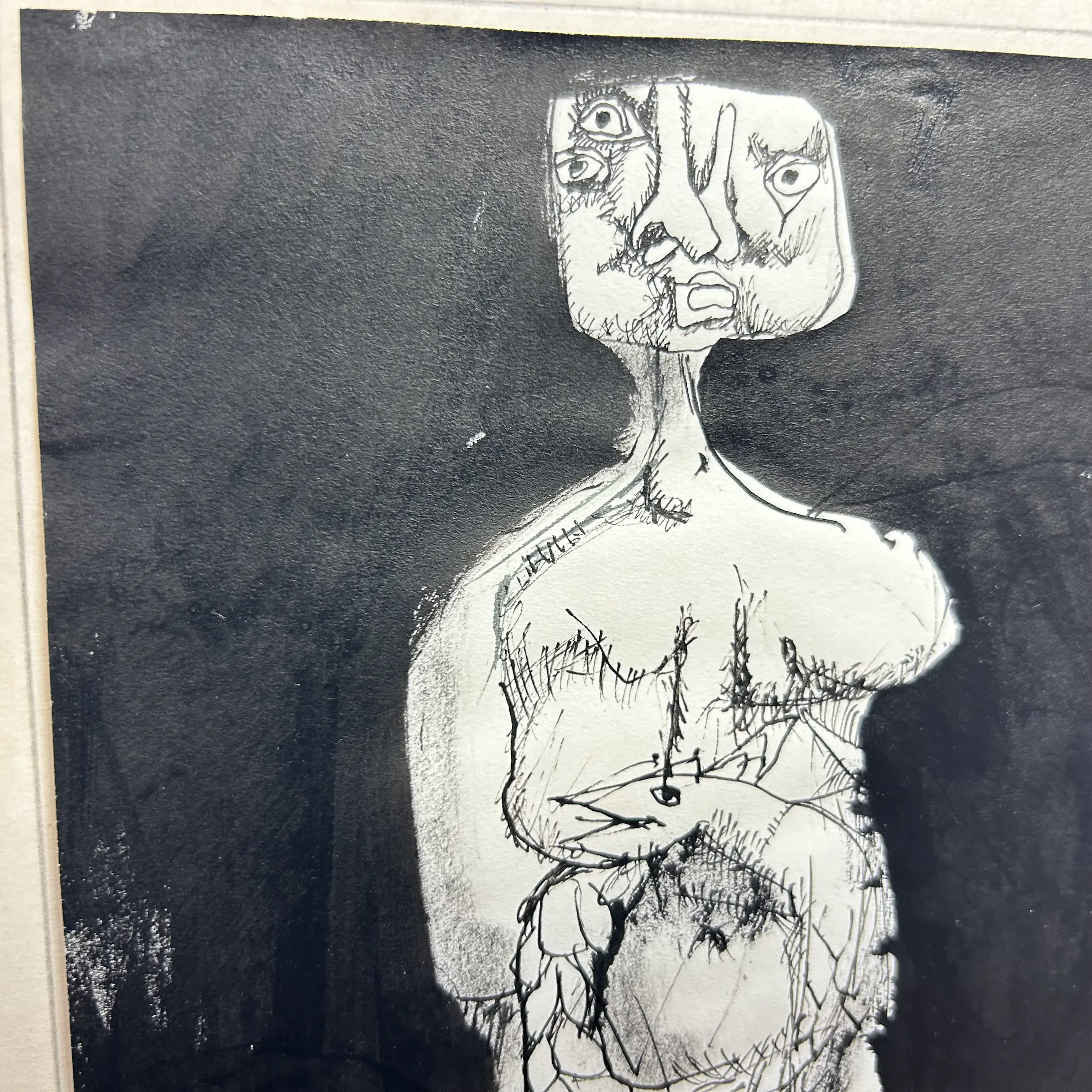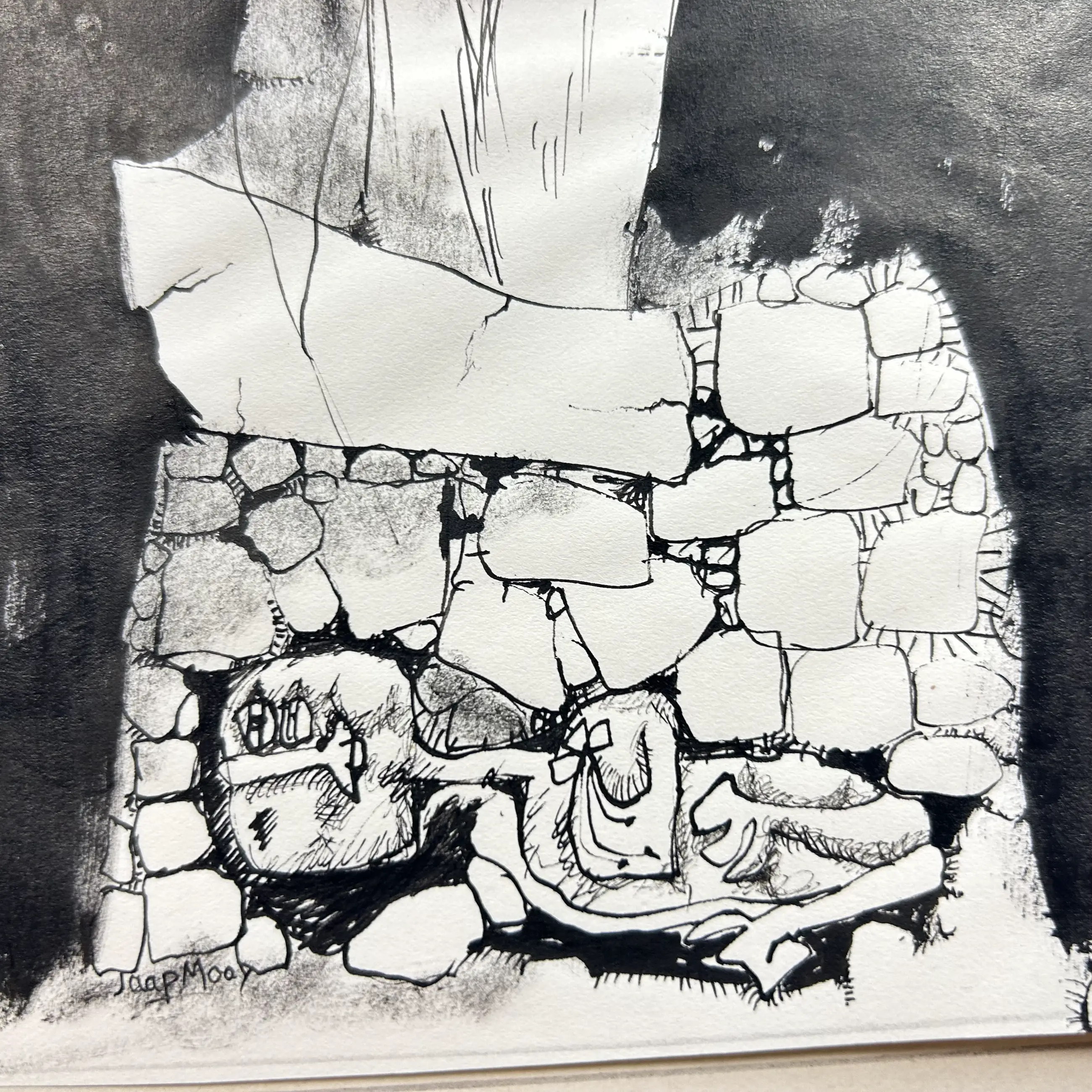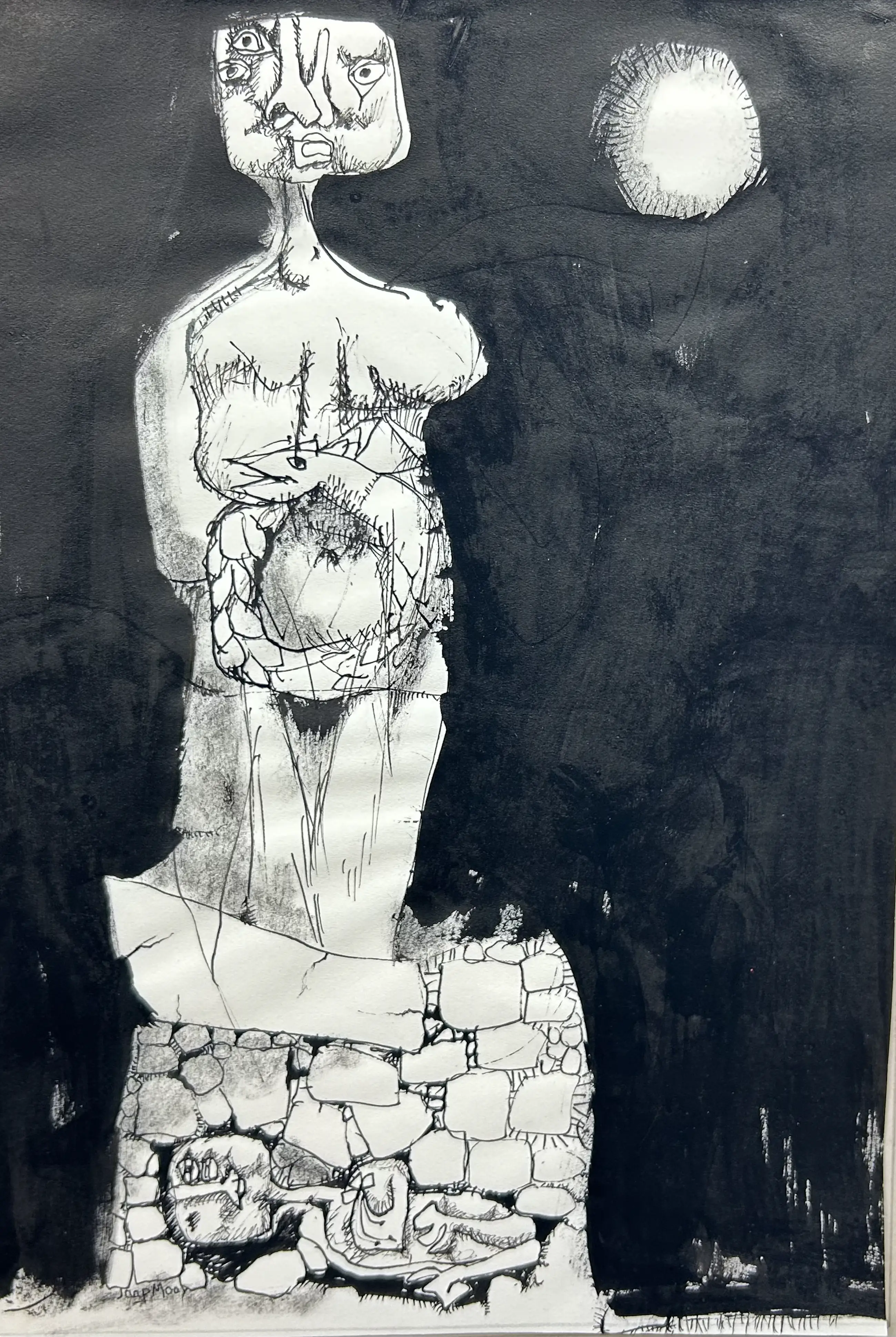 Een originele pentekening van de Bergense kunstenaar Jaap Mooy (1915-1987) (géén herdruk) surrealistisch beeld van een standbeeld achtig figuur met een slang / serpent om zijn middel en een verborgen figuur verstopt in de fundering van het beeld.
