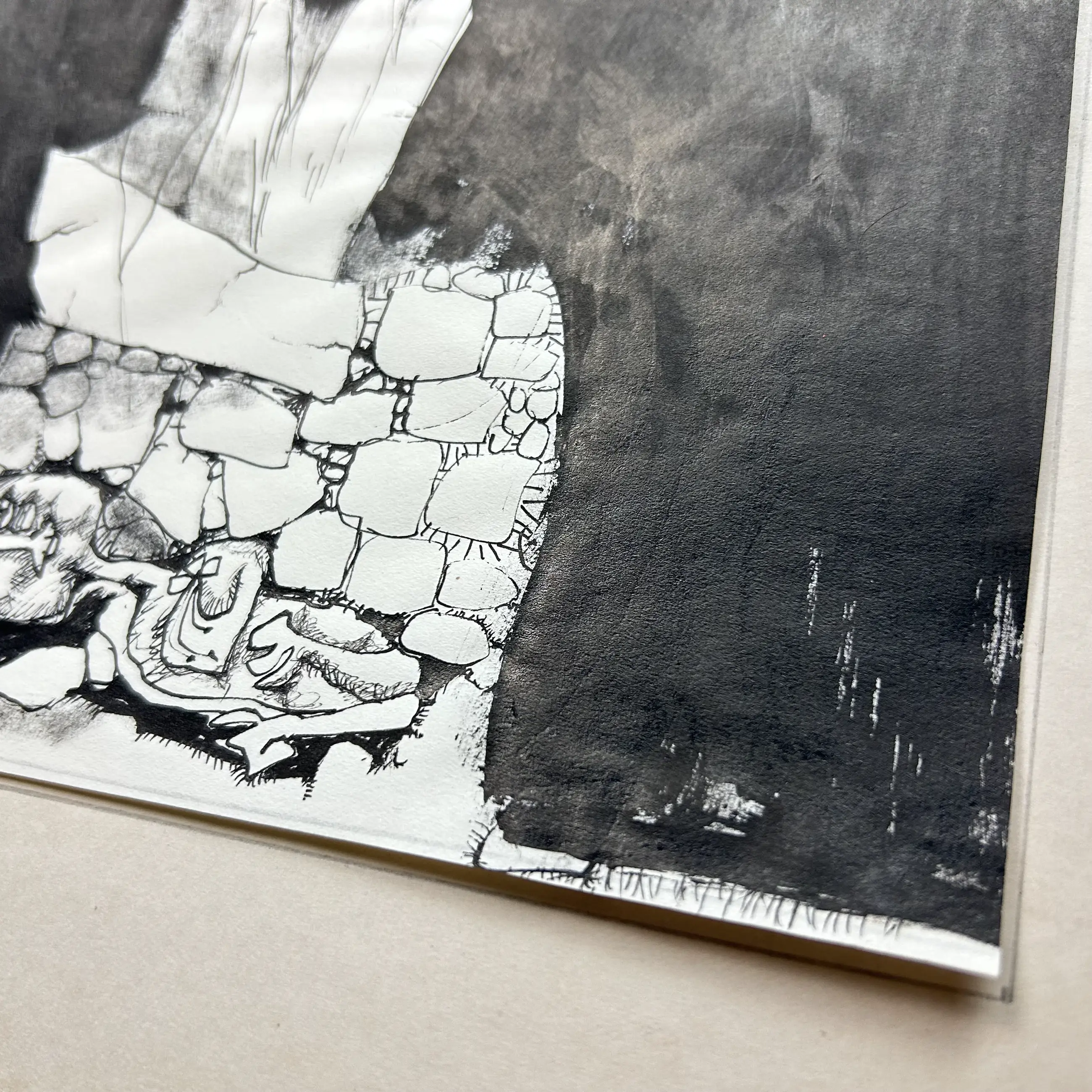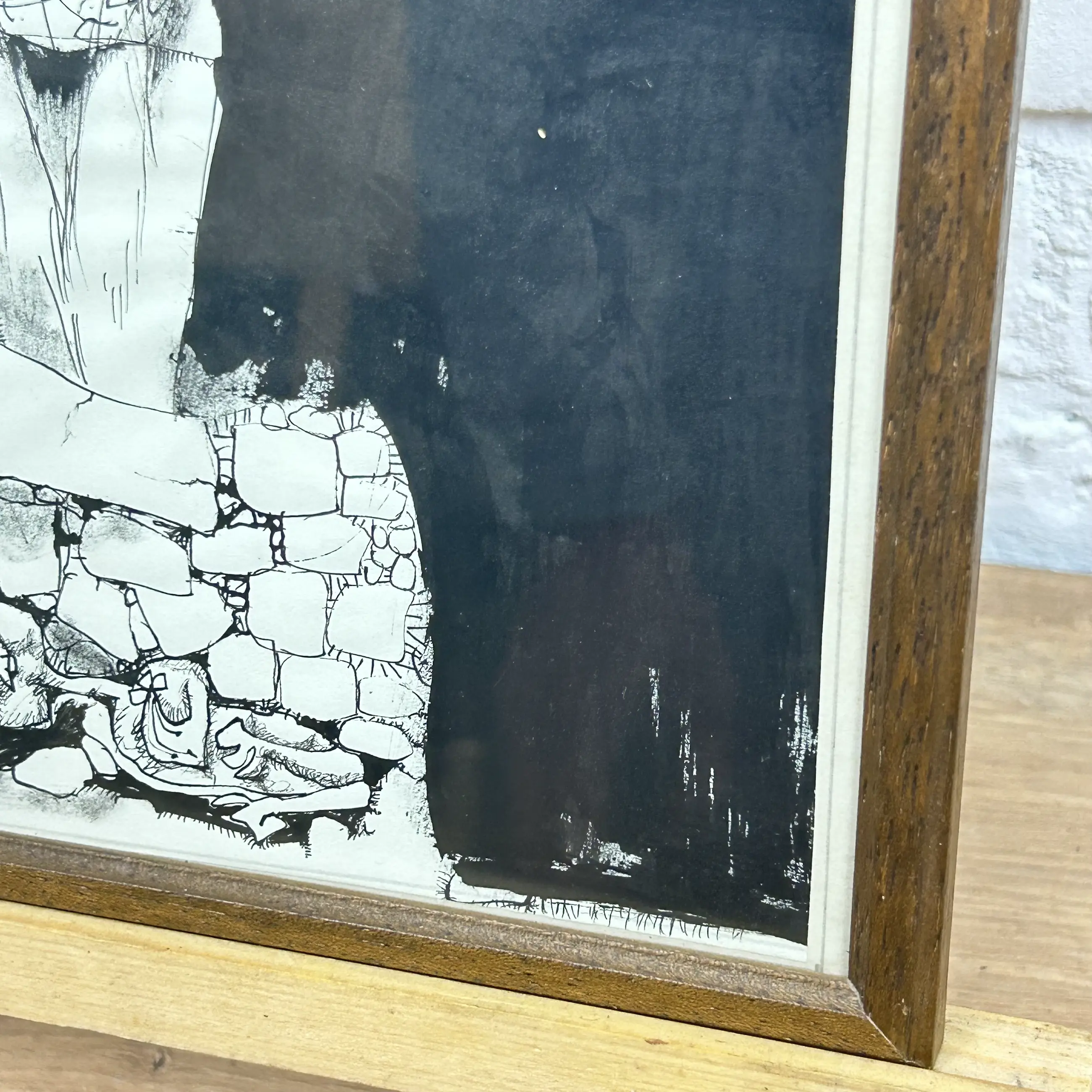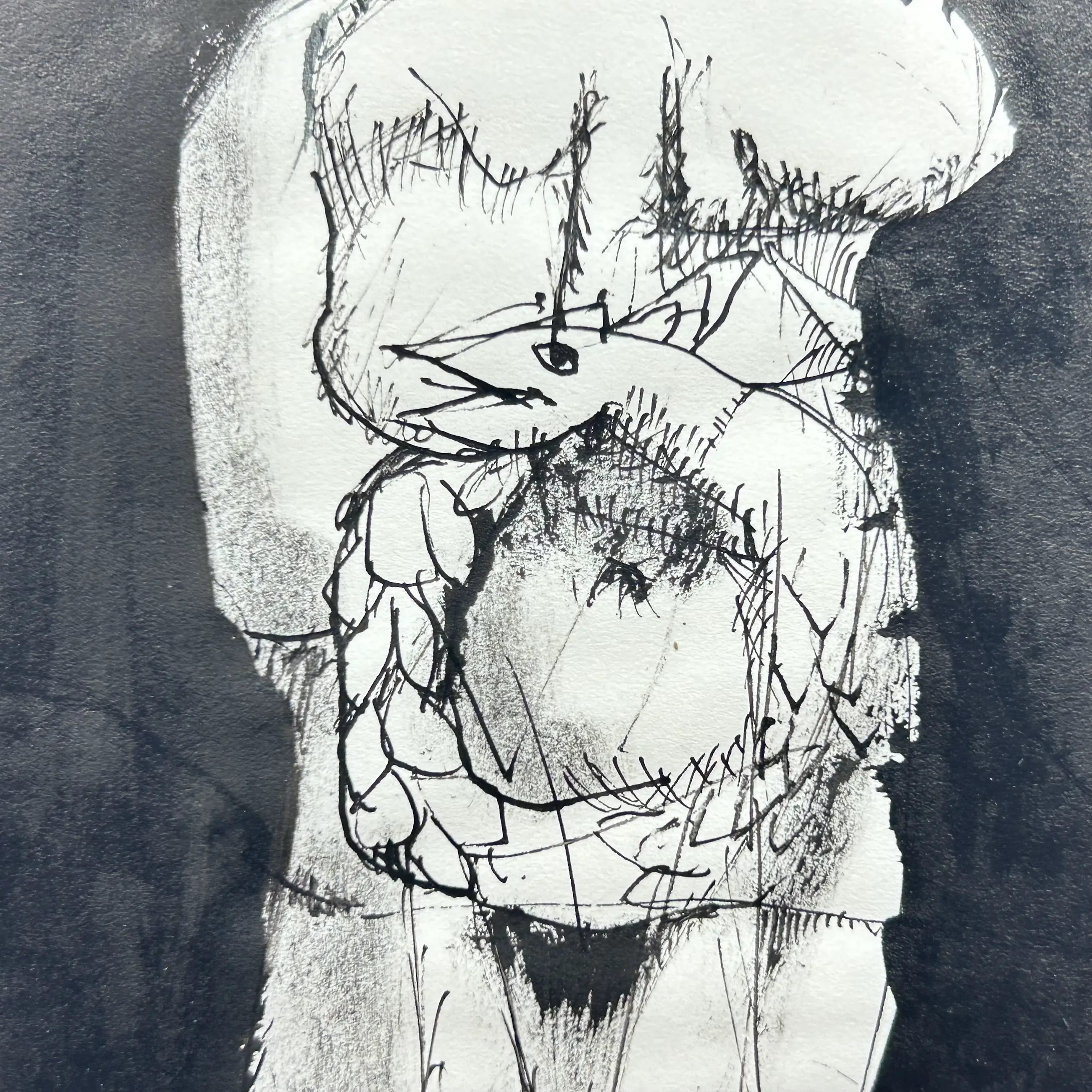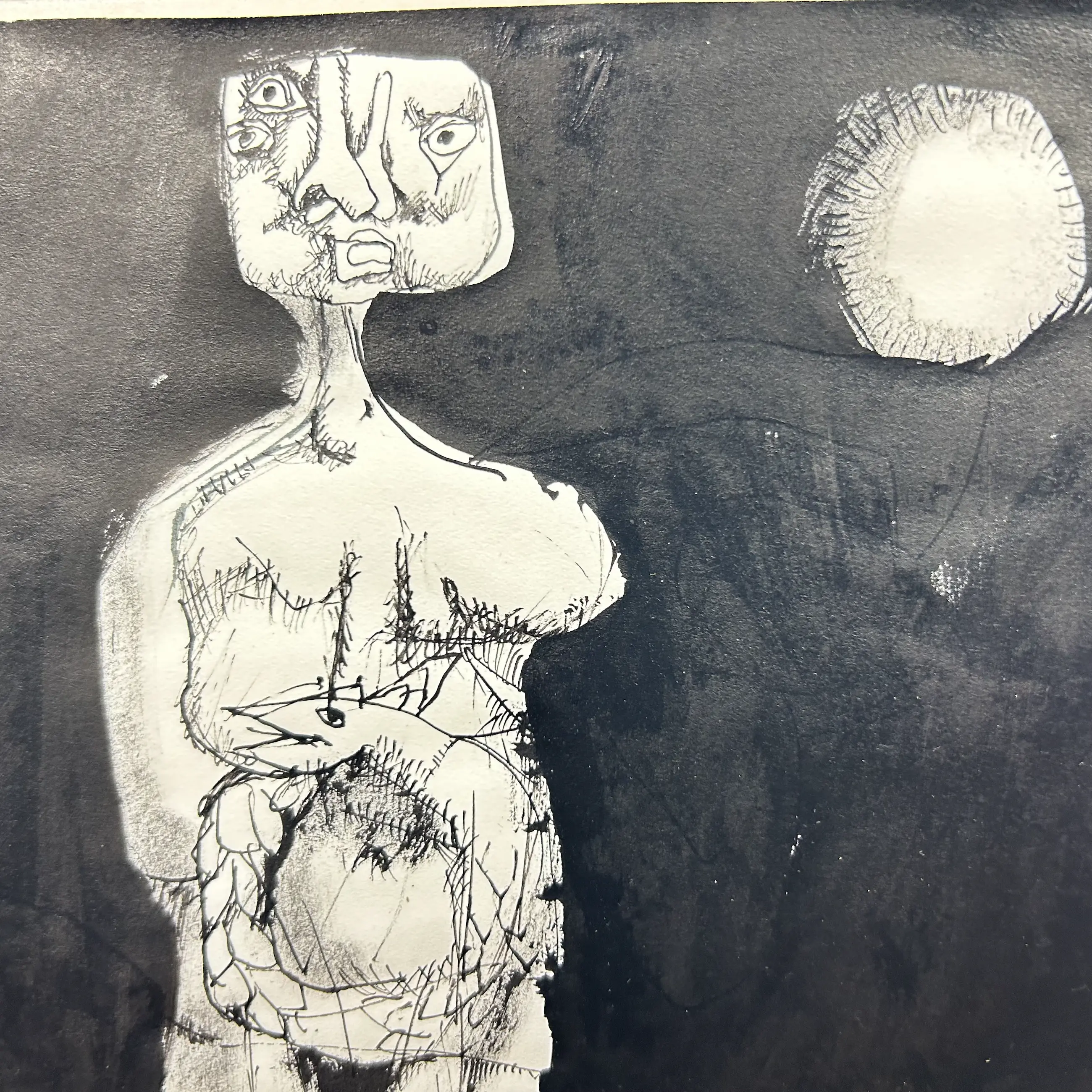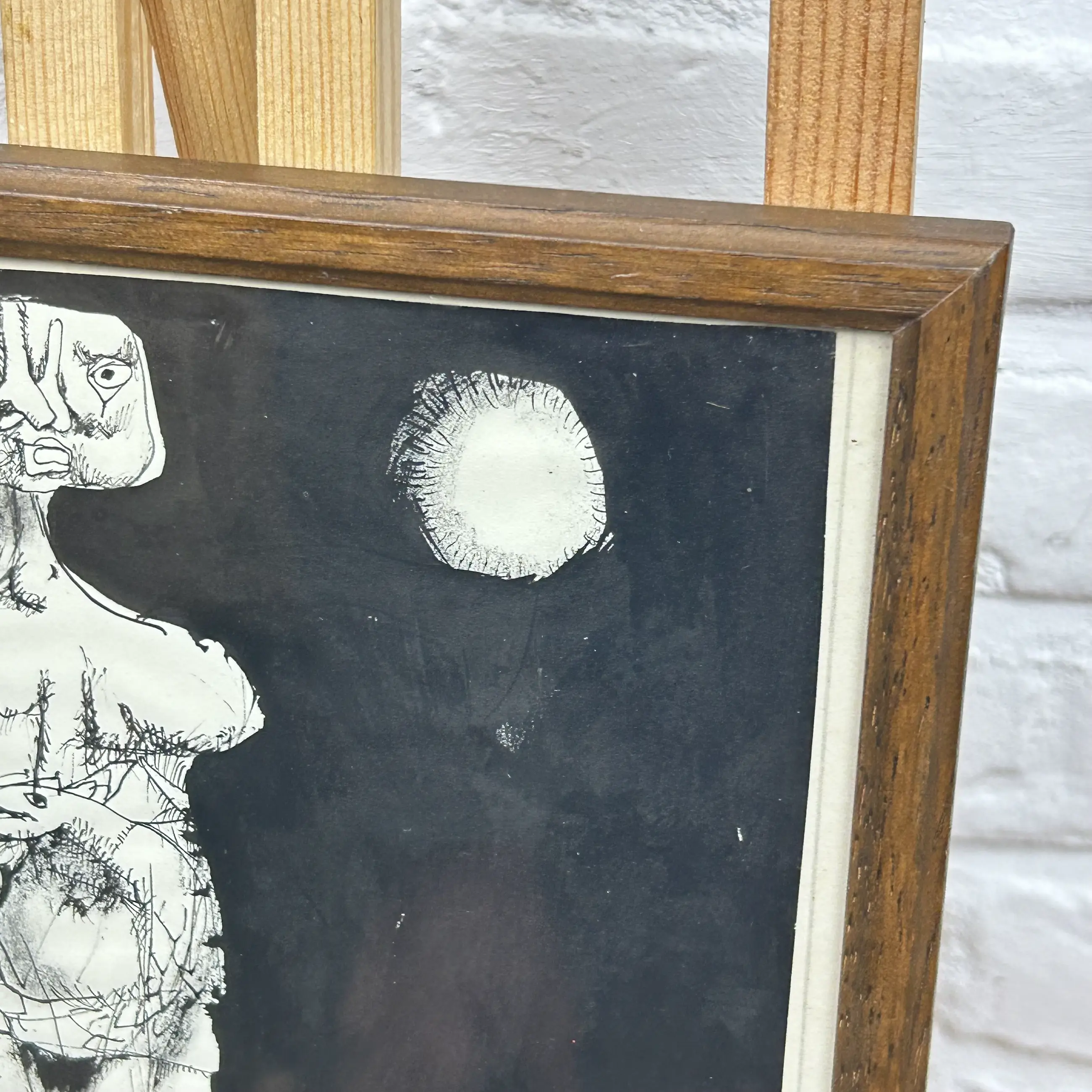 Een originele pentekening van de Bergense kunstenaar Jaap Mooy (1915-1987) (géén herdruk) surrealistisch beeld van een standbeeld achtig figuur met een slang / serpent om zijn middel en een verborgen figuur verstopt in de fundering van het beeld.