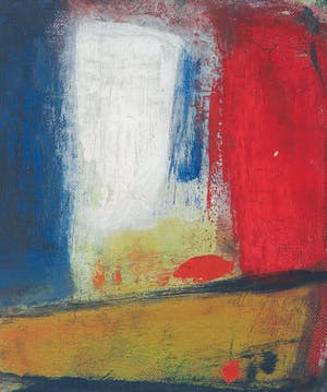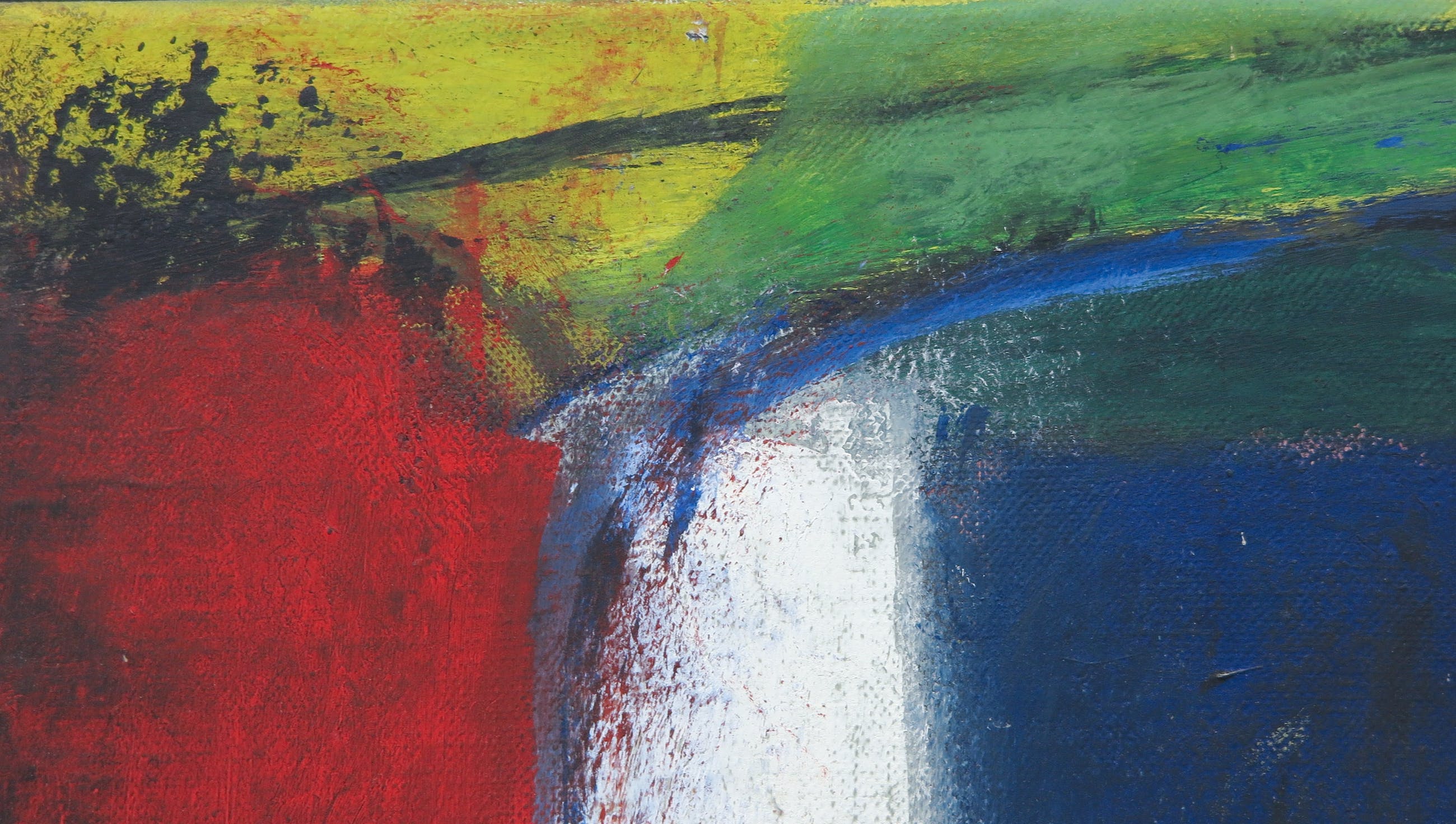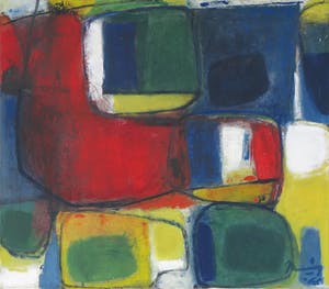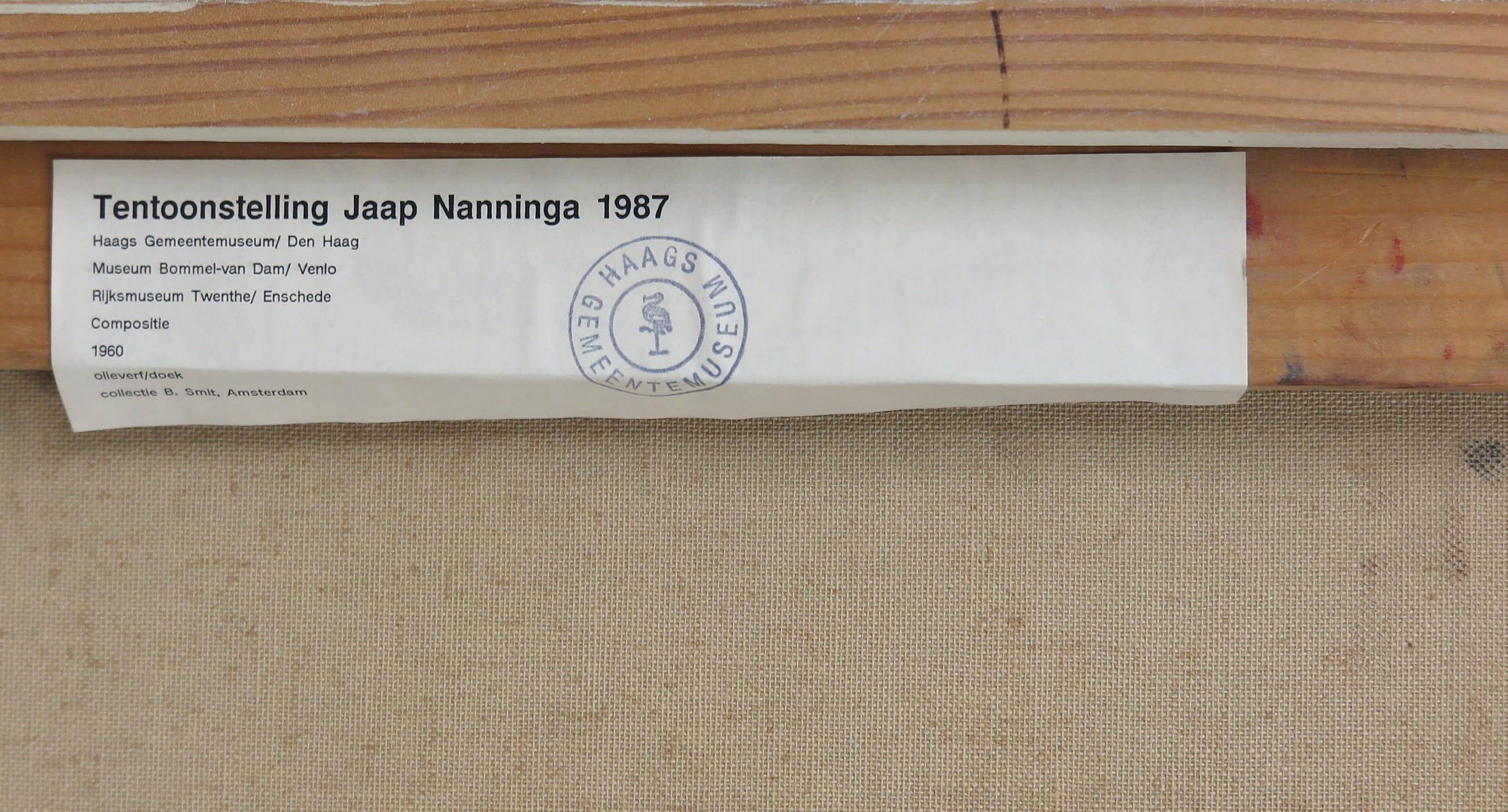 Prachtige compositie met heldere rood, blauw, groen en geeltinten in olieverf op doek, door de abstracte kunstenaar Jaap Nanninga. Het werk is rechtsonder gesigneerd en gedateerd (1960).