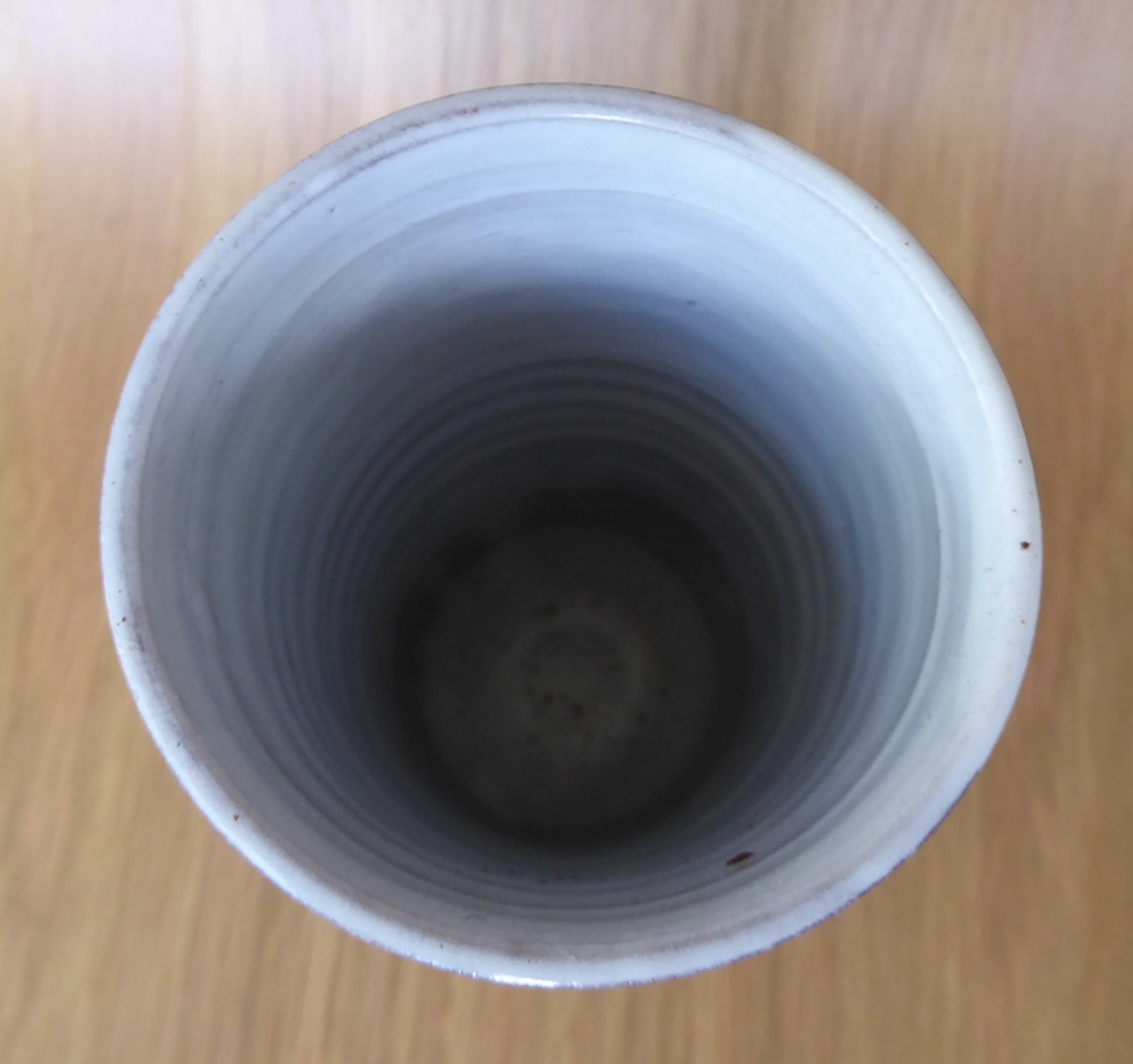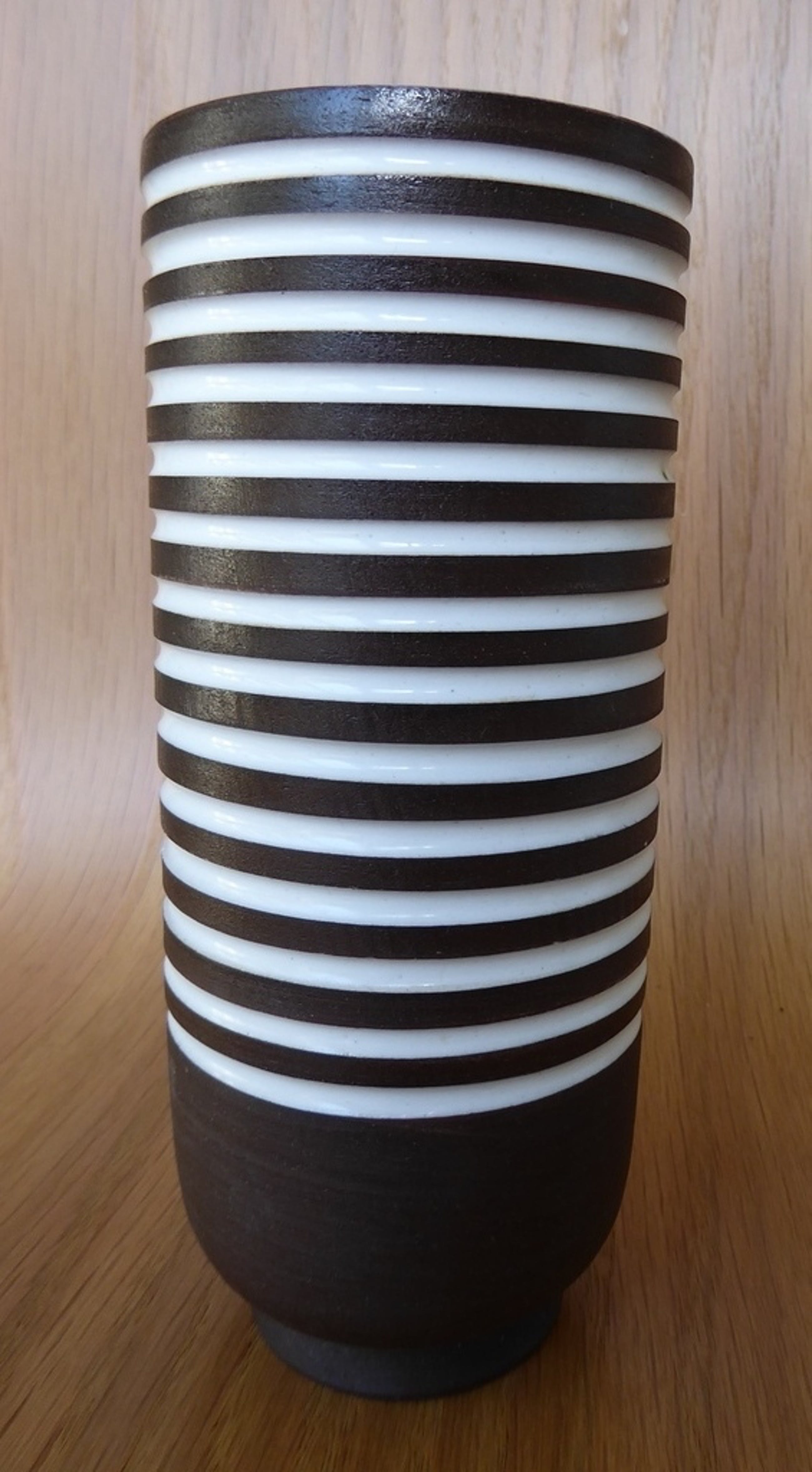 Deze vaas van de bekende keramist Jaap Ravelli is 16 cm hoog en 6,5 cm breed. Hij stamt uit eind jaren '50, begin jaren '60.
