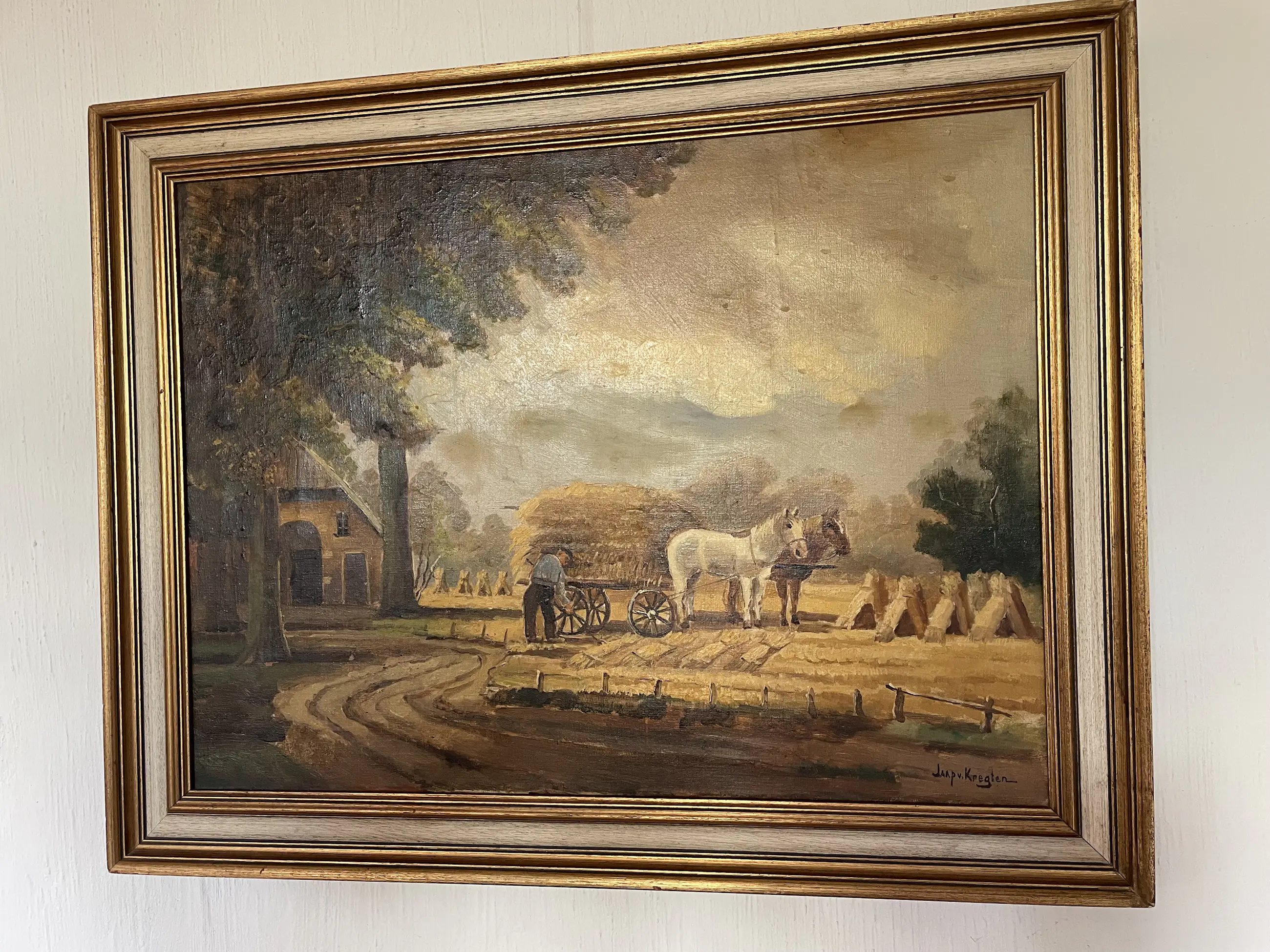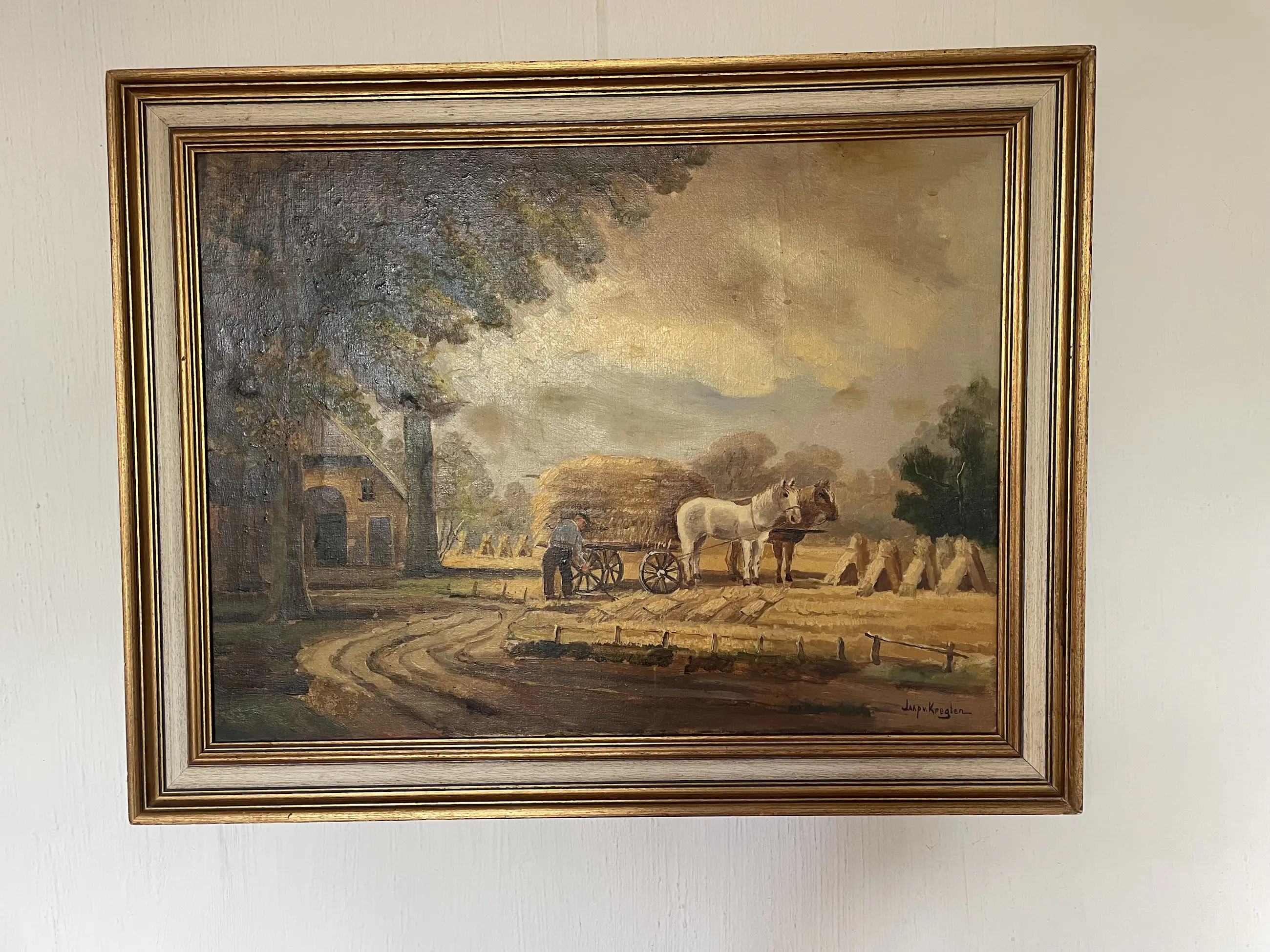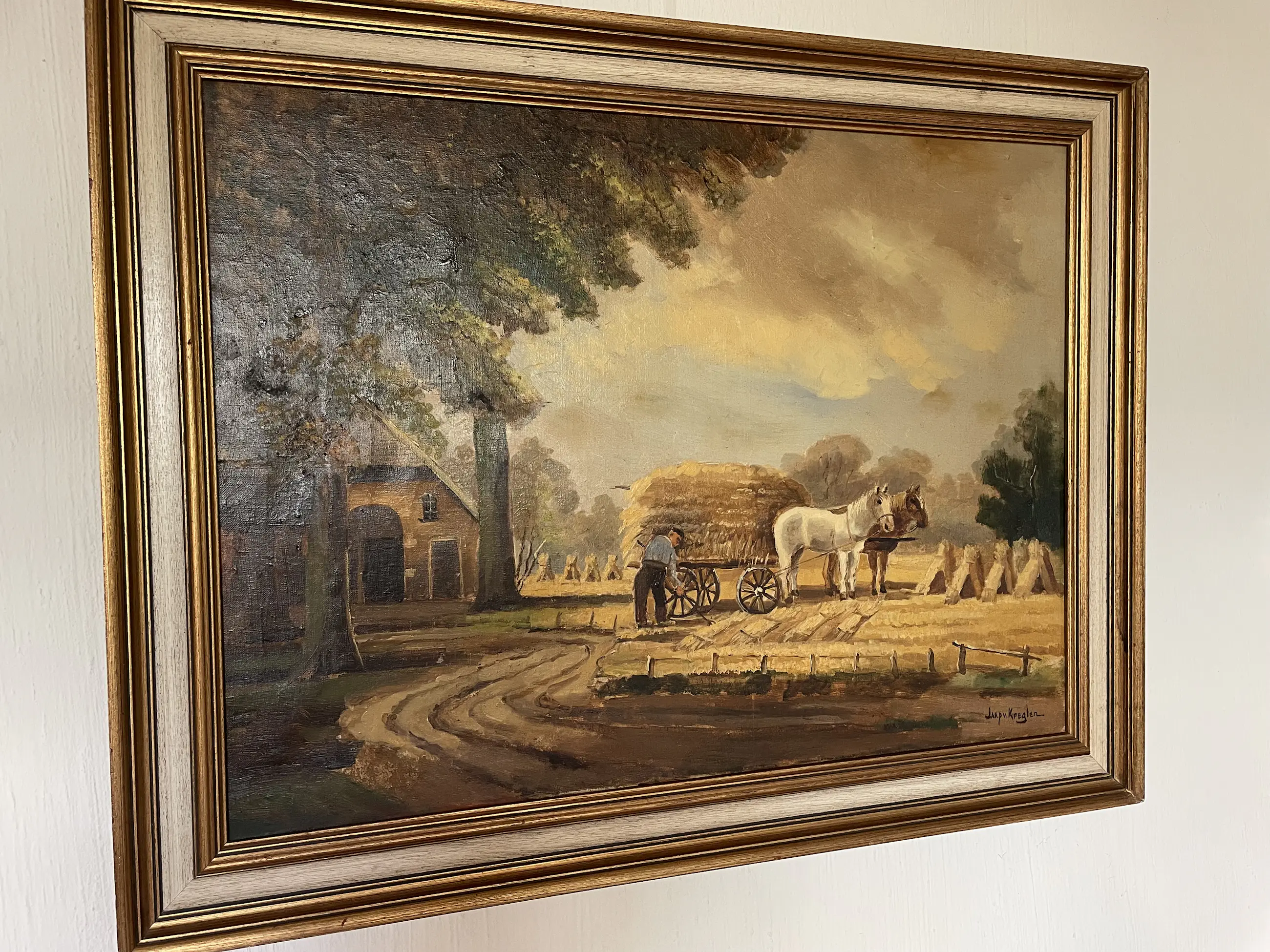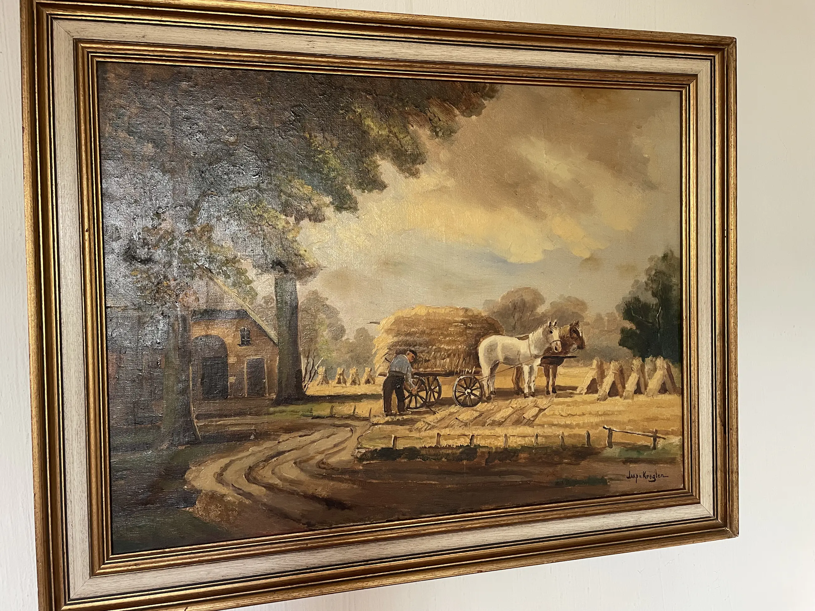 Hooi opsteken op wagen getrokken door 2 paarden. Twentse boerderij op de achtergrond.