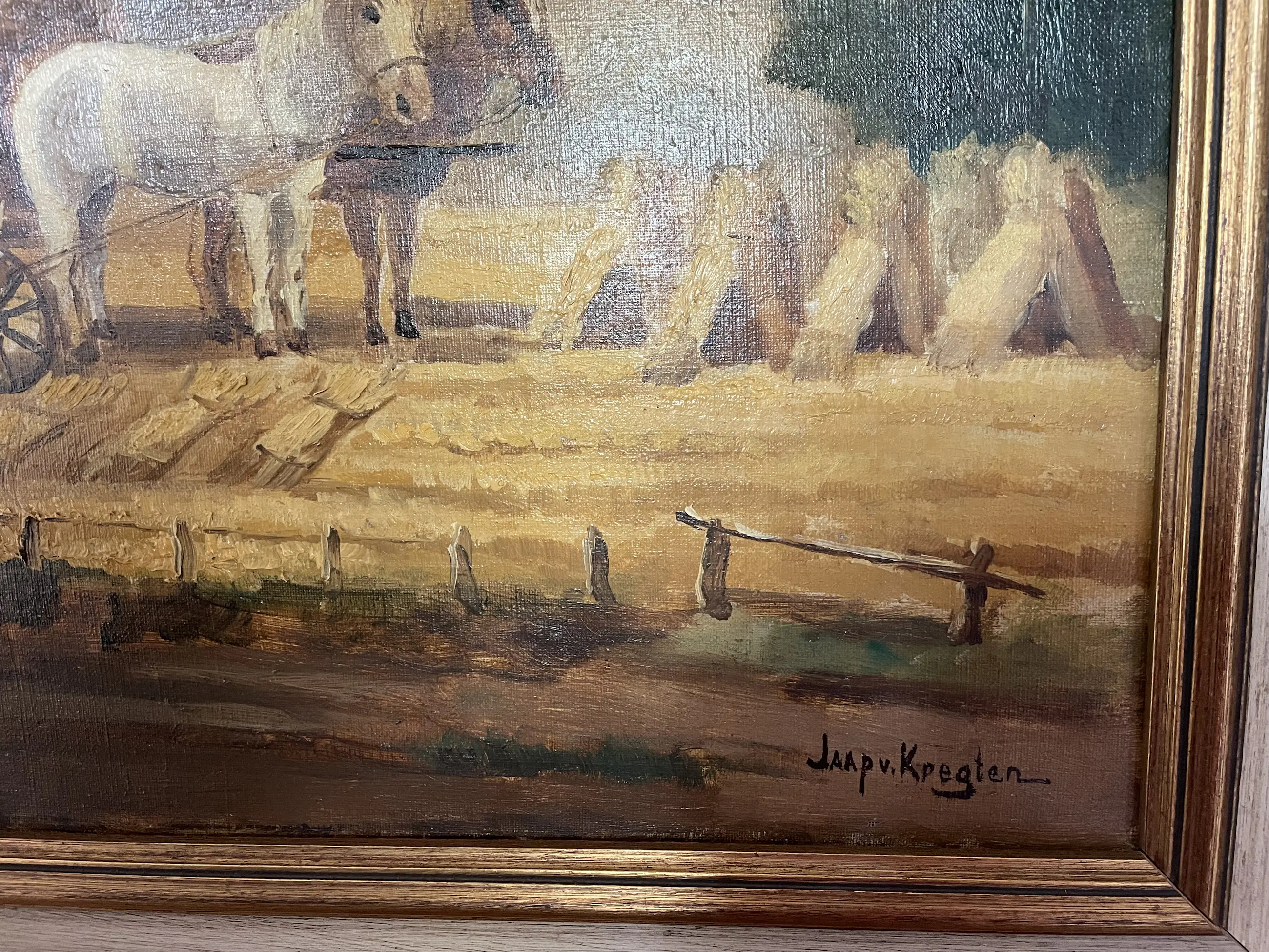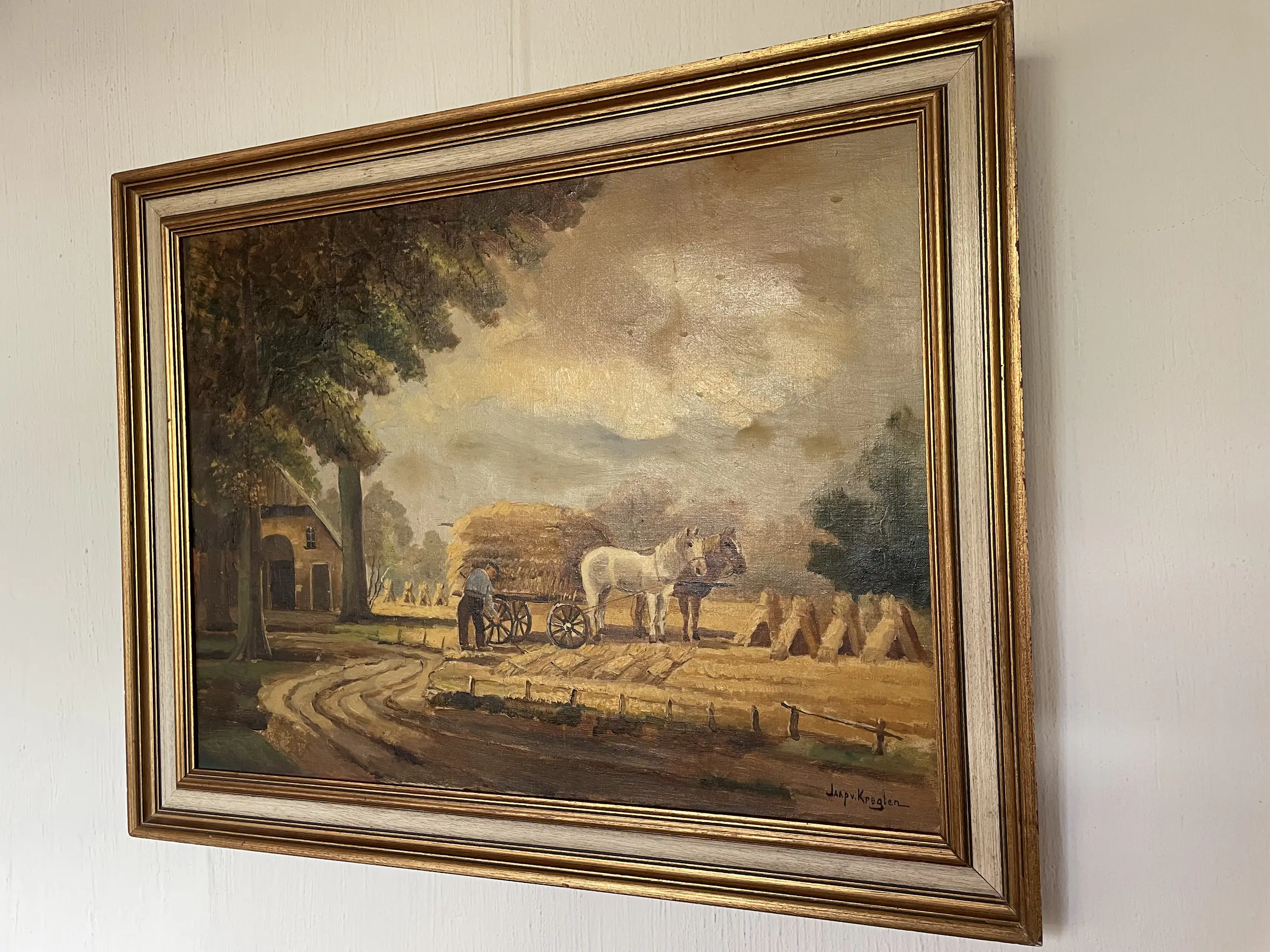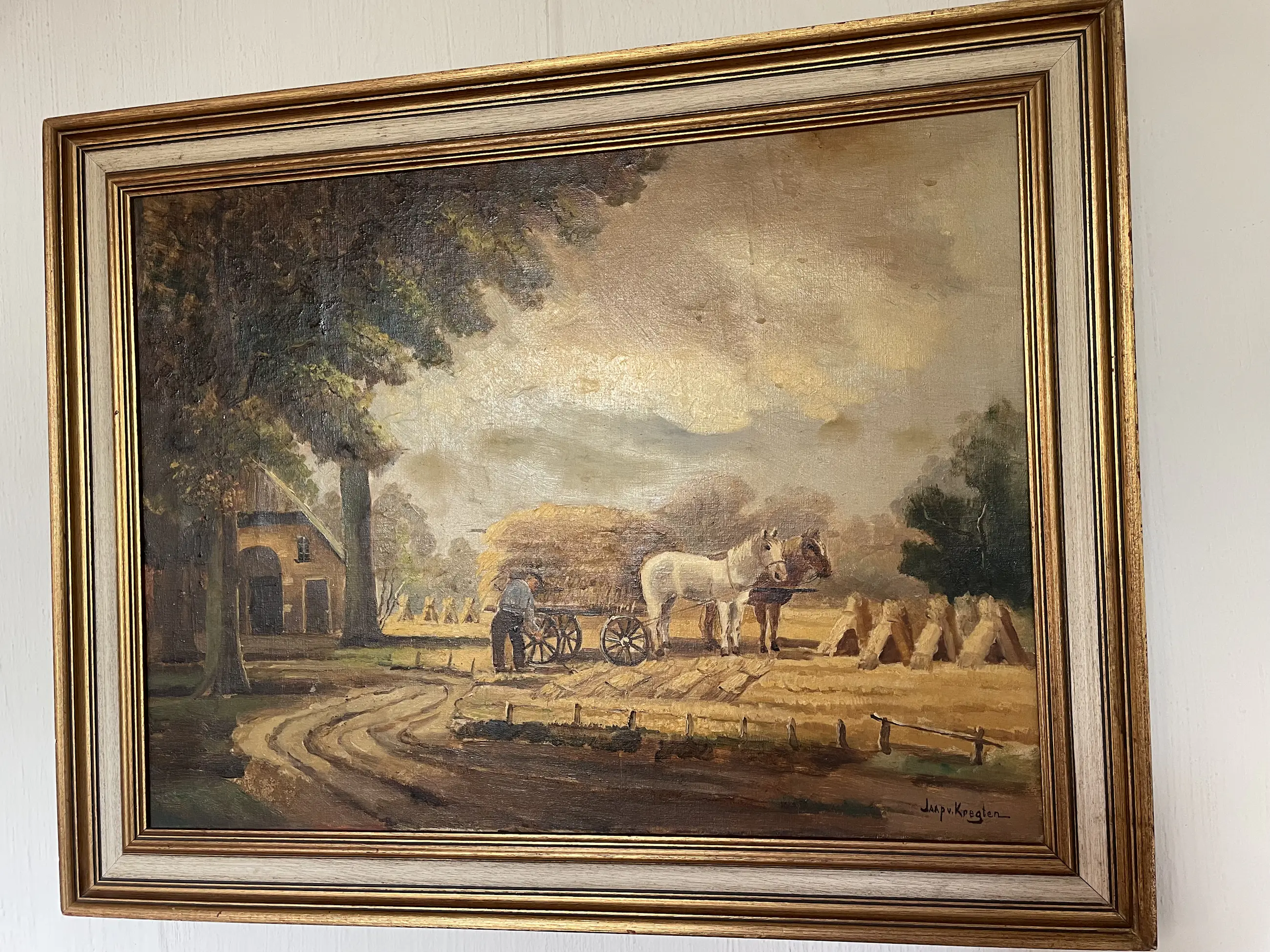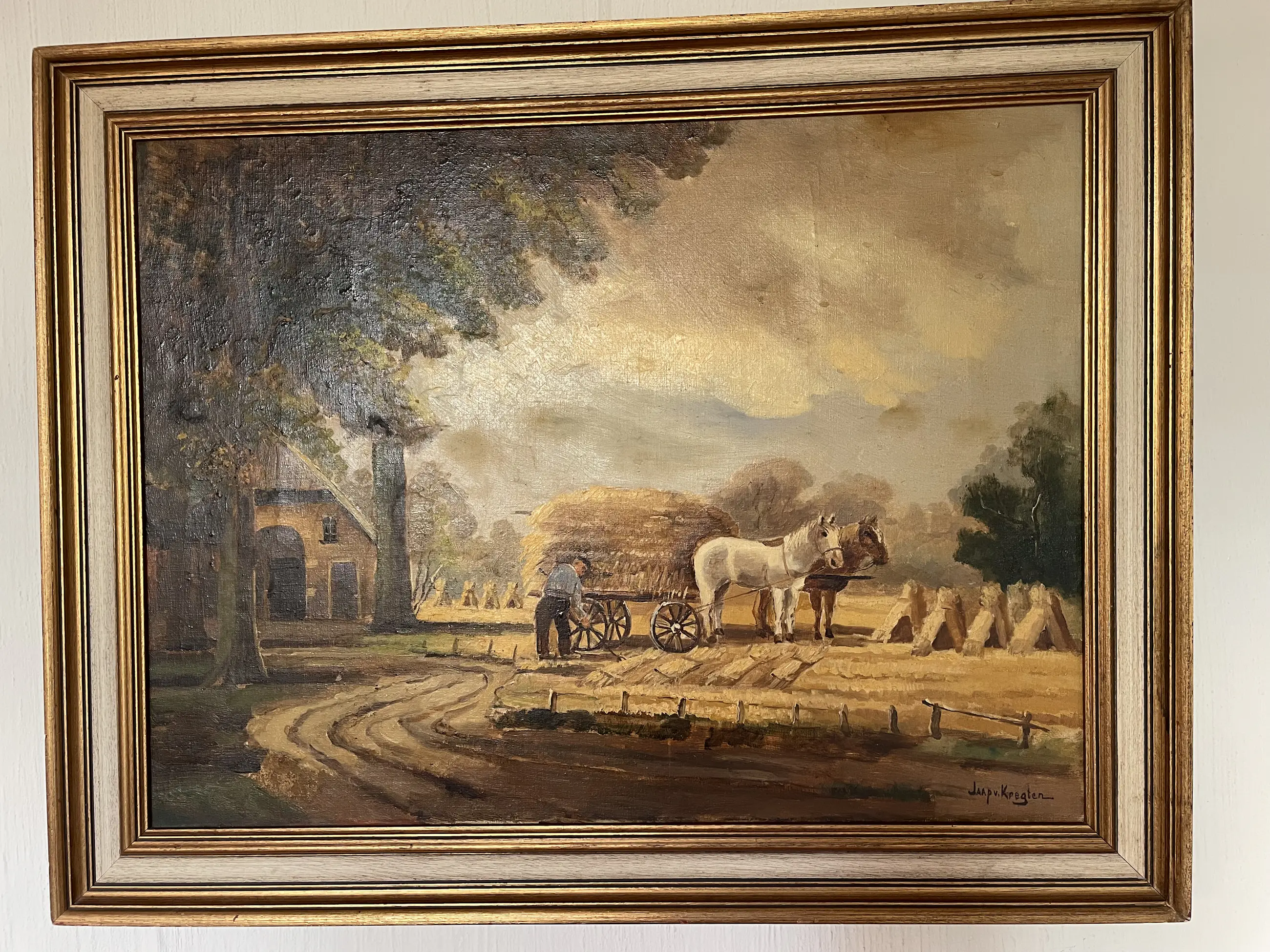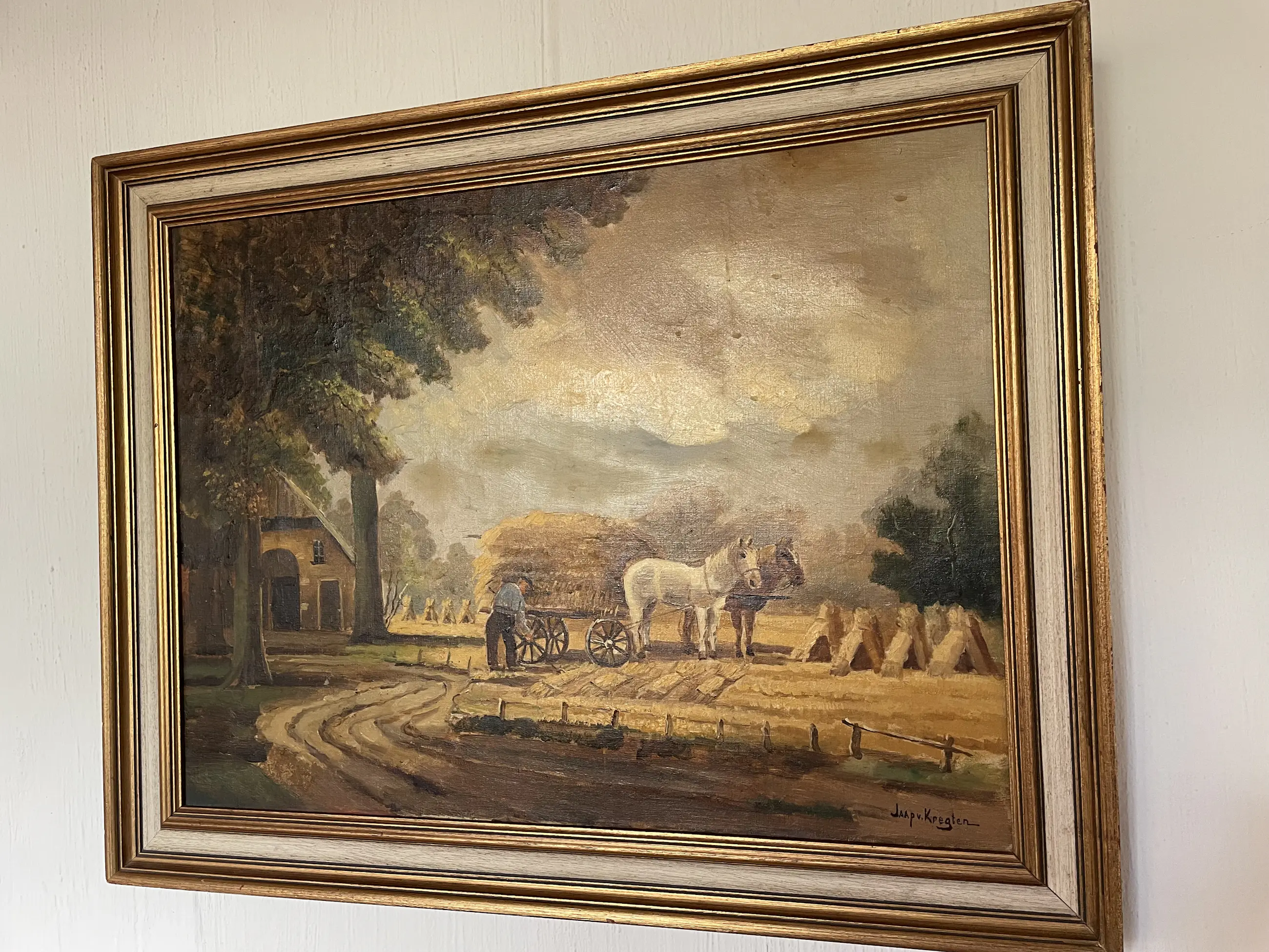 Hooi opsteken op wagen getrokken door 2 paarden. Twentse boerderij op de achtergrond.