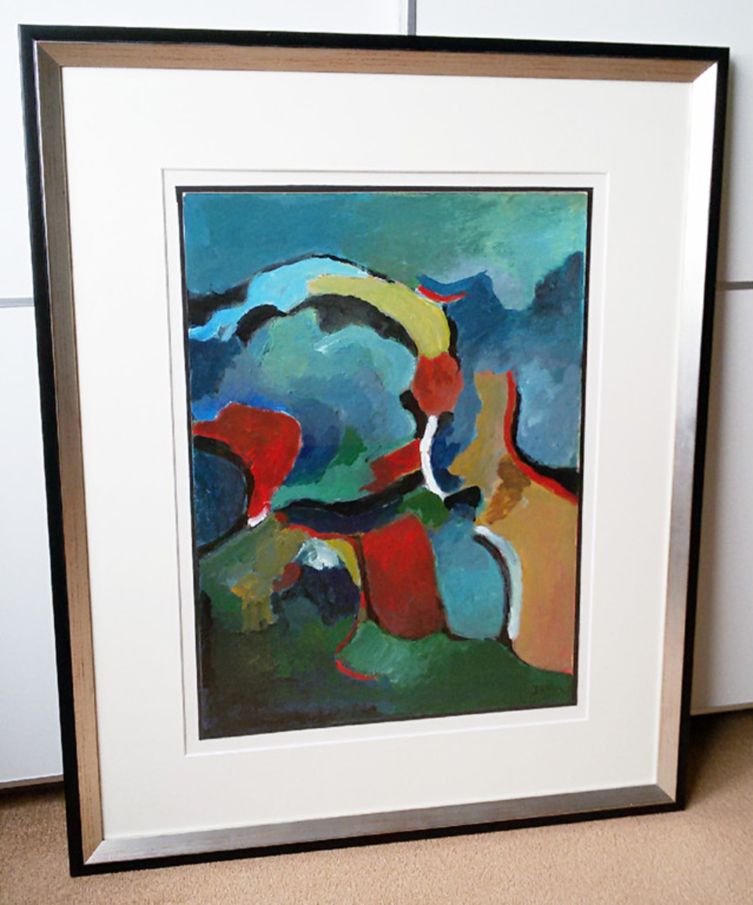 Kleurrijke compositie van Jaap van Veen. Verf (olie?, acryl?) op schilderskarton, gesigneerd rechtsonder, te dateren eind jaren 90. In prachtige lijst, achter glas, alles in uitstekende conditie. Alleen de lijst is al minimaal het dubbele waard. In het echt zijn de kleuren vooral zoals in foto 3, door reflecties in het glas doen foto’s 1 en 2 het werk te kort qua kleur en definitie.