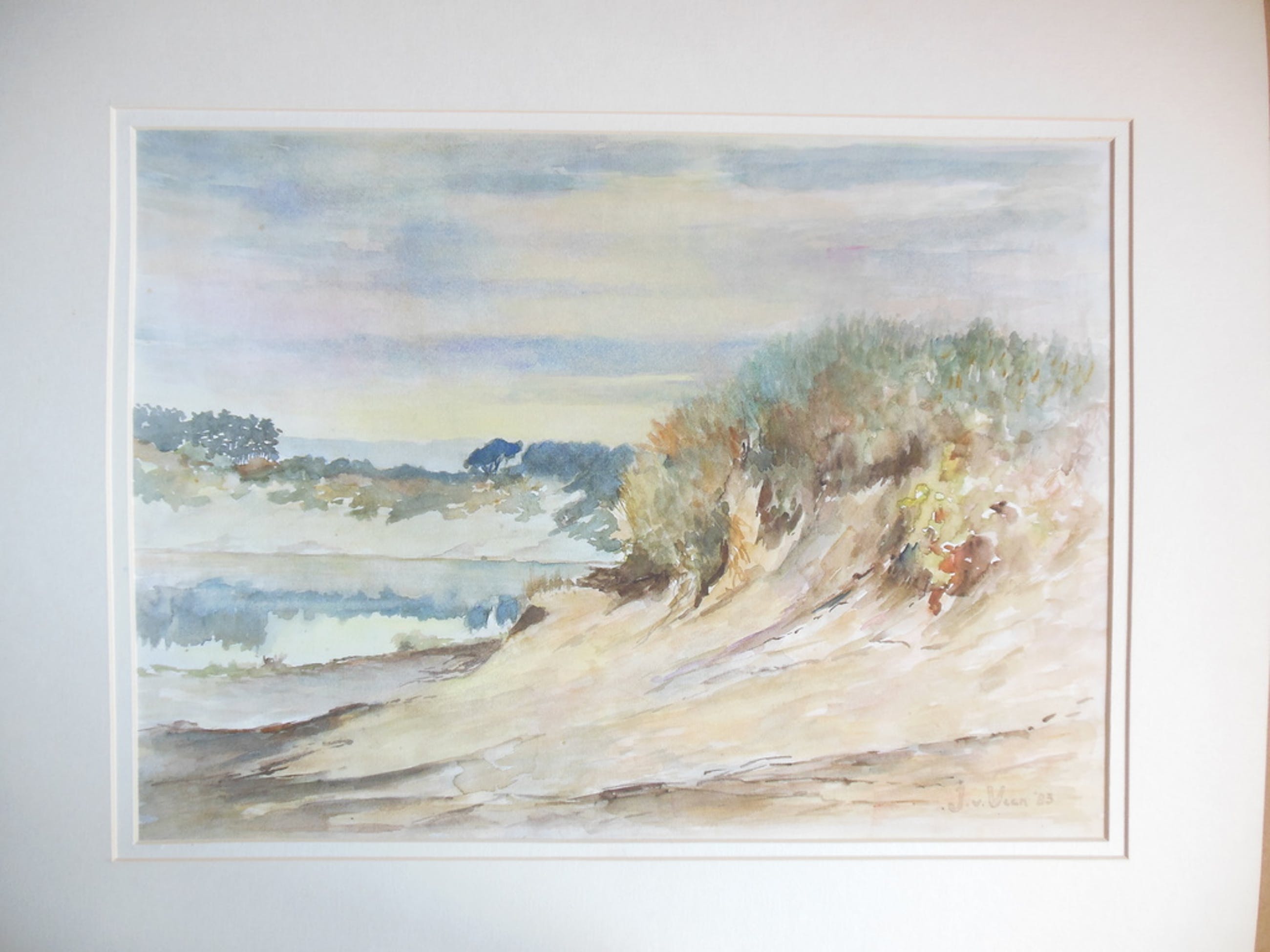 Passe-partout heeft een paar vlekjes, de aquarel is in zeer goede staat.