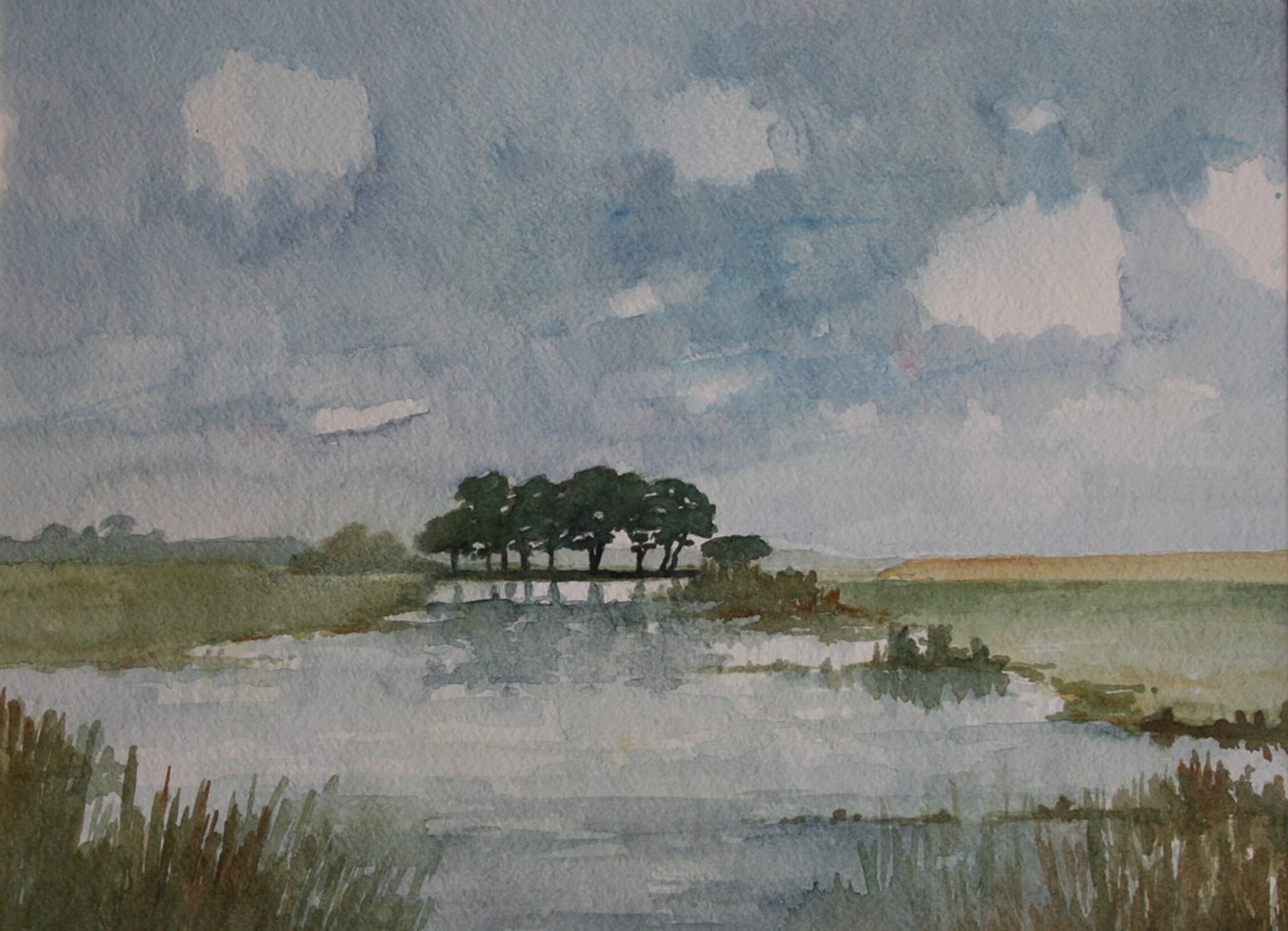 Deze aquarel is voorzien van een passe partout (wat lichte vlekken op passe partout). Het geheel heeft wat hobbels maar dit verdwijnt met inlijsten. Aan de achterzijde is de opzet van een andere aquarel te zien. Afbeelding is 38,5 x 28,5 cm. Met passe-partout 54 x 45 cm.