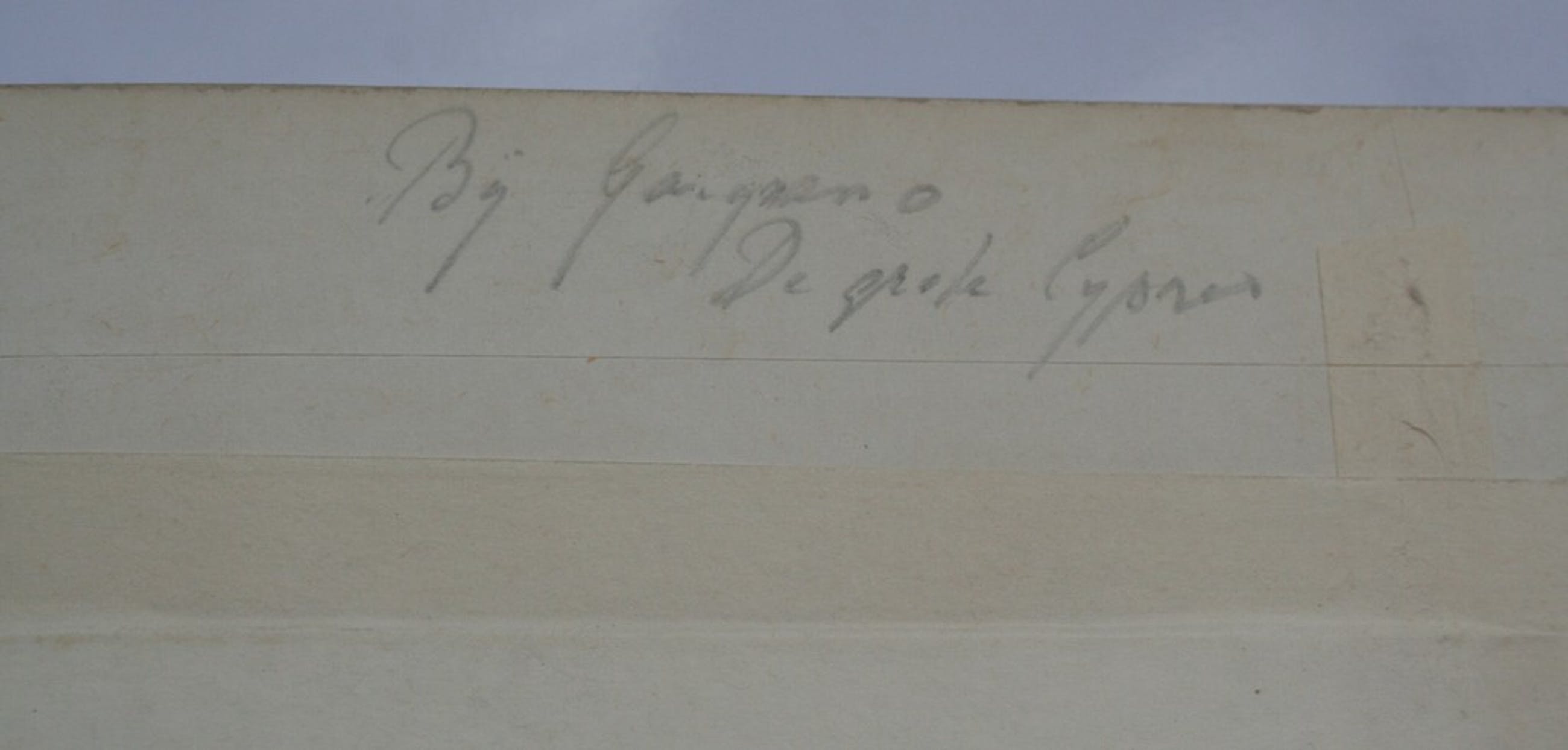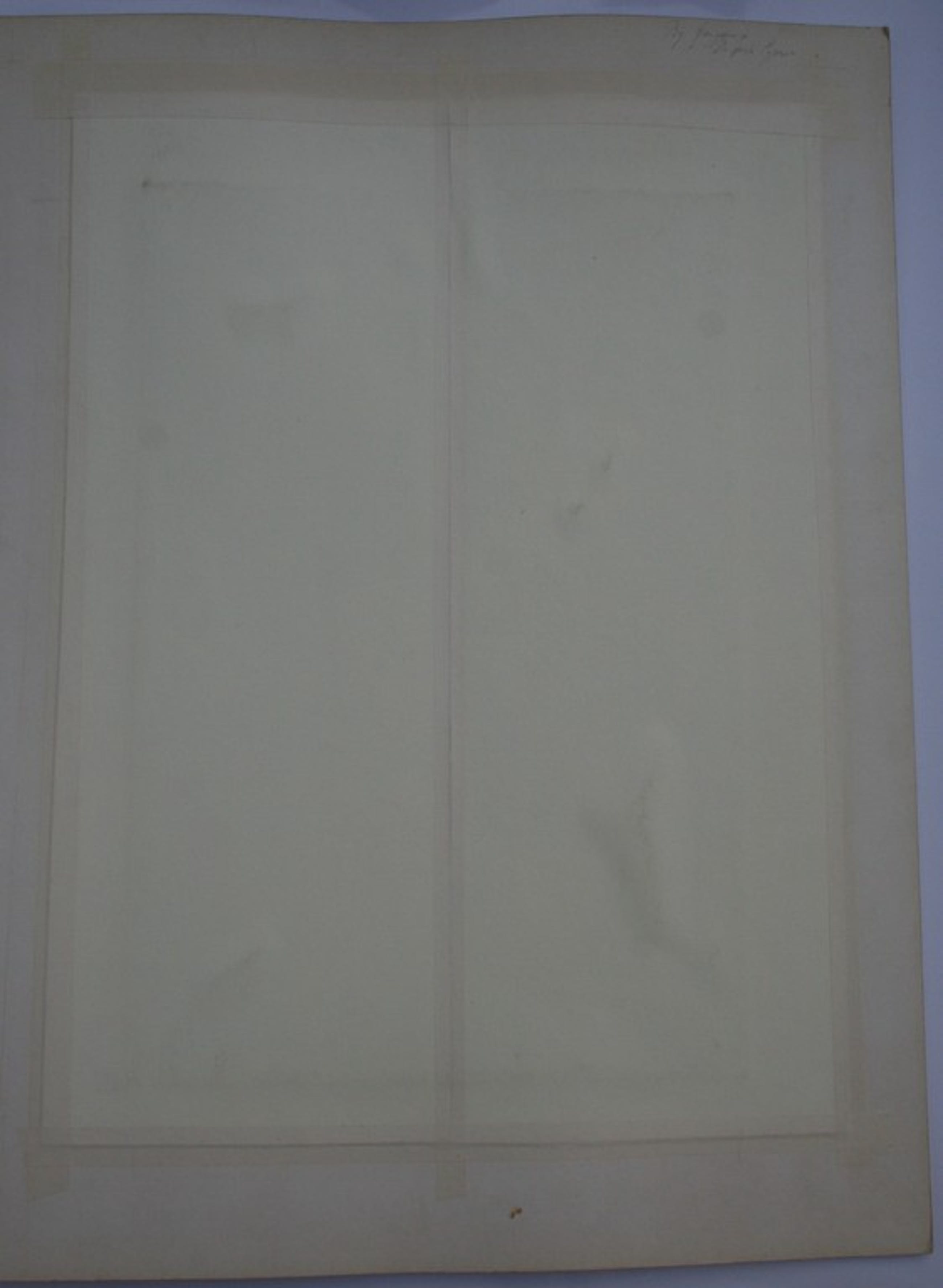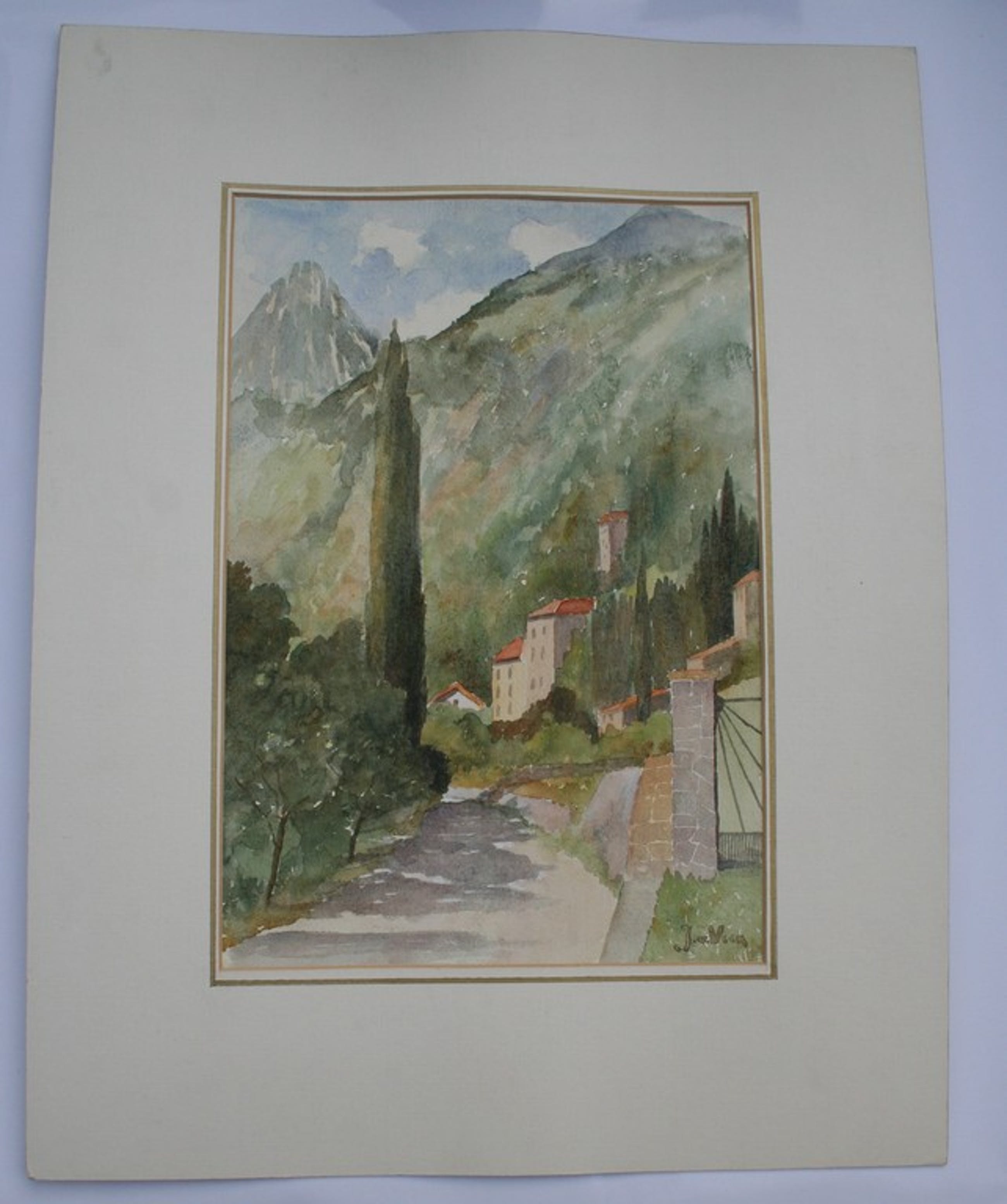 Deze aquarel is voorzien van een passe partout (een lichte verfvlek op passe partout links boven). Het geheel heeft wat hobbels maar dit verdwijnt met inlijsten. Afbeelding is 54 x 40 cm. met passe partout 65 x 50 cm.