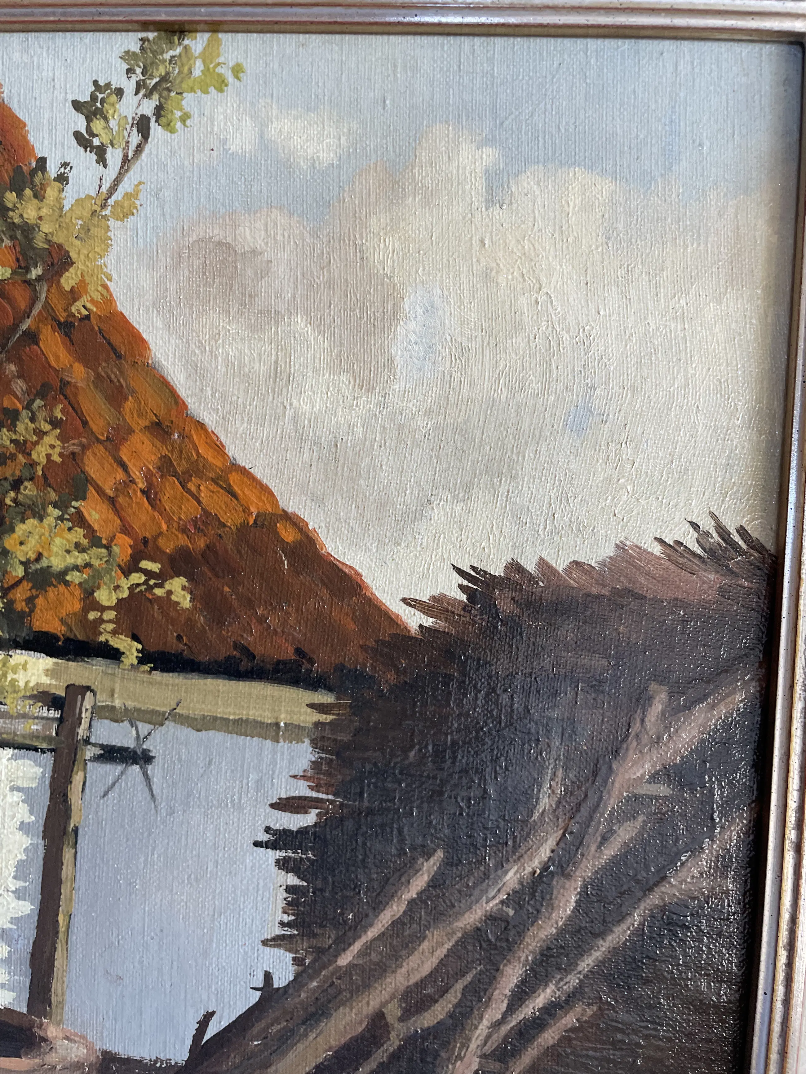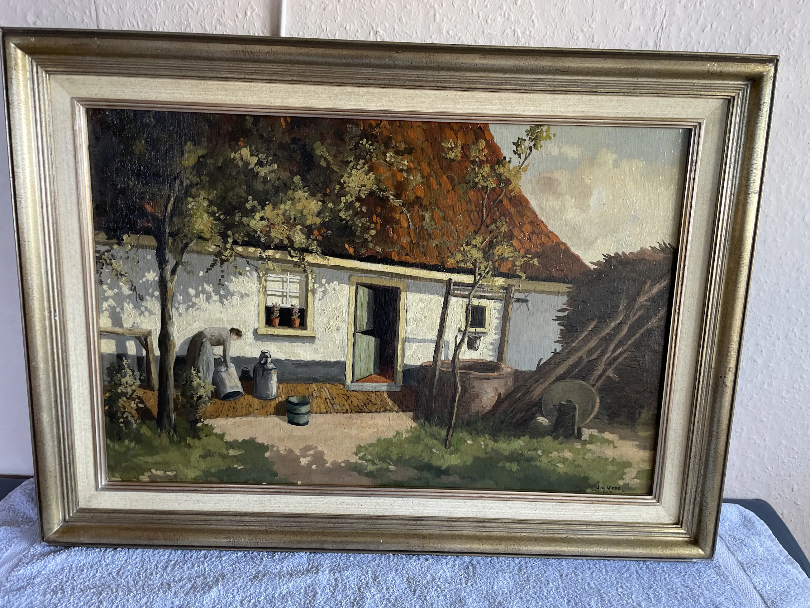 Het olieverfschilderij geeft een glimp weer van het dagelijkse werk op de boerderij. De kleuren zijn levendig en stralen een vriendelijke sfeer uit. De lijst is eenvoudig.