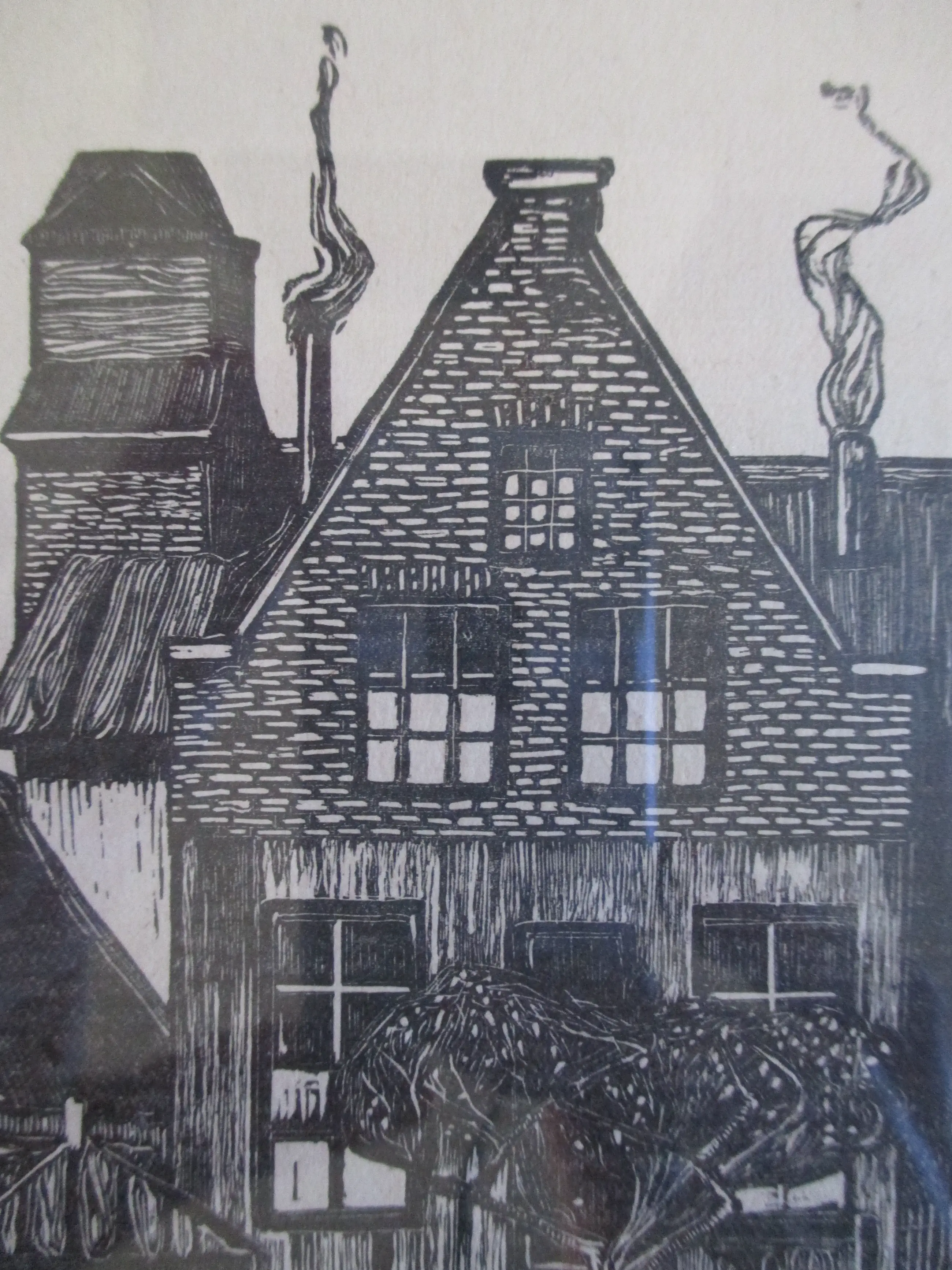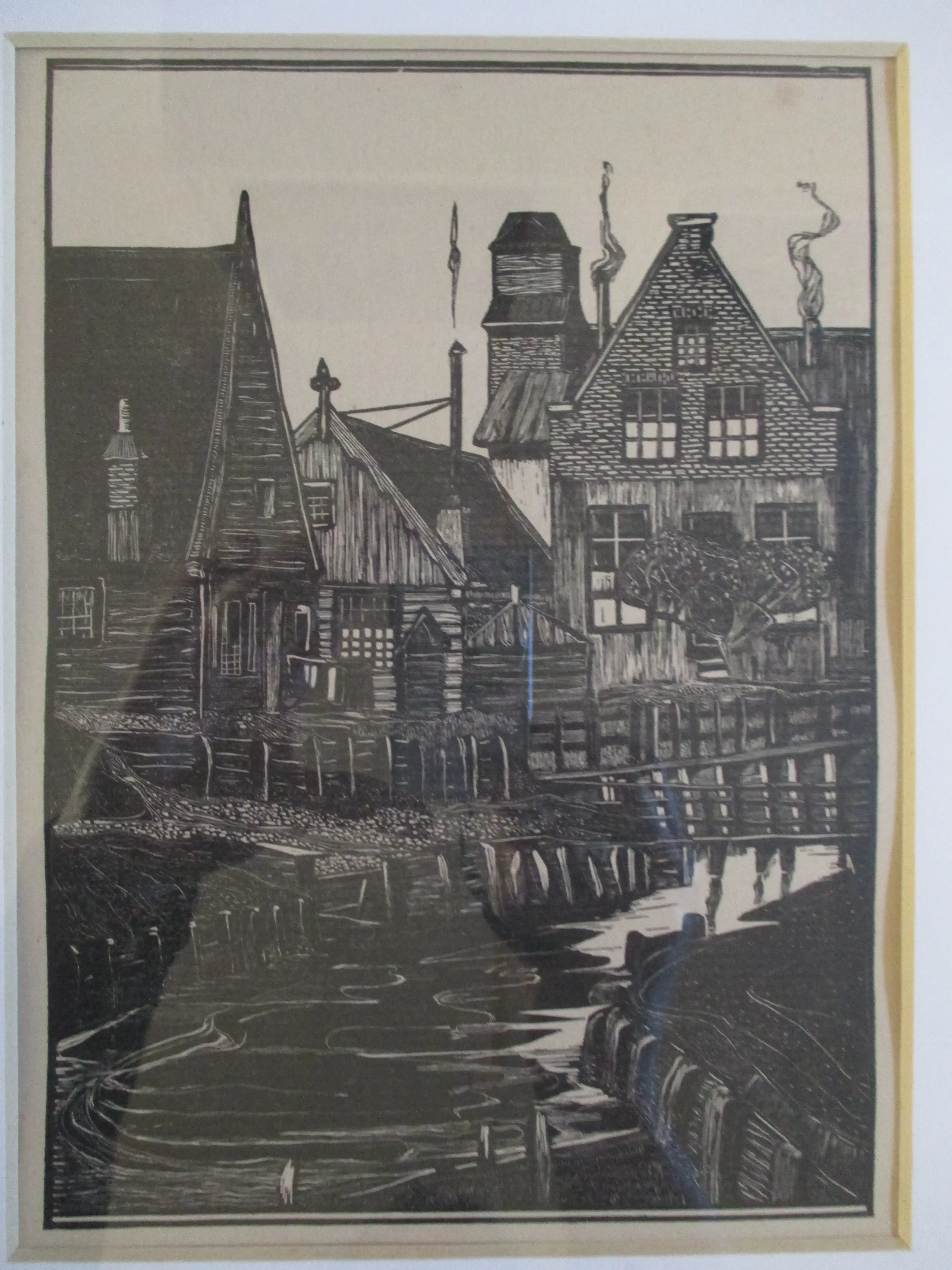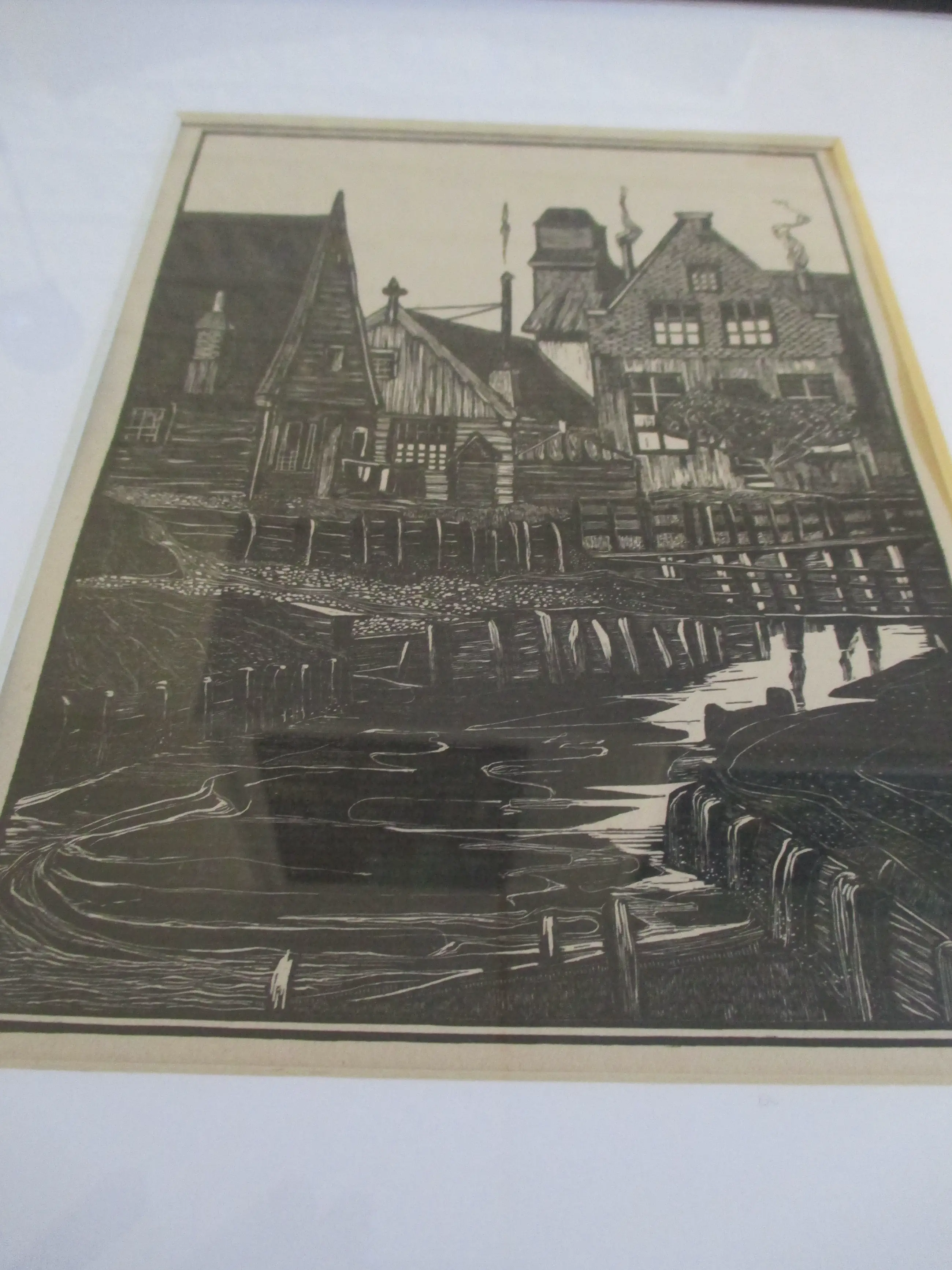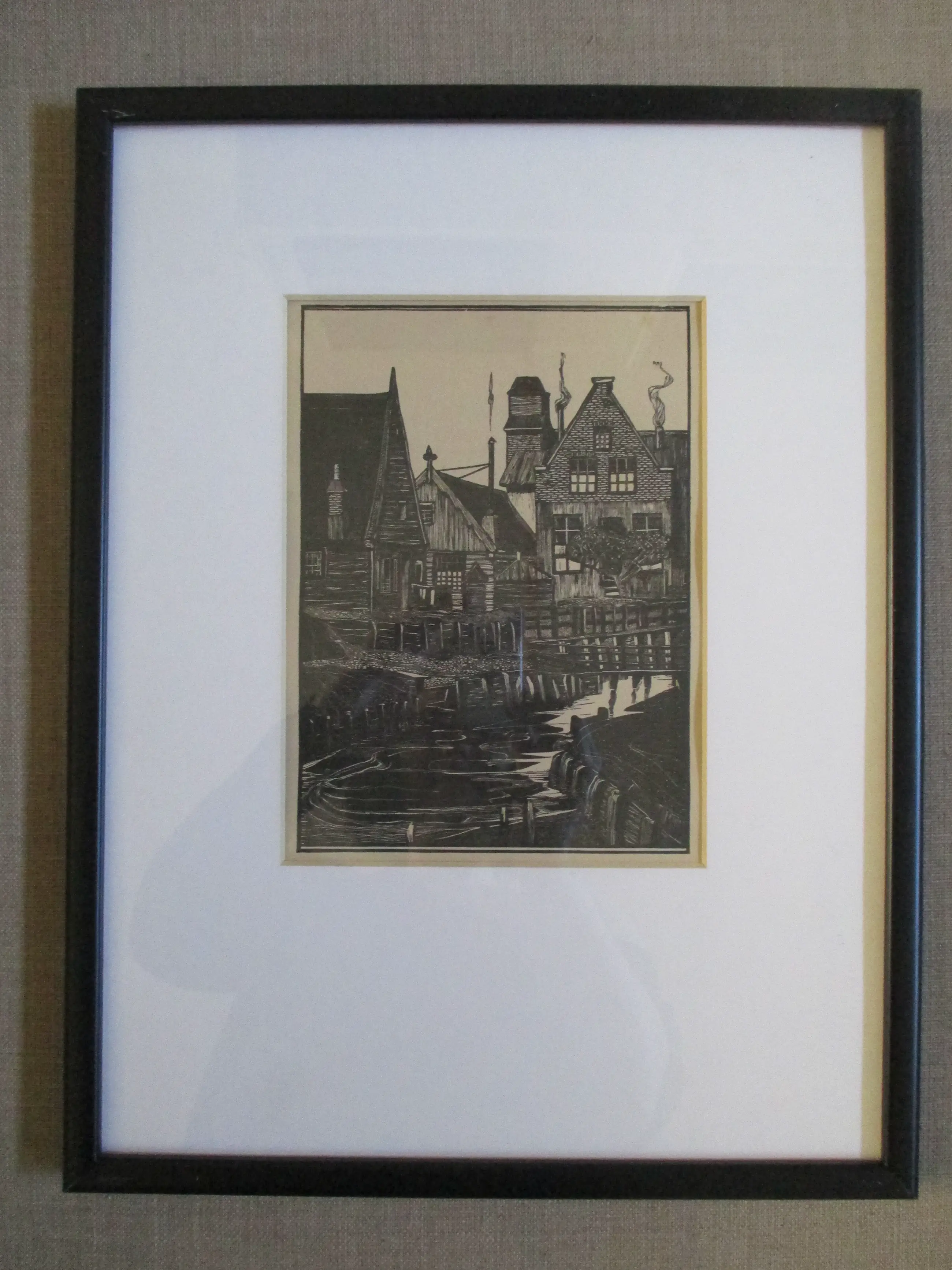 Houtsnede van Jaap Veldheer, verso getiteld Marken II. Ingelijst achter glas in een eenvoudige lijst. Afm. beeld 15x21 cm. Verzending 8 euro, aangetekend 9,65