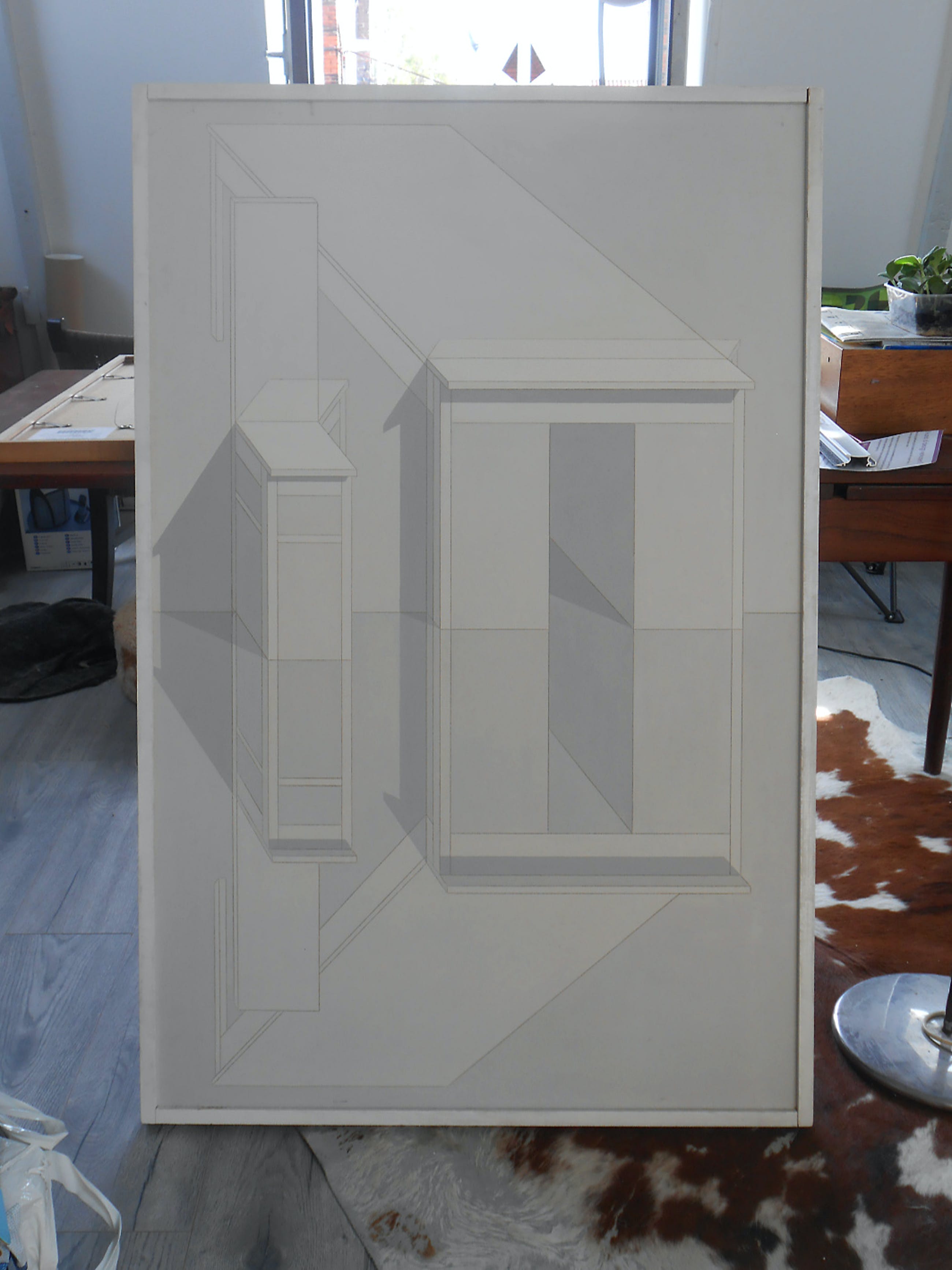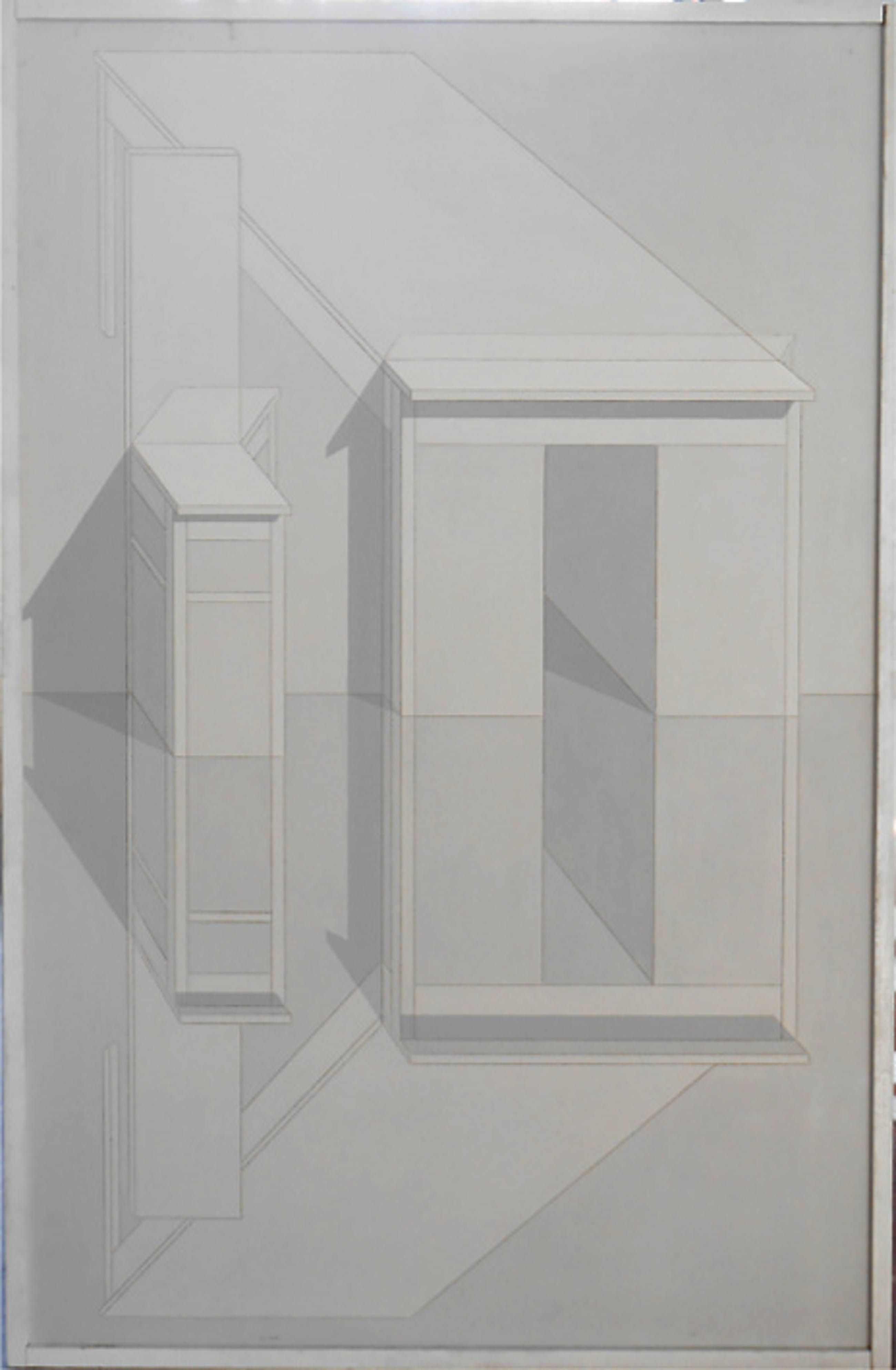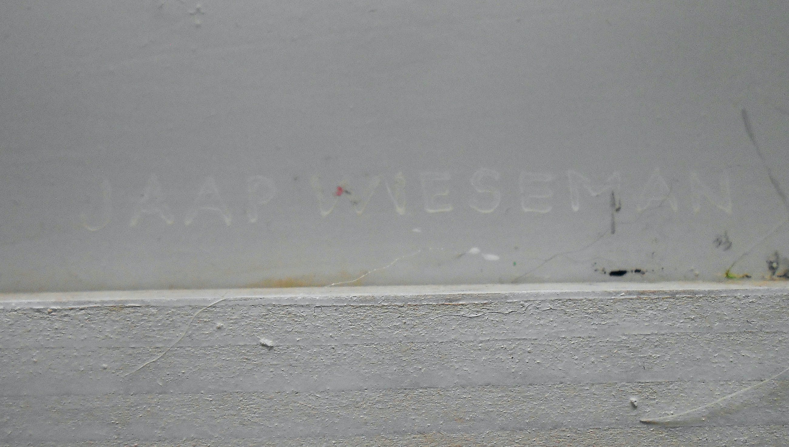 Prachtig groot minimalistisch schilderij in grijstonen van J.T.F. Wieseman ( 1938). Naam van de kunstenaar is in hele kleine drukletters gegraveerd aan de rechteronderzijde van de voorstelling ( zie foto). Schilderij in lakverf op houten ondergrond. Zeer bijzondere techniek omdat de lijnen zijn uitgefreesd in het hout hetgeen een super strak modern resultaat geeft. Paneel is omlijst met een ruwe witgeschilderde vurenhouten raam. Op het werk in de hoekjes en in de gefreesde lijnen zit wat vervuiling hetgeen ook zichtbaar is op de foto. Jaap Wieseman was jarenlang schilderdocent op de kunstacademie Arnhem.