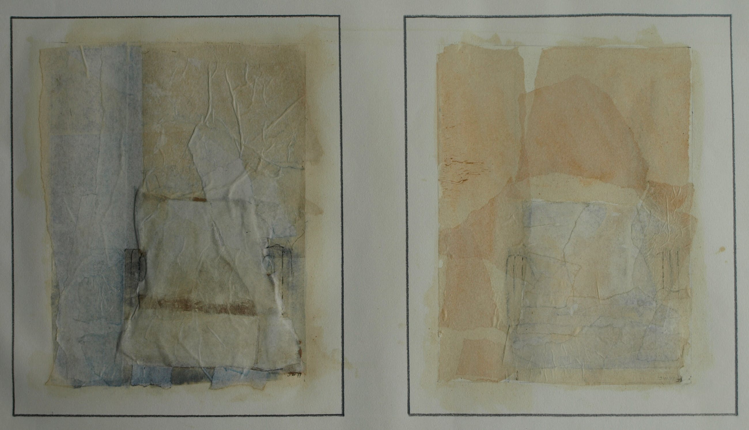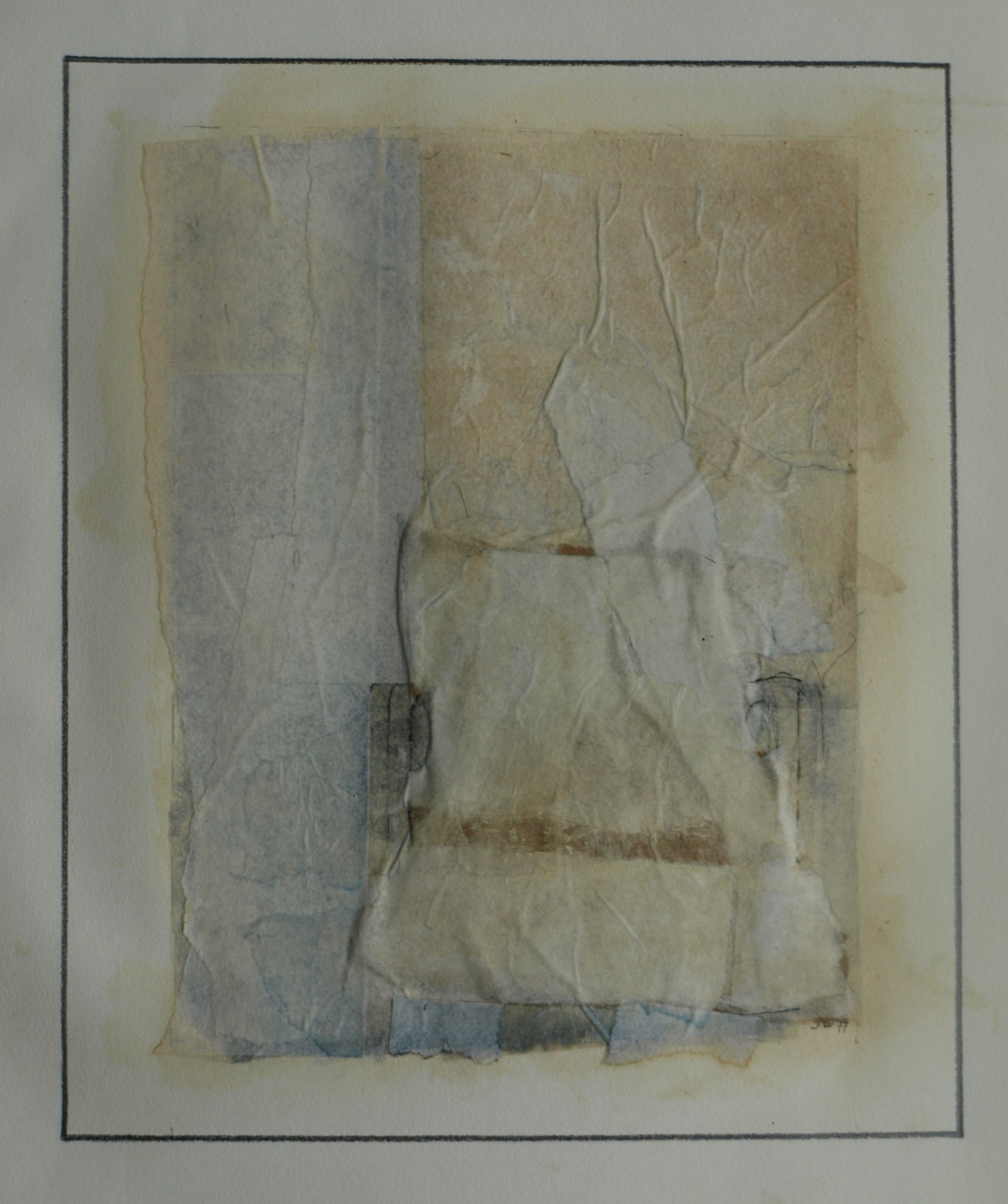 -Techniek: Gemengde techniek van collage van papier en aquarelverf.