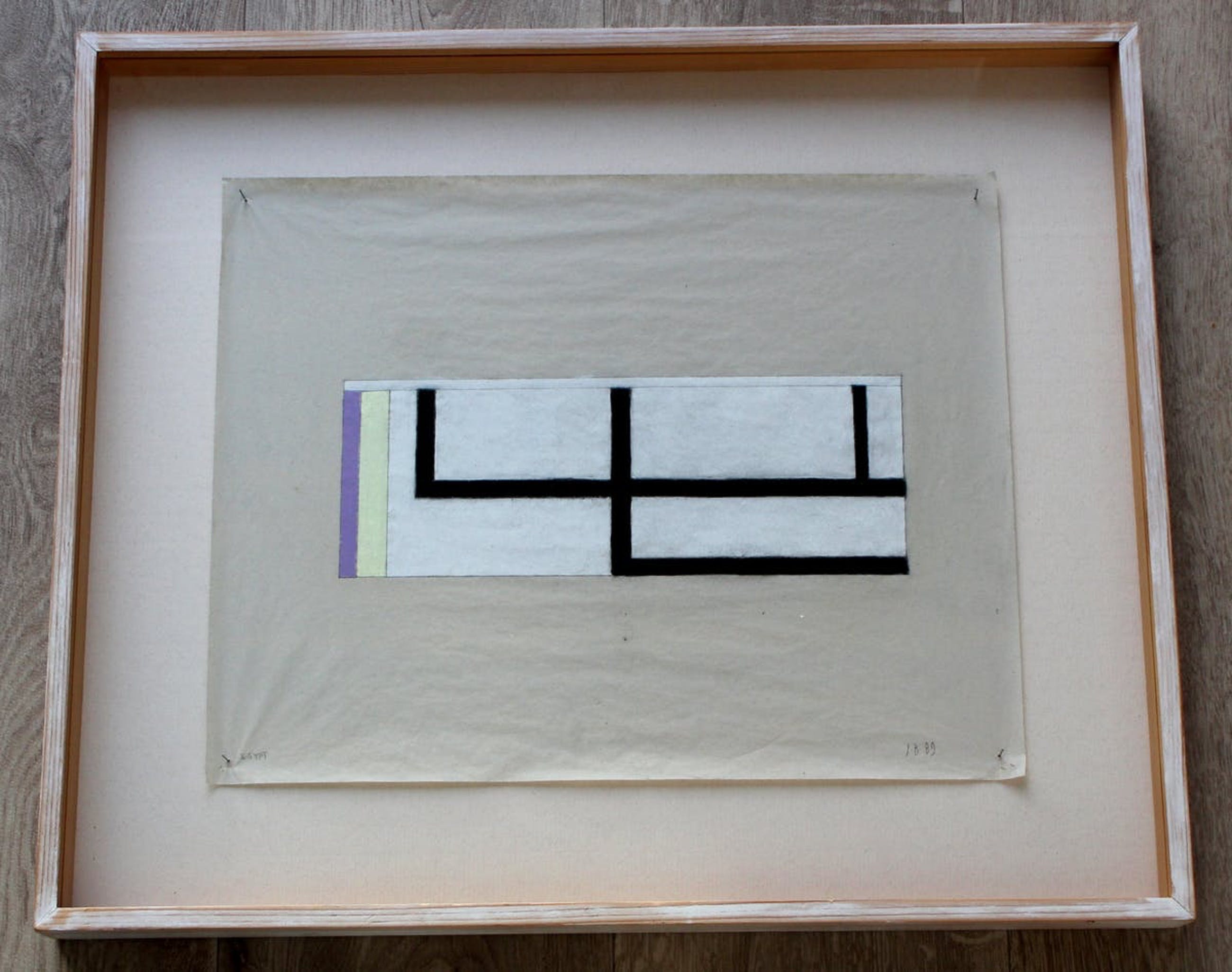 Krijttekening op papier van Jac Bisschops. Geometrische compositie. Jaar: 1989. Afmetingen incl lijst: H48 x b57cm. Afmetingen voorstelling: H11 x b29cm. Het werk is op de hoeken bevestigd met kleine speldjes. Het werk is rechts onderaan gesigneerd door de kunstenaar. De authenticiteit van het aangeboden werk wordt volledig gegarandeerd. Een certificaat van echtheid kan, op aanvraag, worden gemaild.
