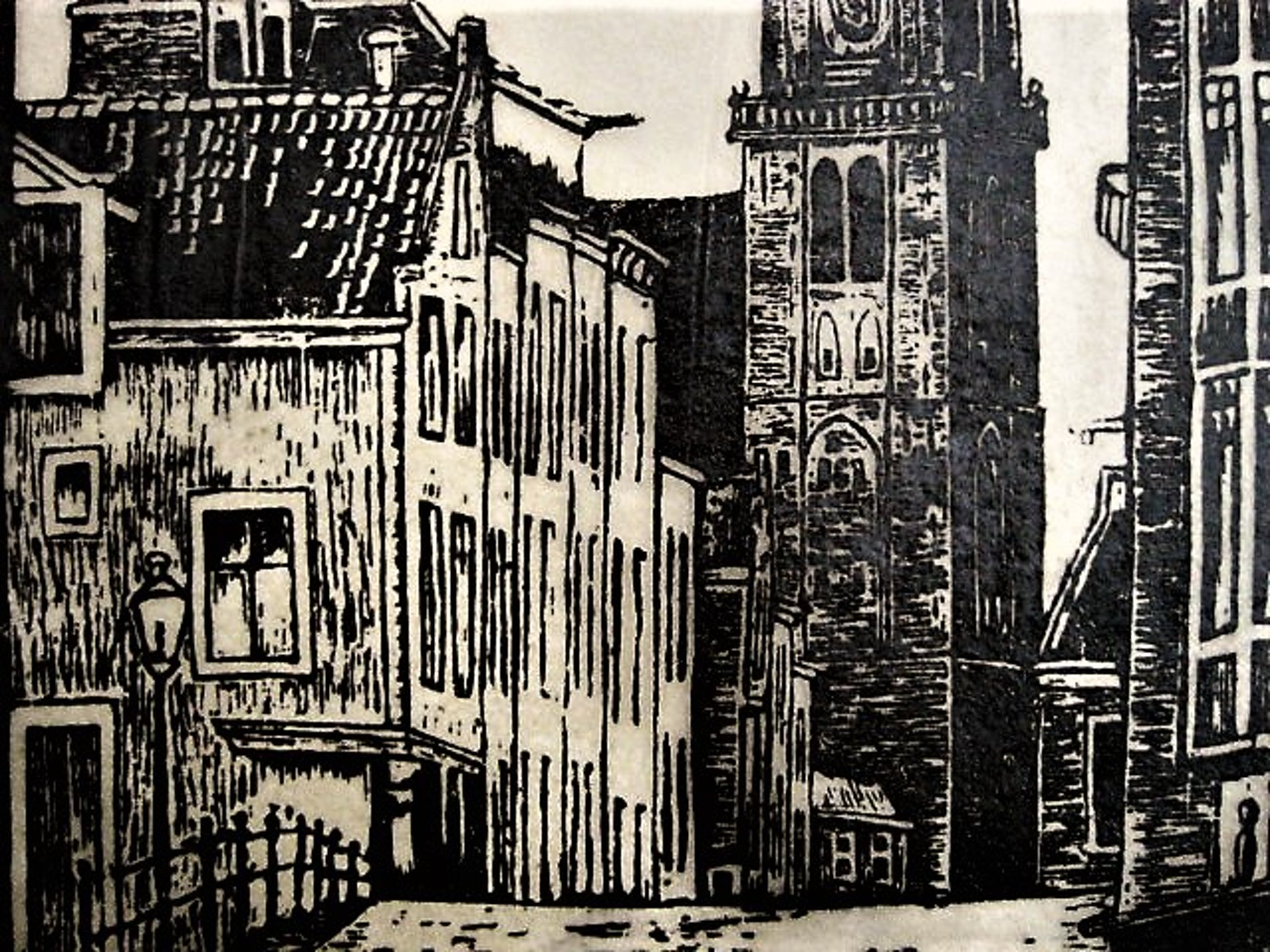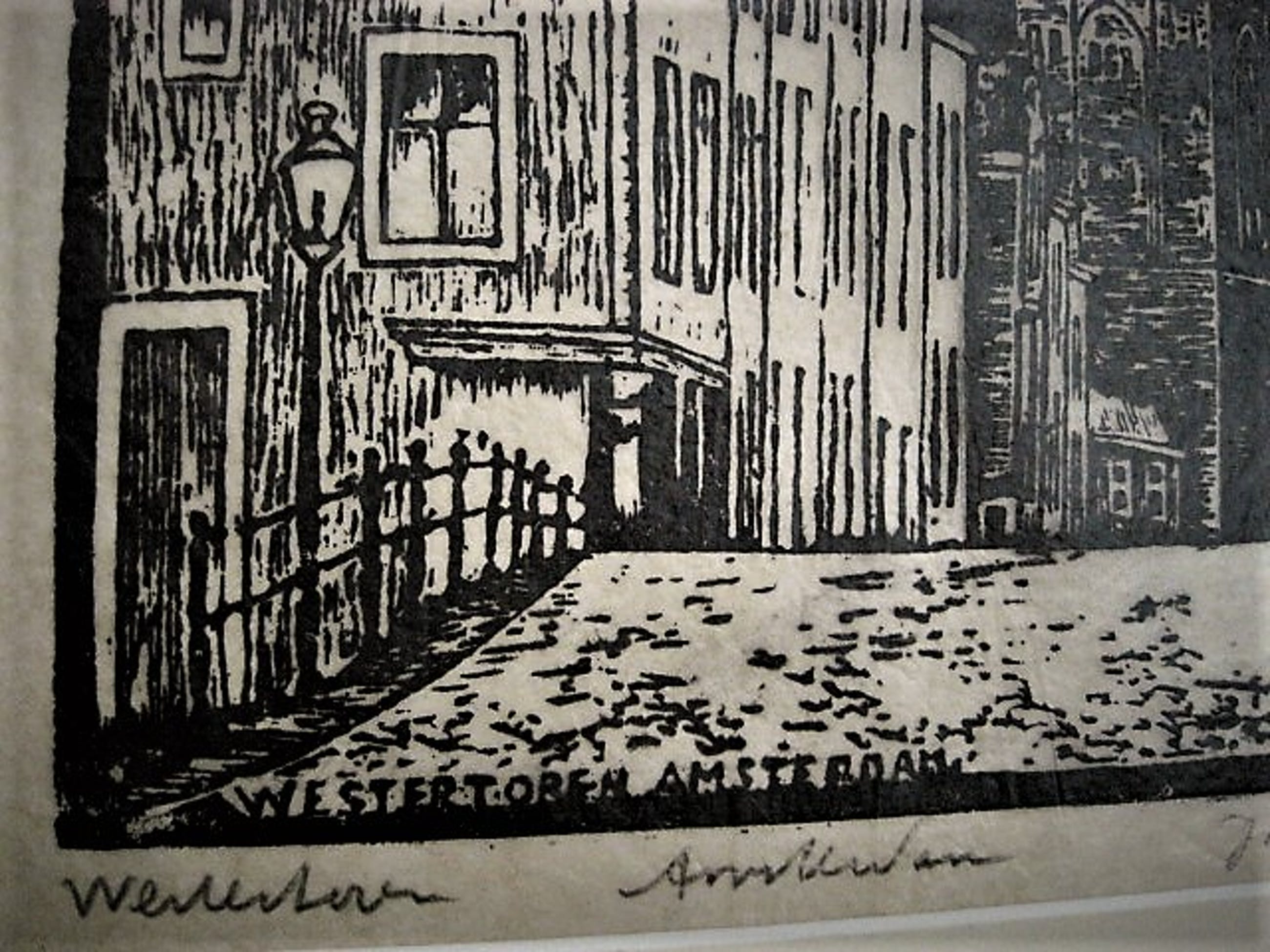 Gesigneerde Houtsnede die de bekende Friese graficus Jac de Beer maakte van de Amsterdamse Westertoren.