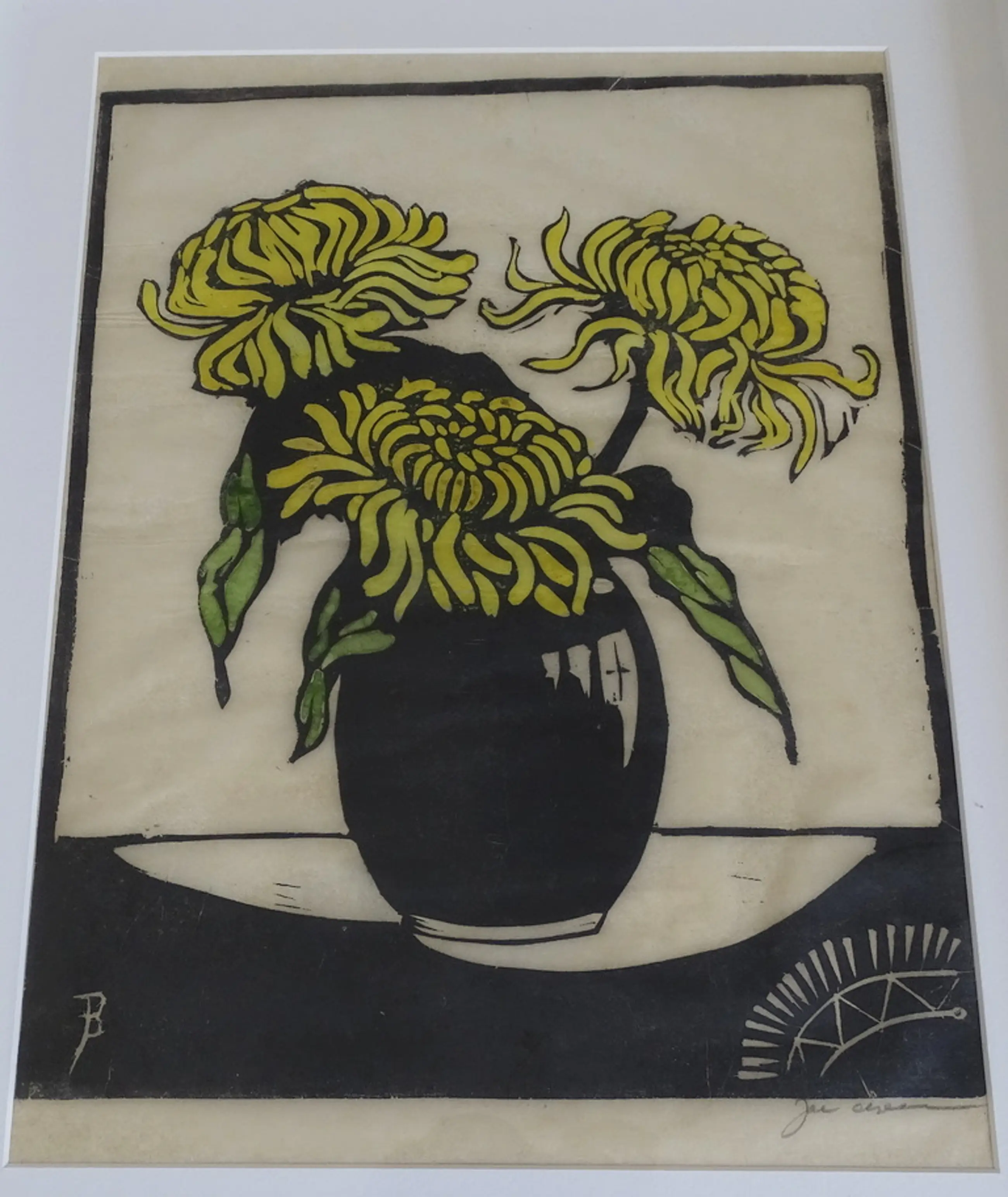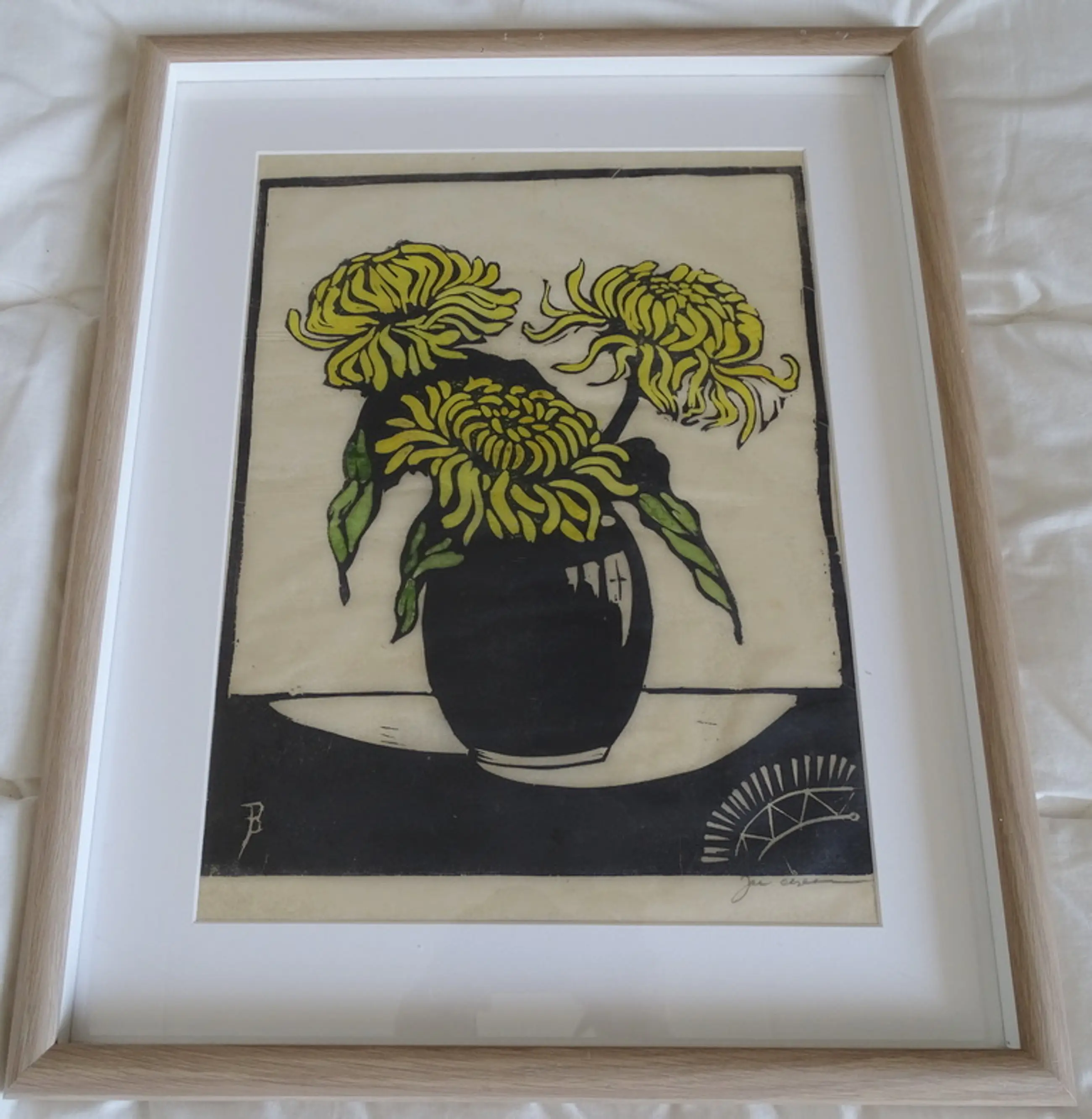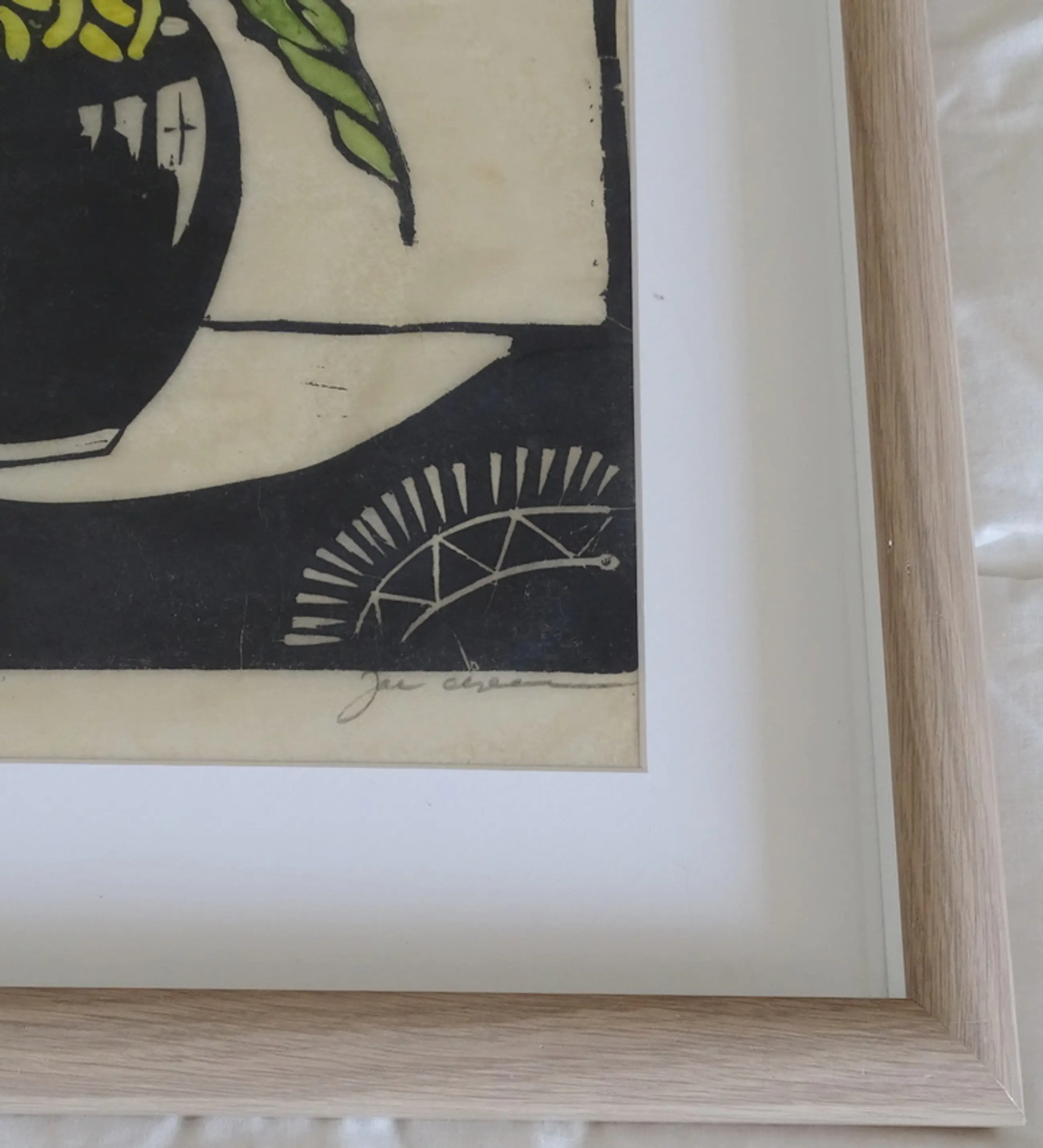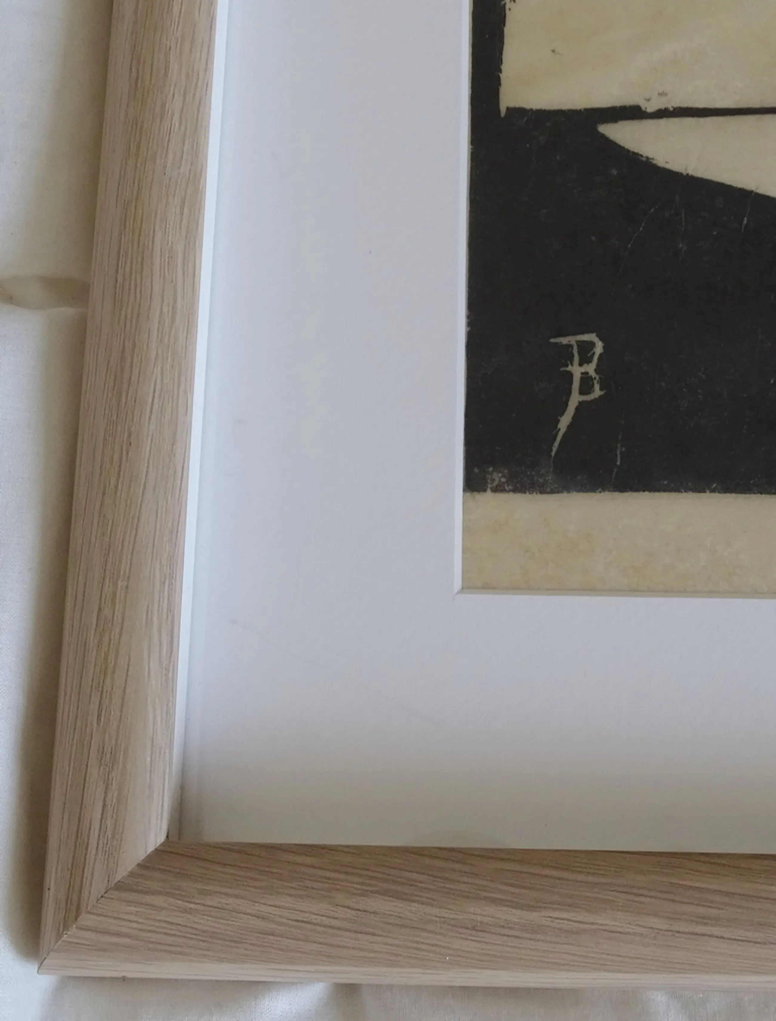 Fraaie ingelijste houtsnede van Jac de Beer (1888-1946), afgedrukt op dun Japans 'rijstpapier'. Het werk is rechtsonder met potlood gesigneerd.