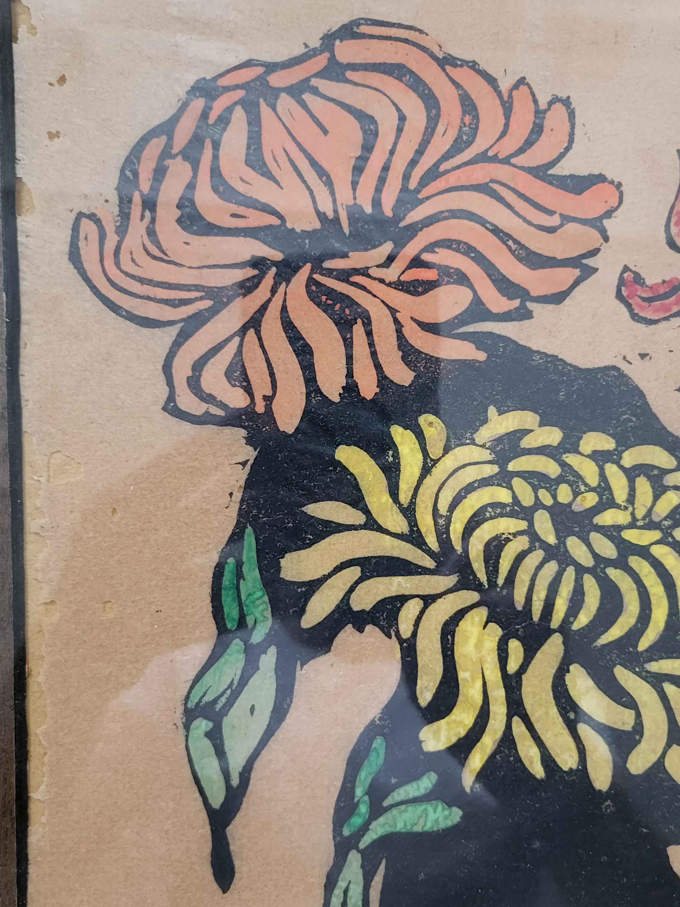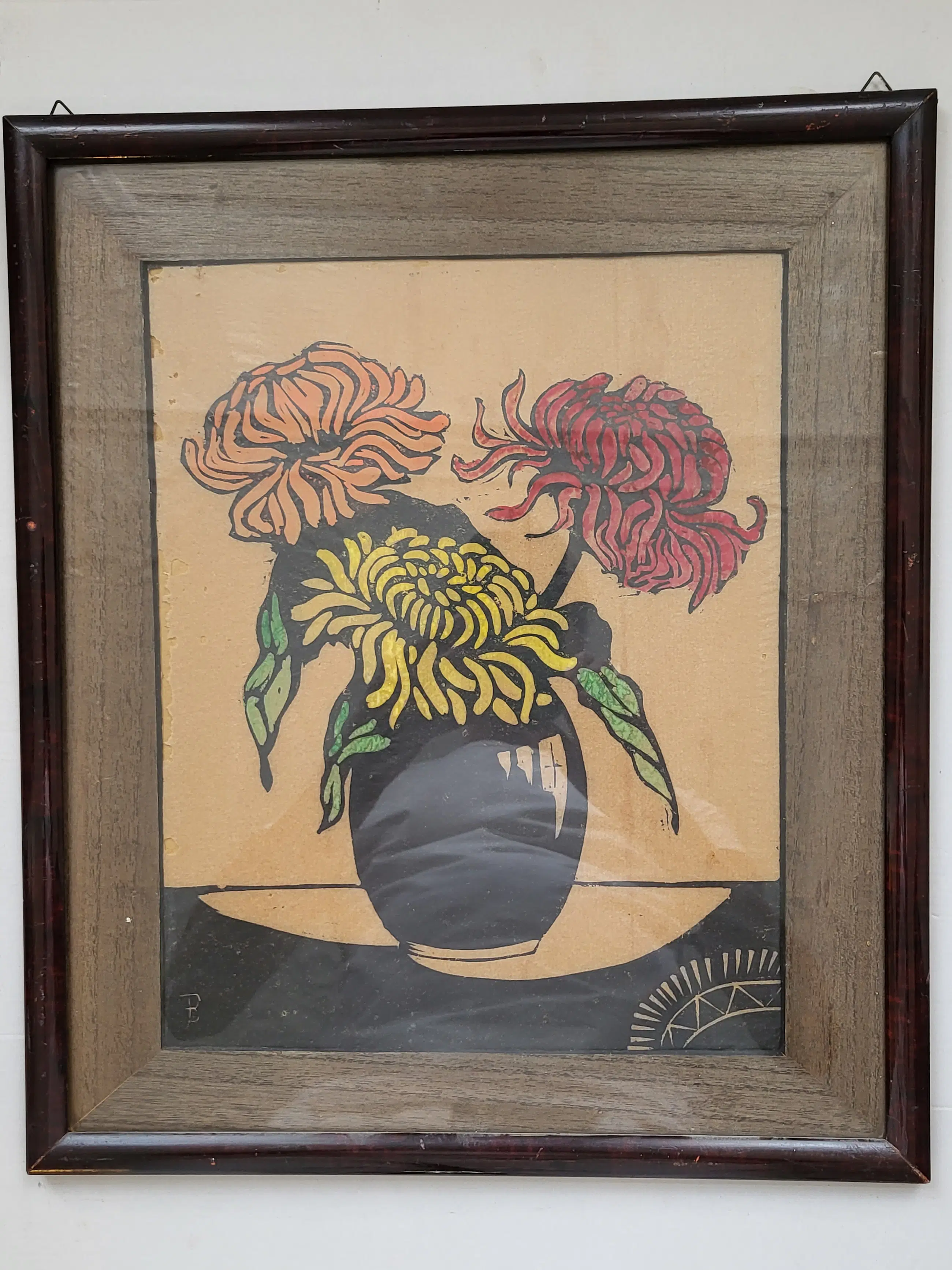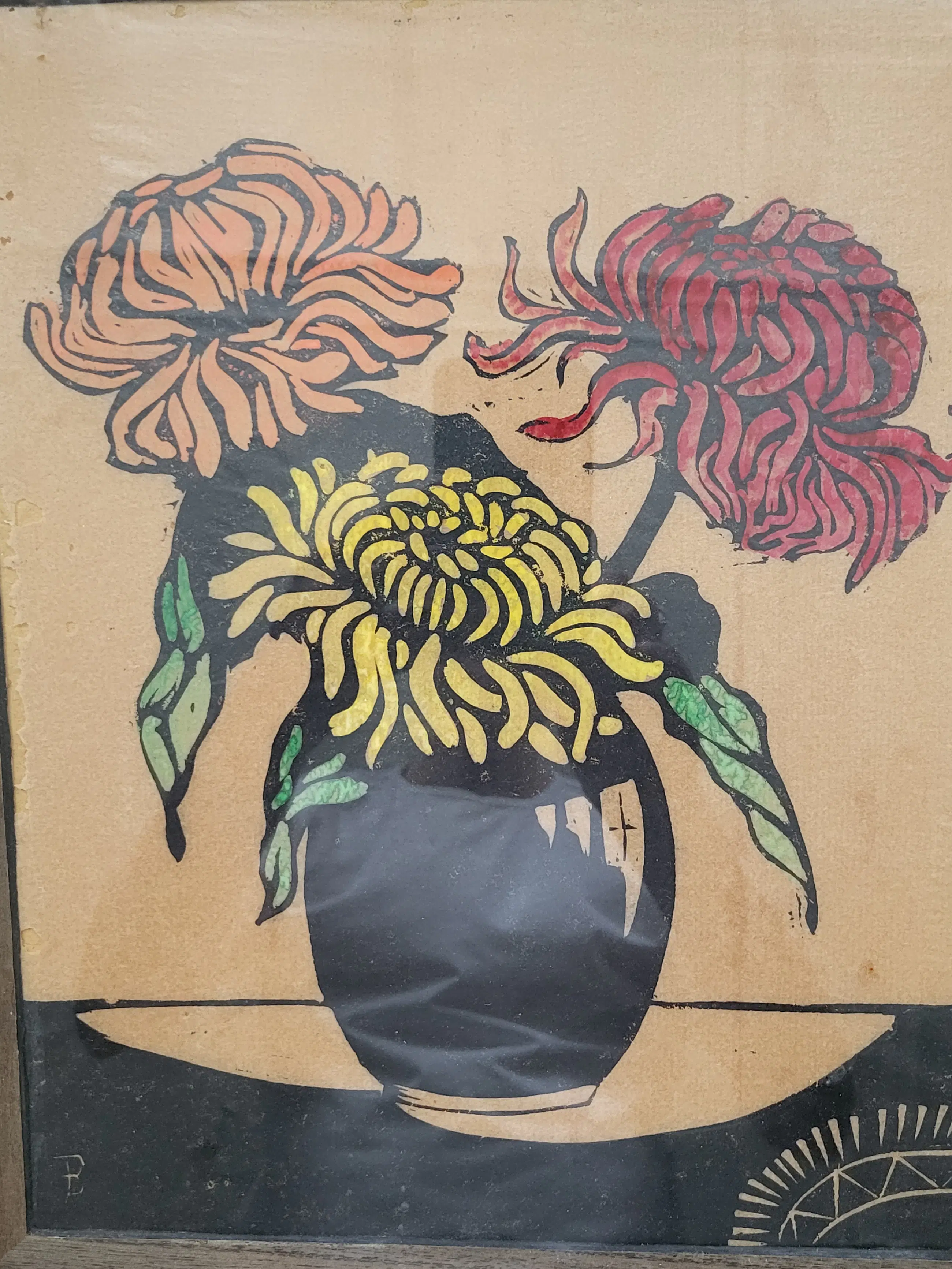 Fraaie ingelijste houtsnede van Jac de Beer (1888-1946), afgedrukt op dun Japans 'rijstpapier'. Het werk is linksonder gesigneerd met een grote B.