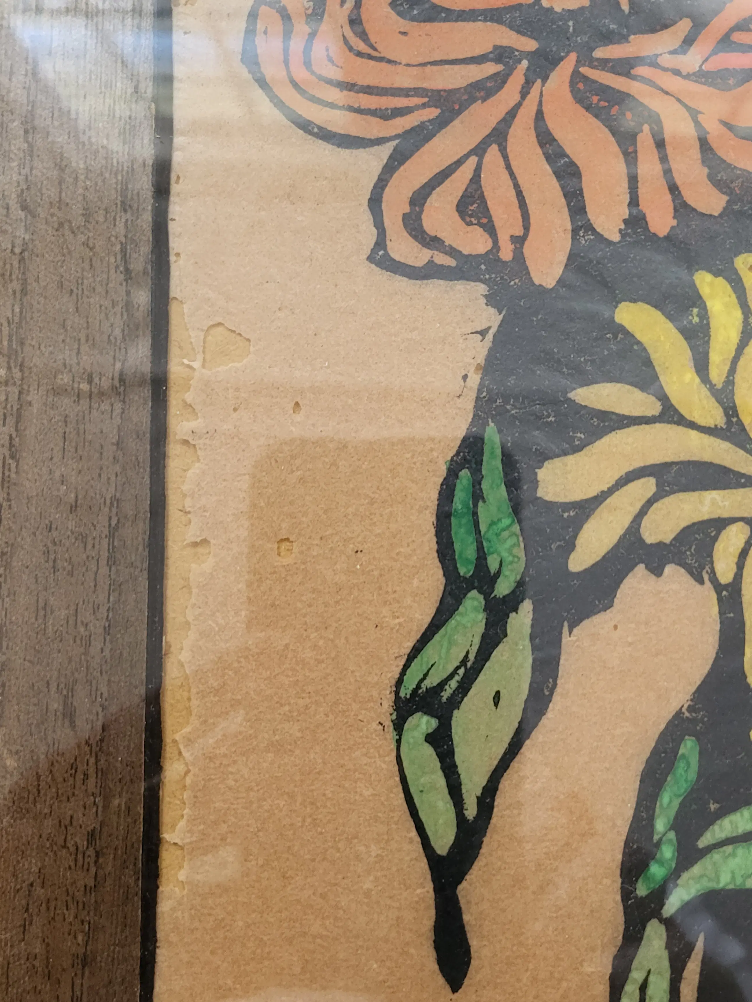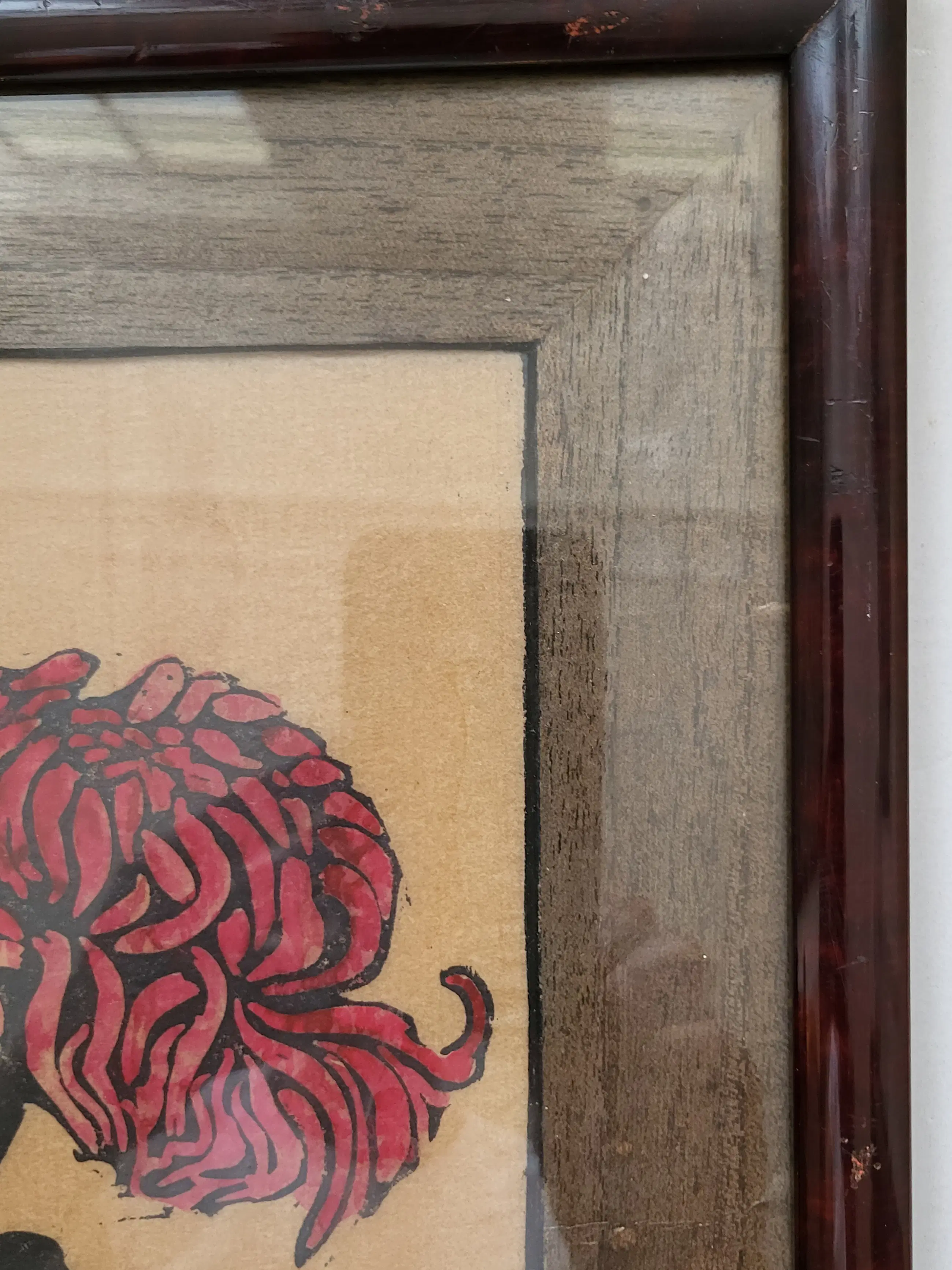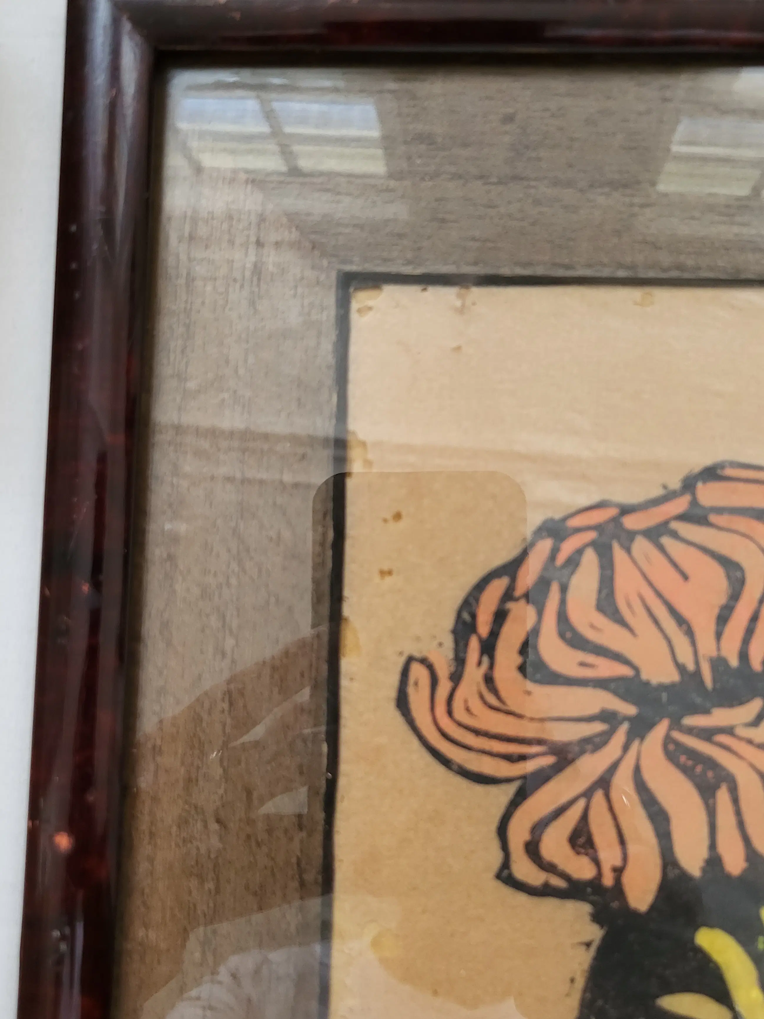 In mooie lijst en houten passe-partout uit de tijd. De houtsnede zelf is in mooie conditie, maar aan de linker rand is het papier 'opgegeten', zie foto's