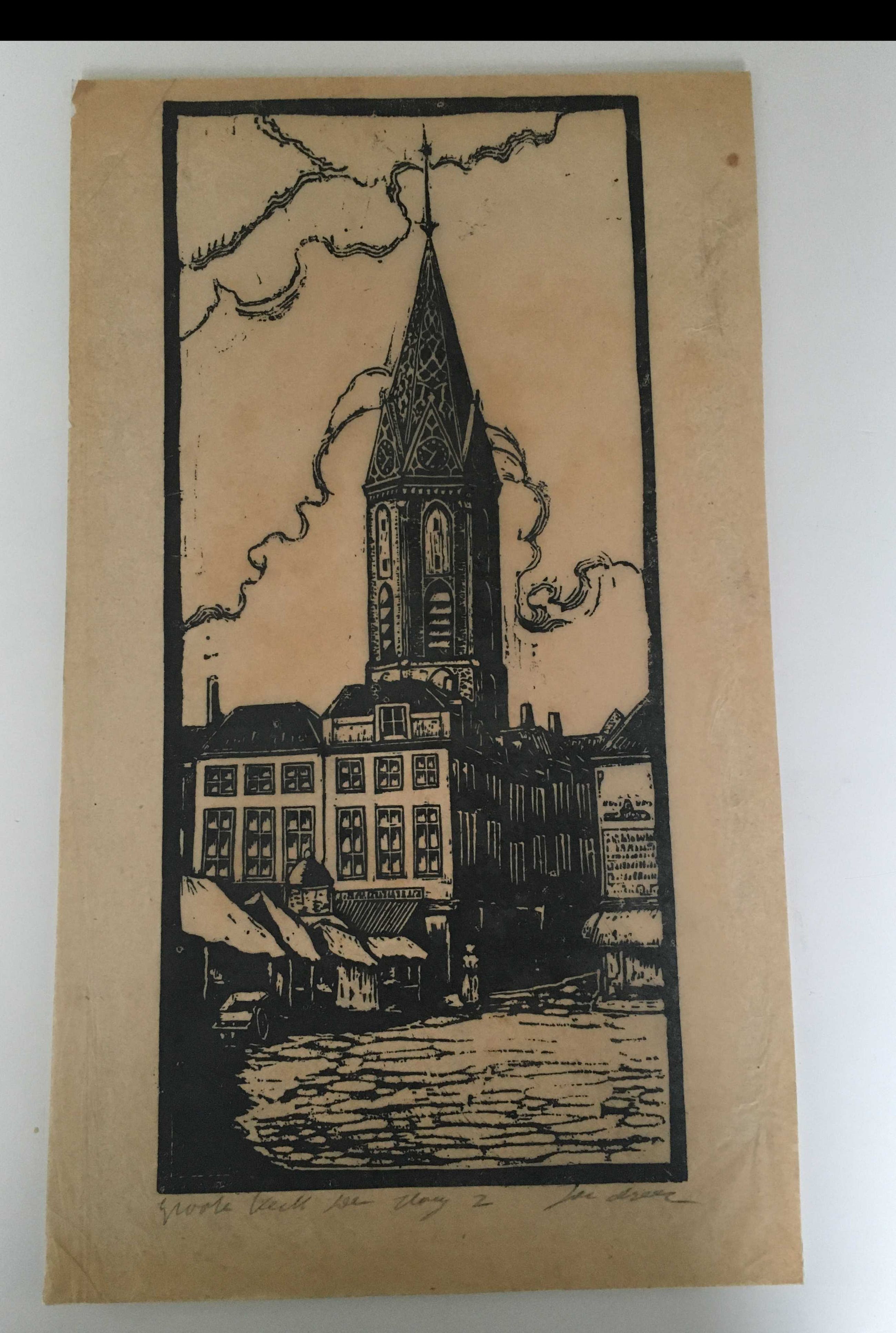Karakteristieke houtsnede van Jac de Beer, Friese graficus. Was gespecialiseerd in voorstellingen van dieren, dorpsgezichten, landschappen, stadsgezichten en stillevens. Gebruikte als techniek houtsnede/linoleumsnede. Zijn werk is opgenomen in de collectie van het Scheepvaartmuseum te Sneek. Zie ook de andere aanbiedingen.