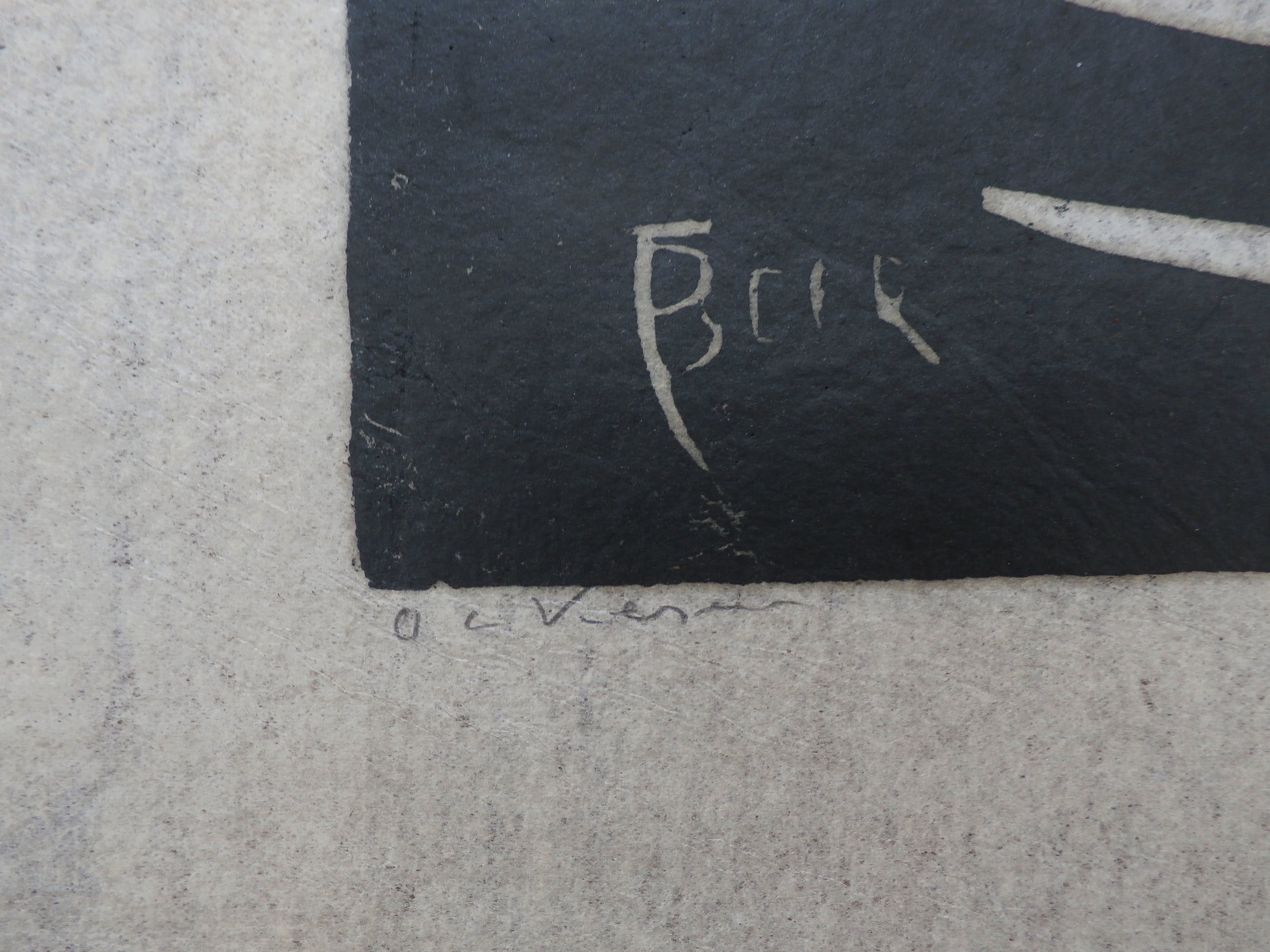 Houtsnede van Jac. de Beer. Titel: Bloemen in groene vaas. Afmetingen blad: H33 x B43 cm. Afmetingen voorstelling: H22 x b26 cm. Het werk is, rechtsonder, met potlood gesigneerd. De authenticiteit van het aangeboden werk wordt voor 100% gegarandeerd. Een certificaat van echtheid kan, op aanvraag, worden meegestuurd.