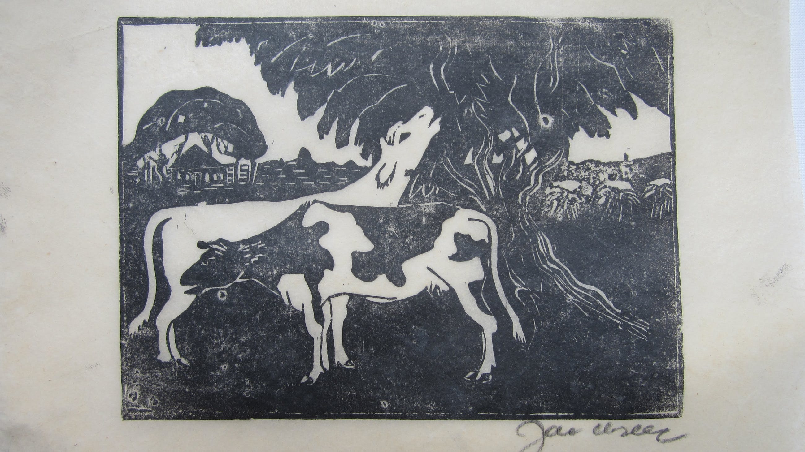 De houtsnede heeft altijd in een map gelegen. Het papier is gelijkmatig verkleurd. De verf is helder gebleven.