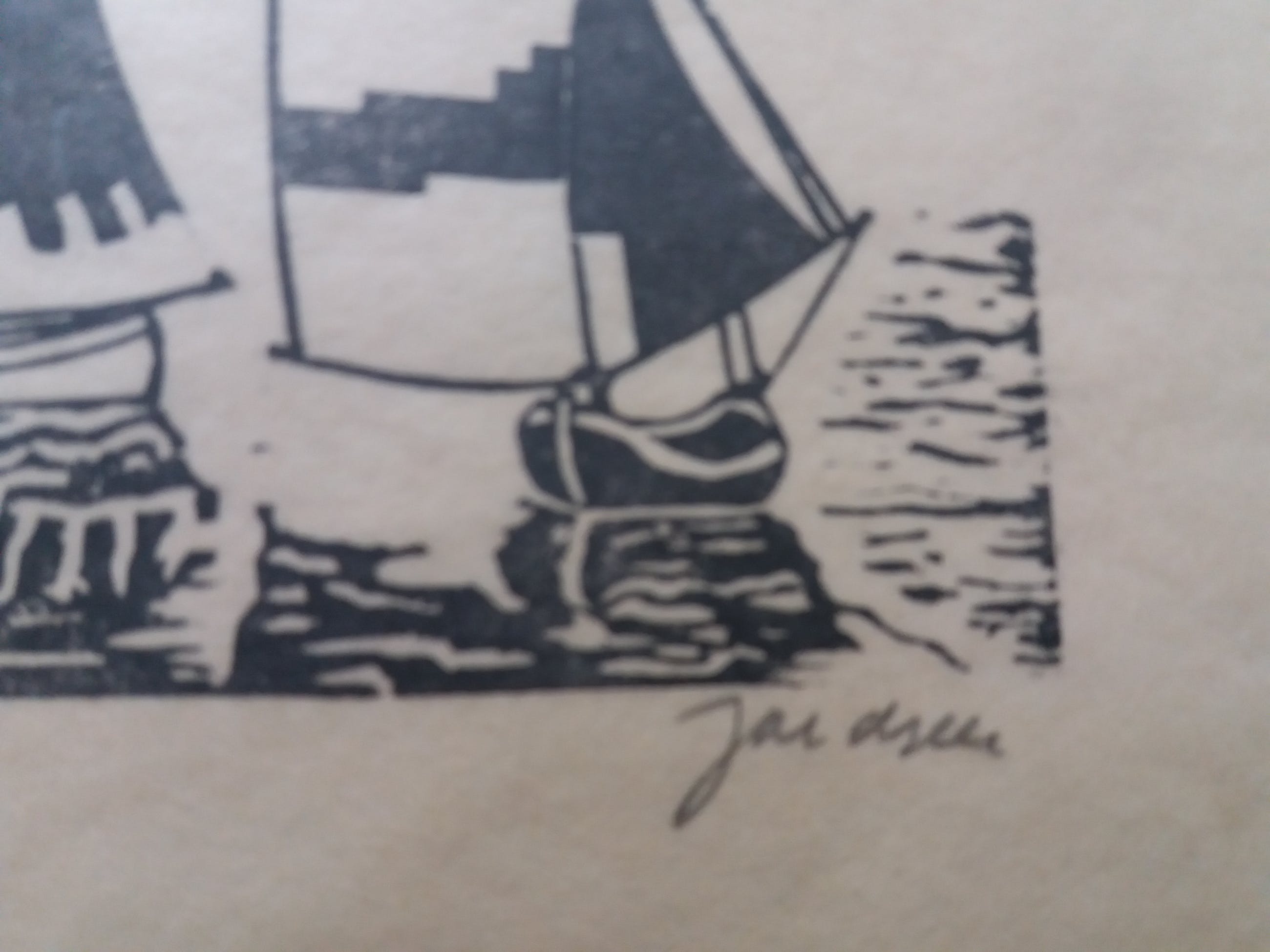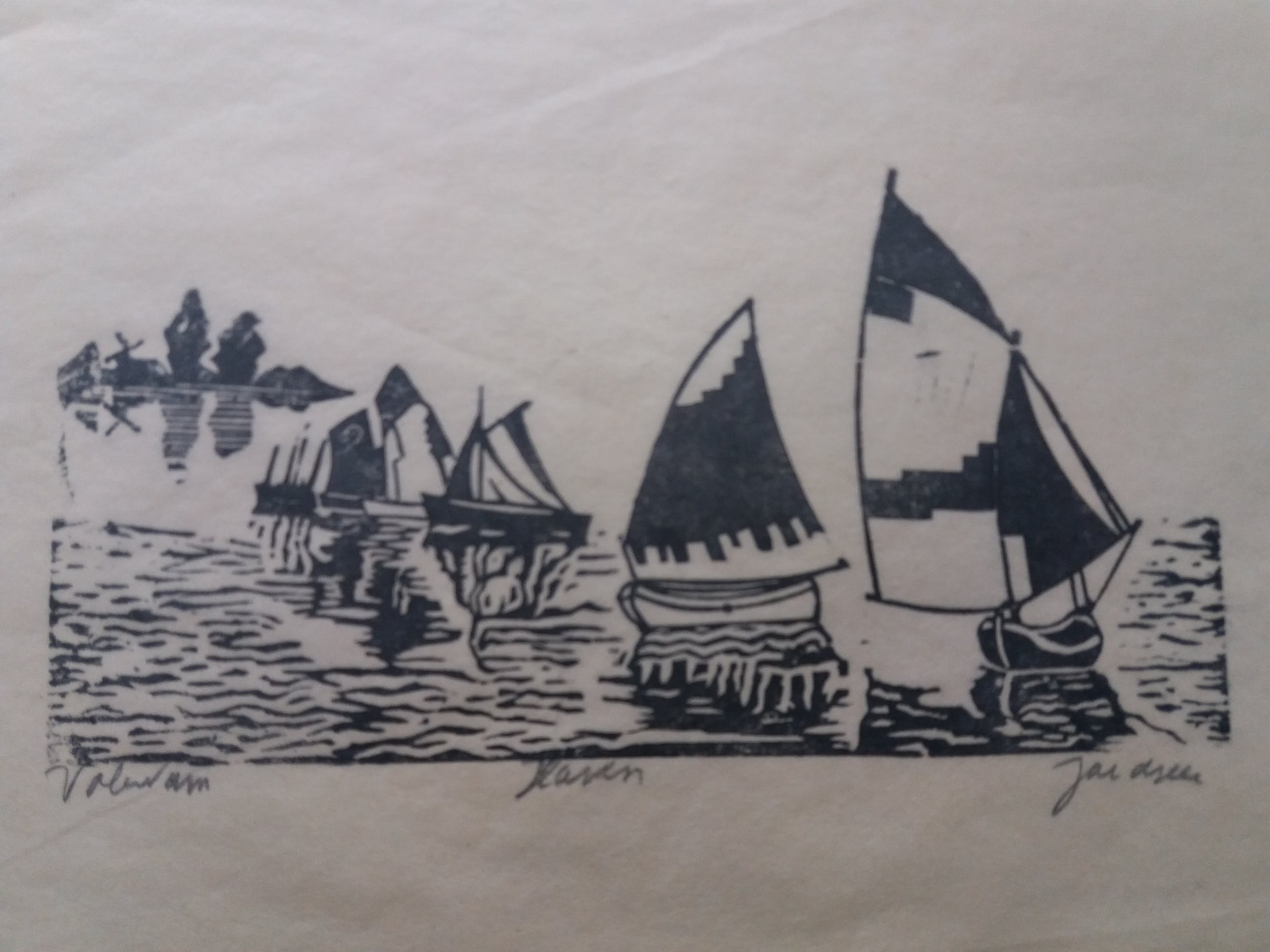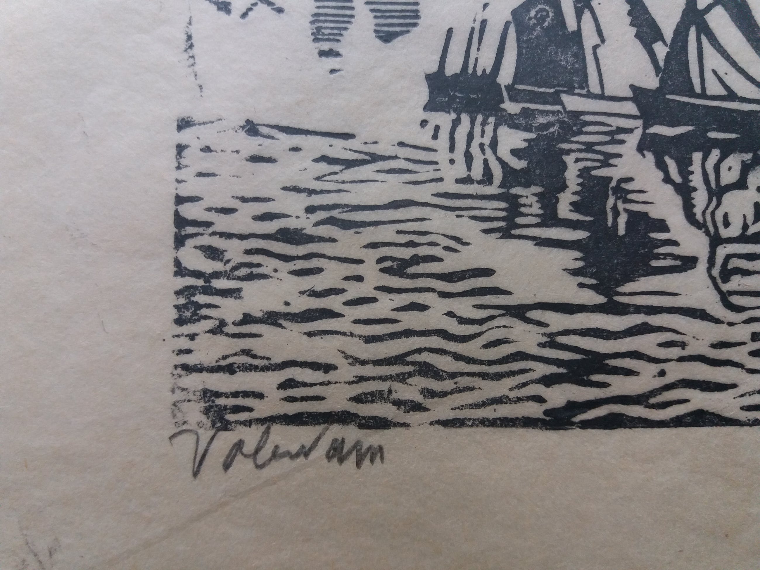 Fijn uitgewerkte houtsnede van haven van Volendam. Houtsnede komt uit map met werk van Jac. de Beer. Binnenmaat beeld ongeveer 22 x 13 cm.