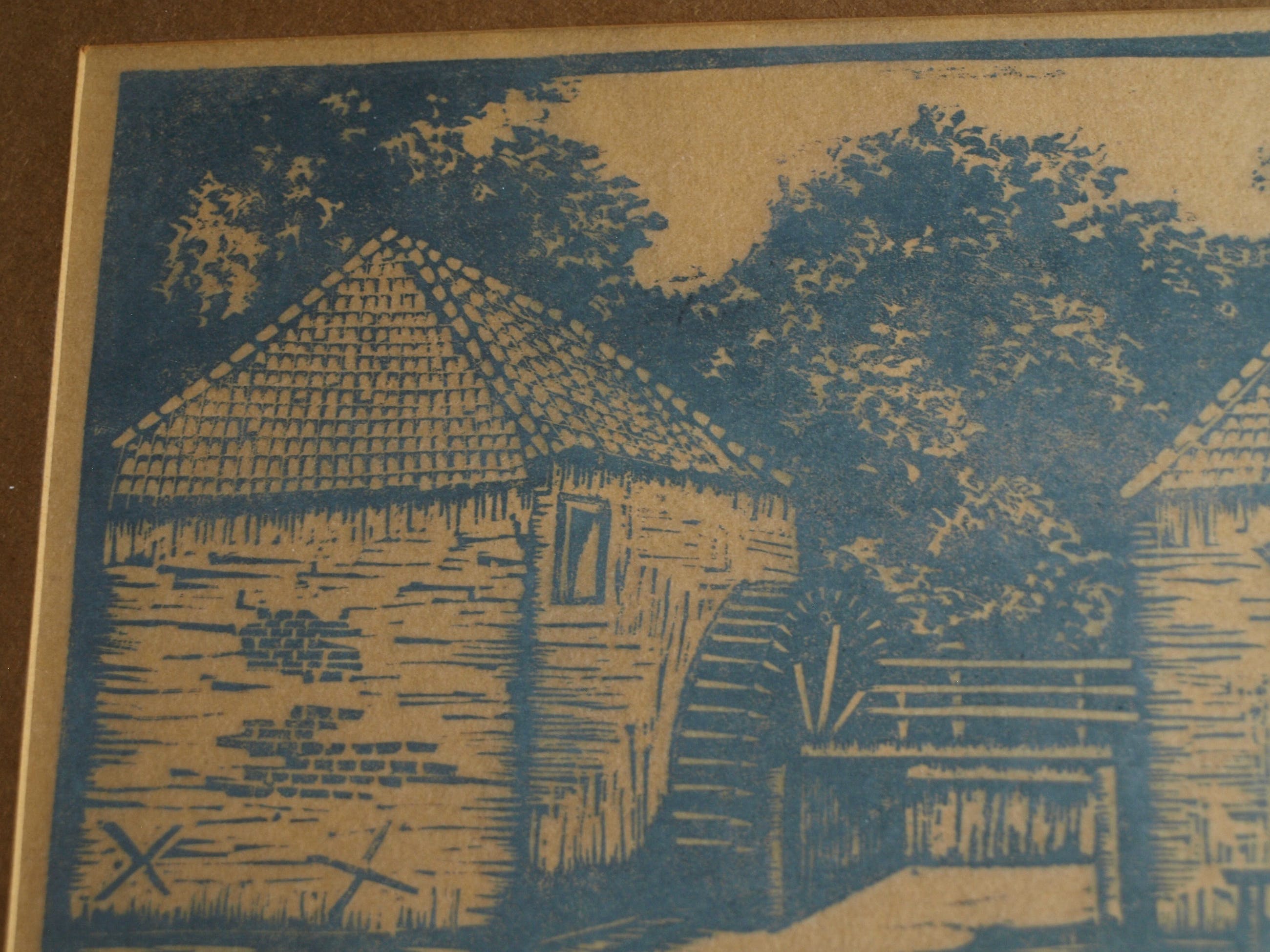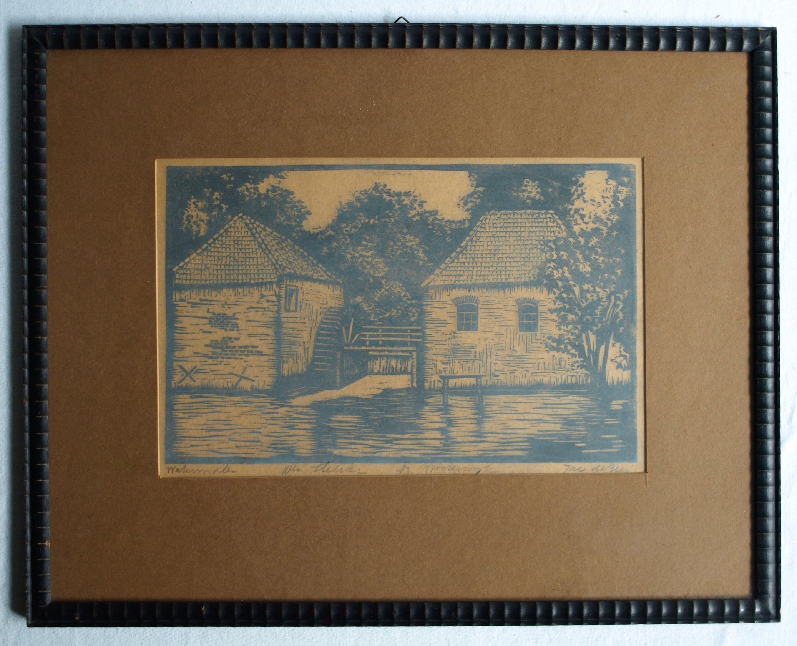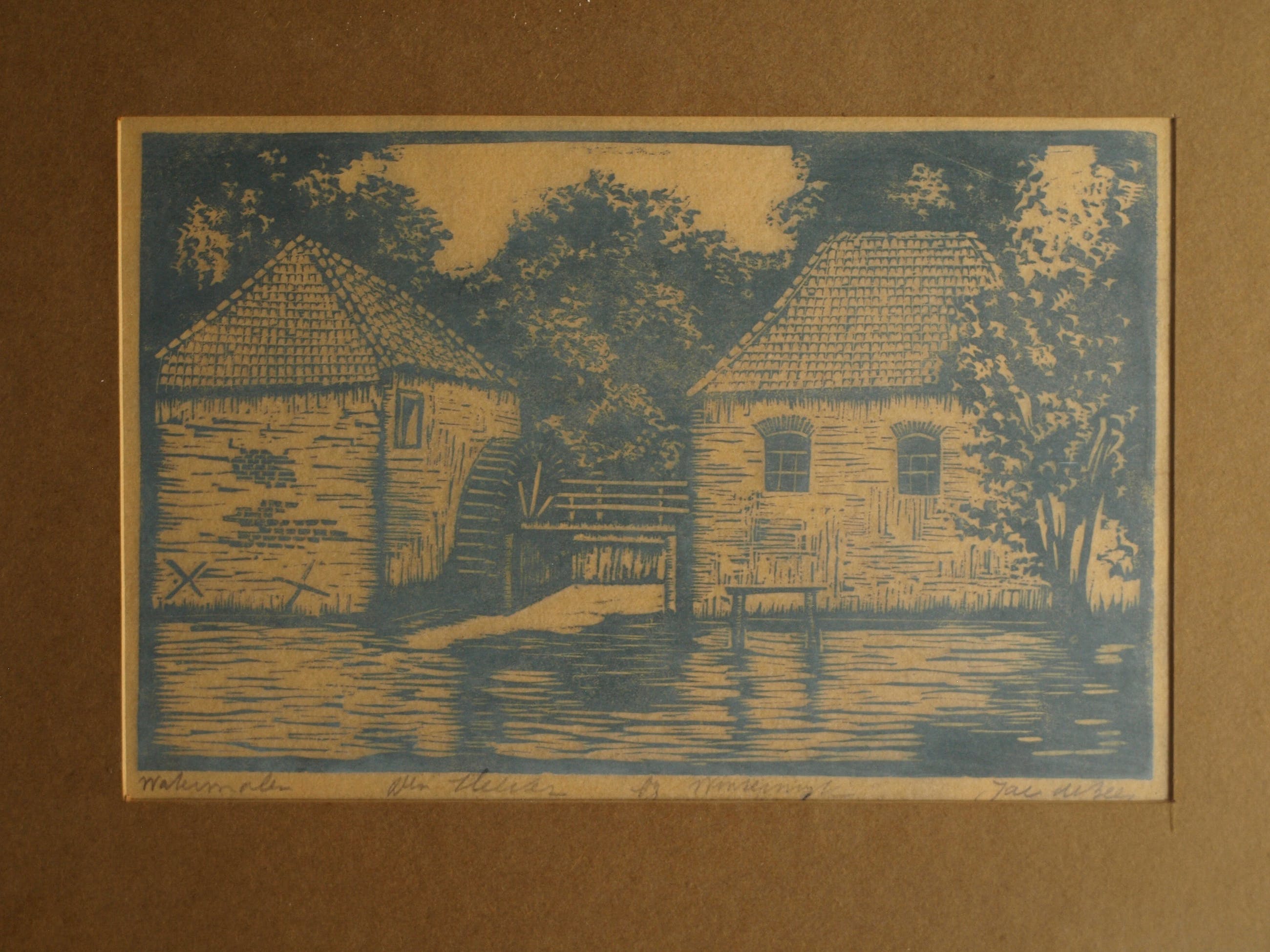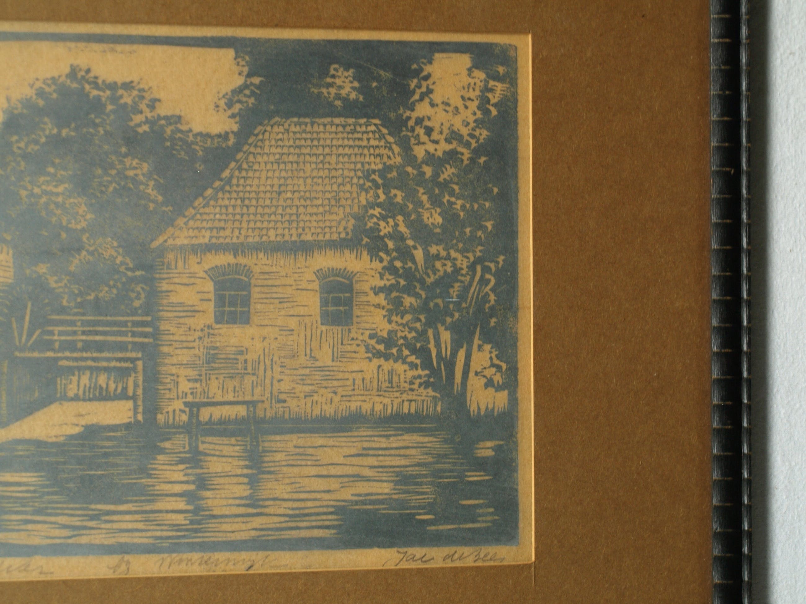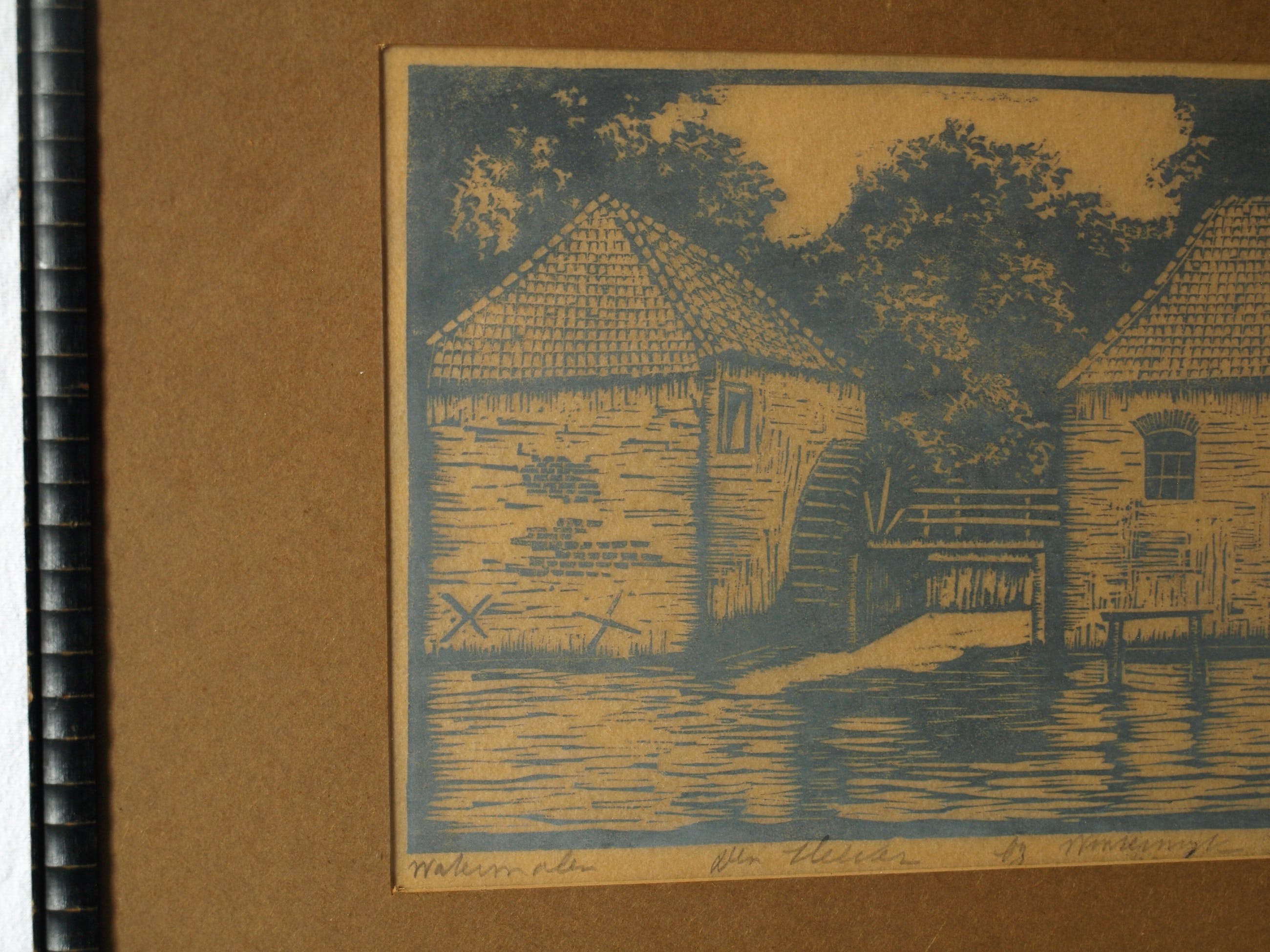 Een ingelijste houtsnede uit ca. 1935 van de Nederlandse kunstenaar Jac. de Beer (1888-1946), met een voorstelling van de Watermolen ‘Den Helder’ bij Winterswijk.