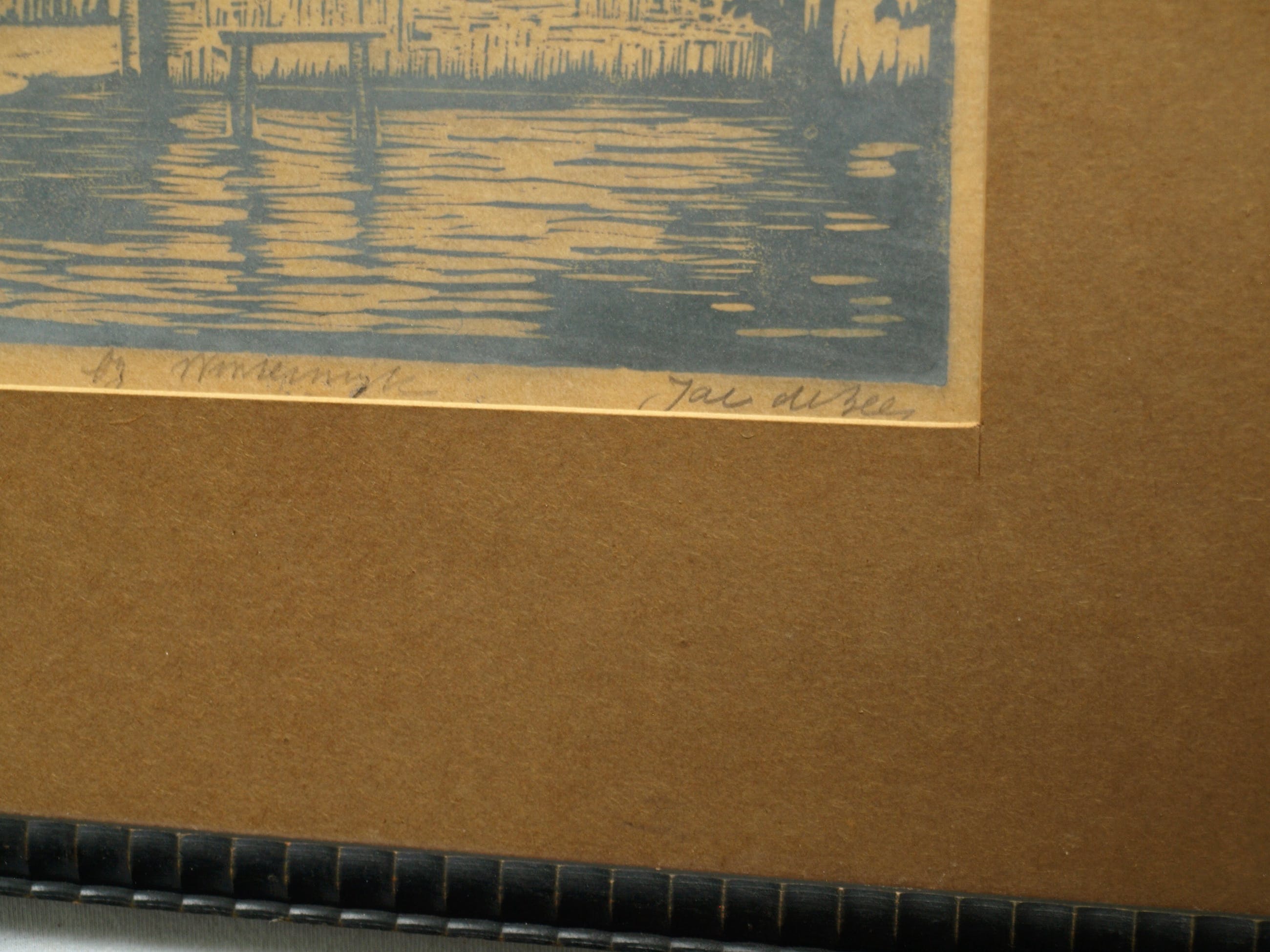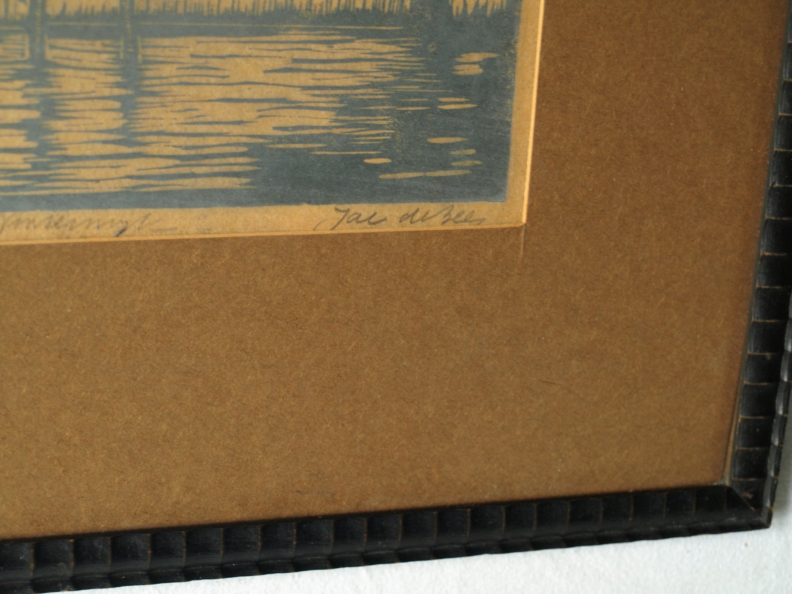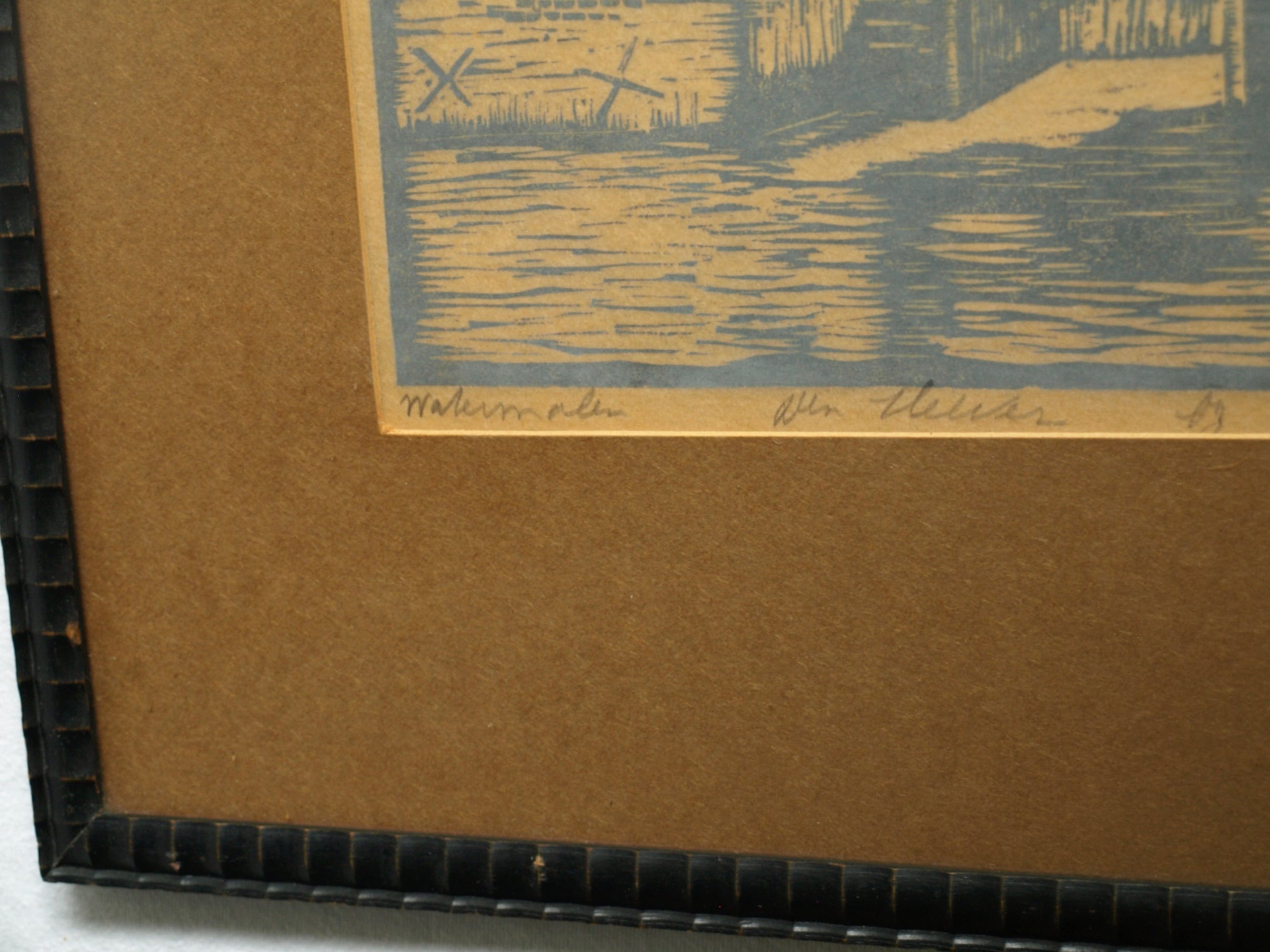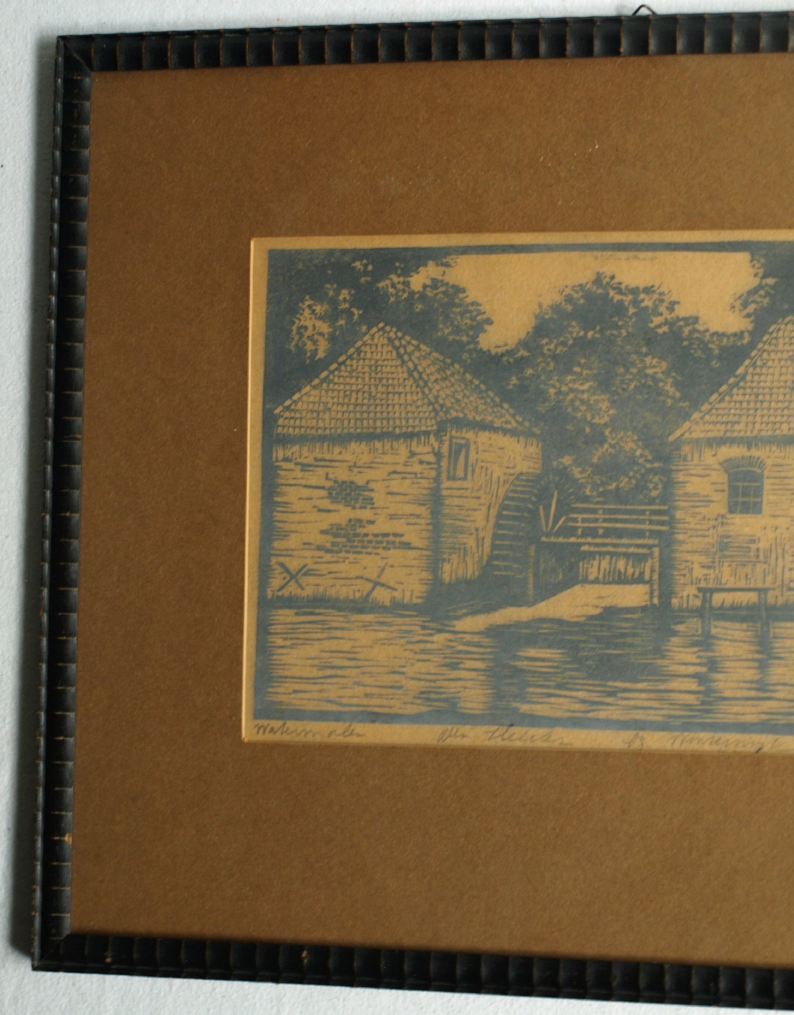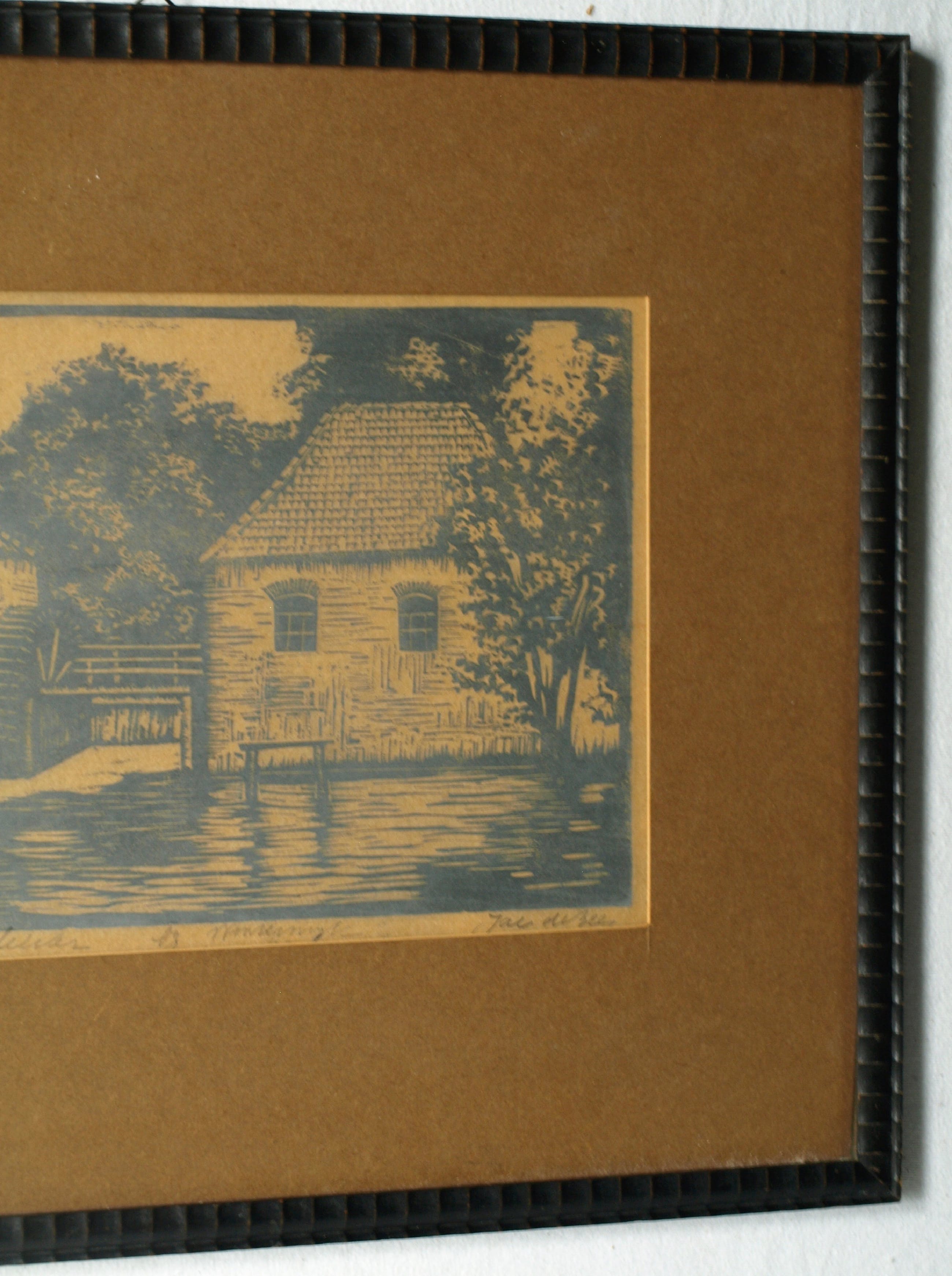 Een ingelijste houtsnede uit ca. 1935 van de Nederlandse kunstenaar Jac. de Beer (1888-1946), met een voorstelling van de Watermolen ‘Den Helder’ bij Winterswijk.