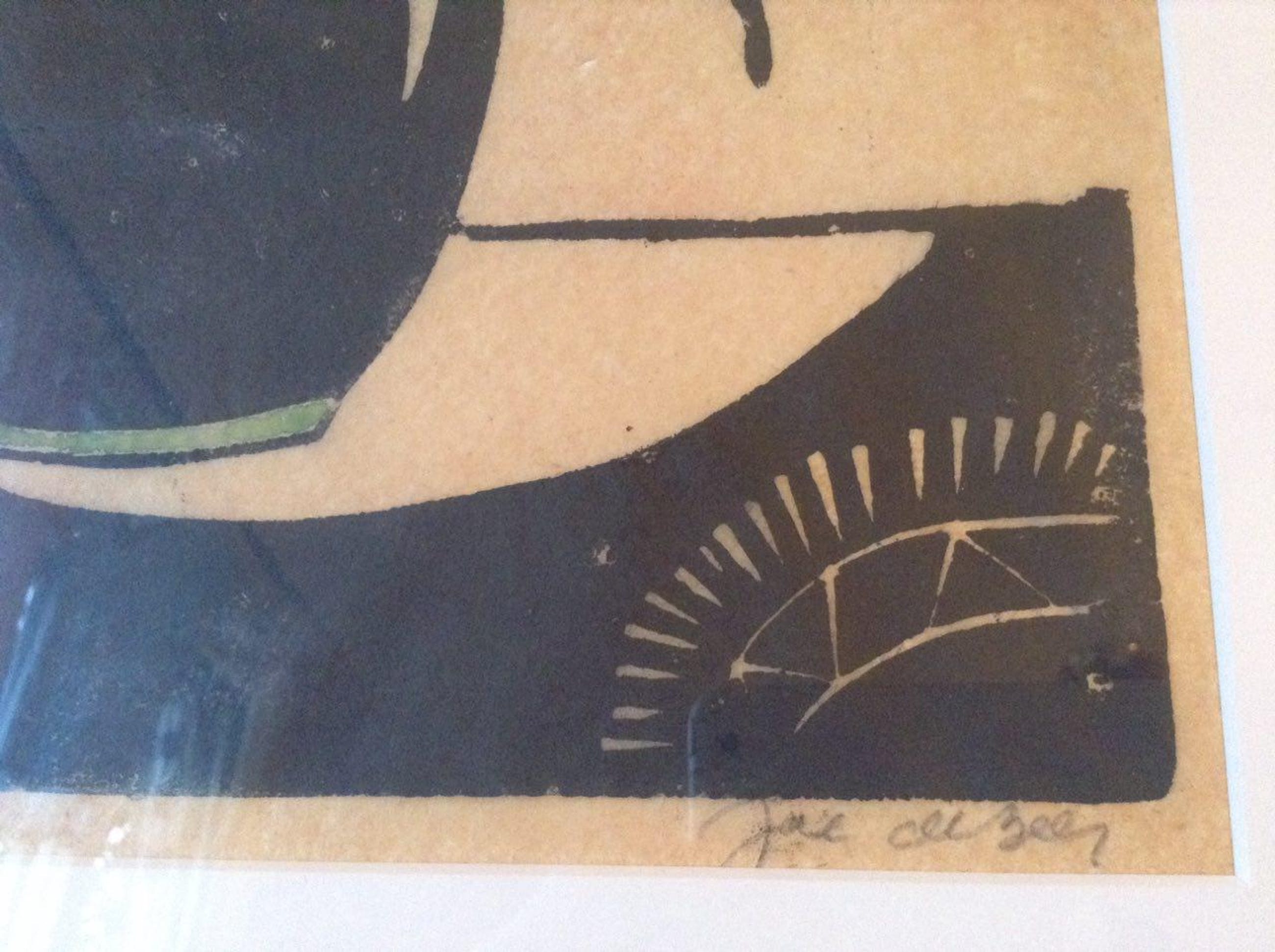 Jac de Beer 1880-1946 Houtsnede/linosnede Bloemen in vaas 30x30lijst 44x47, mooie lijst gesigneerd RO met potlood en monogram LO50 euro
