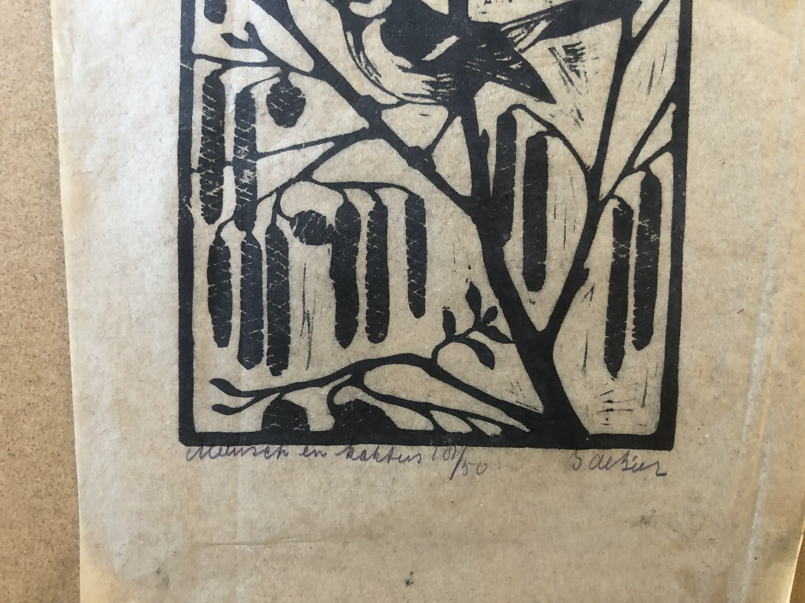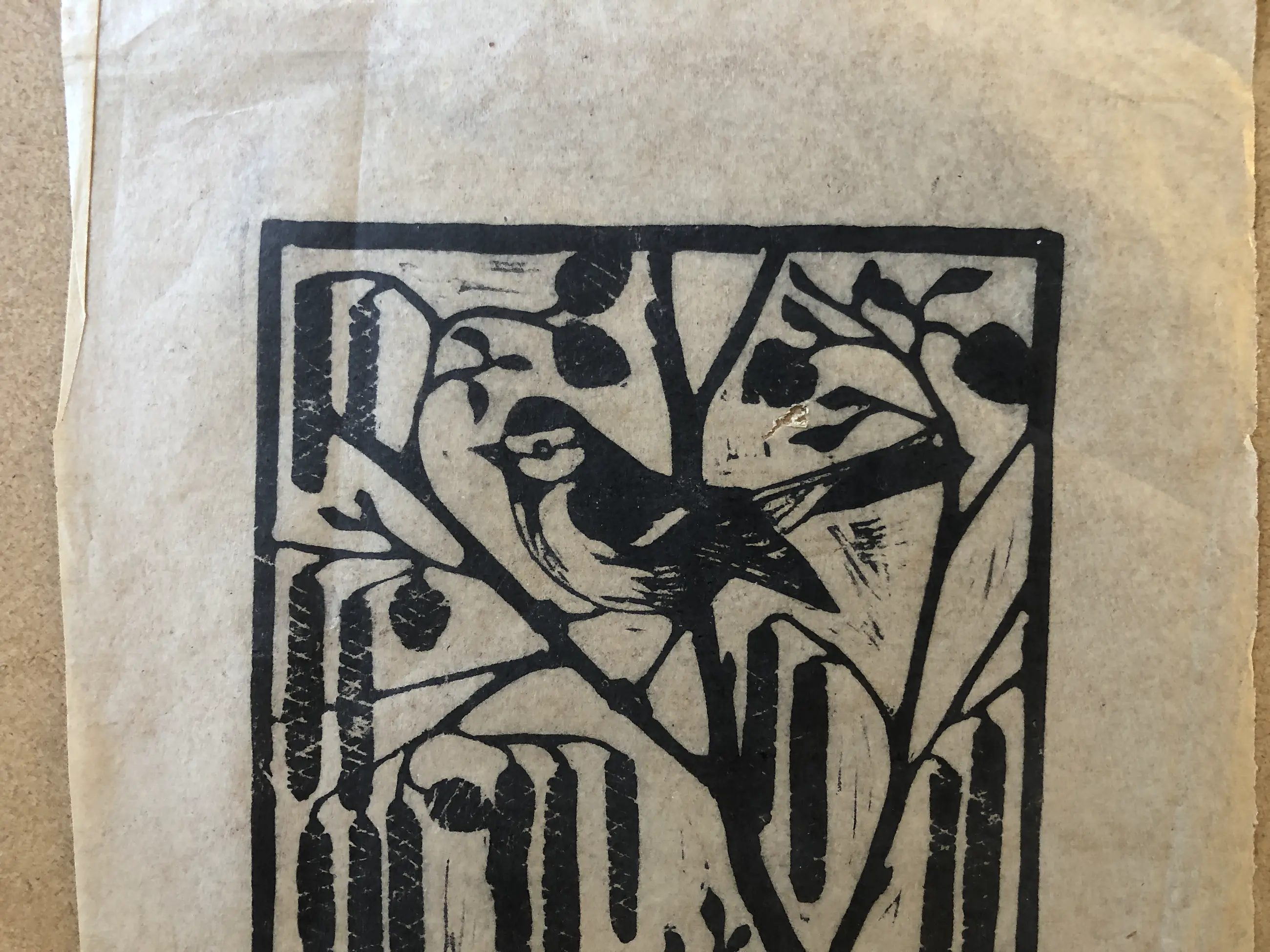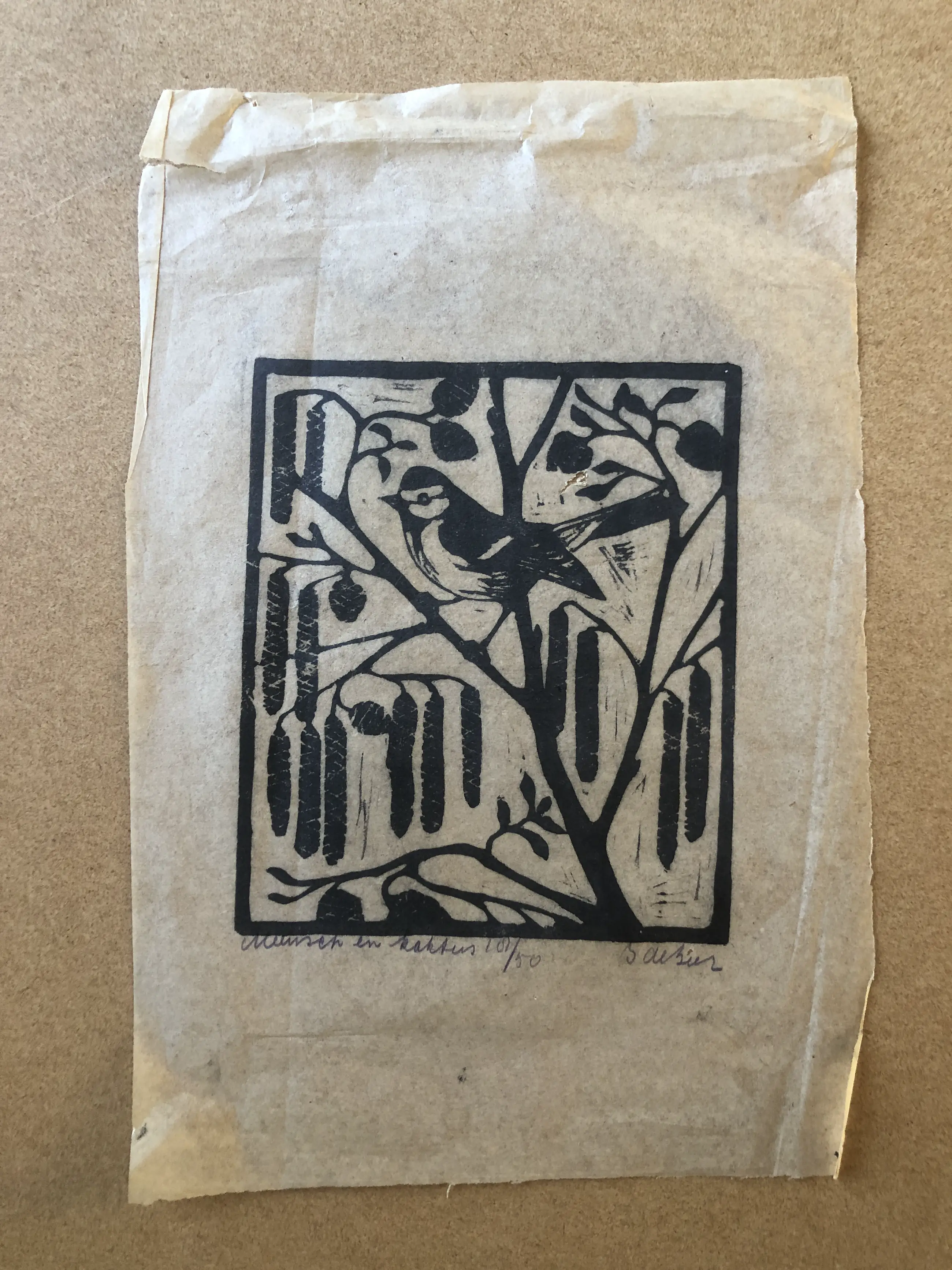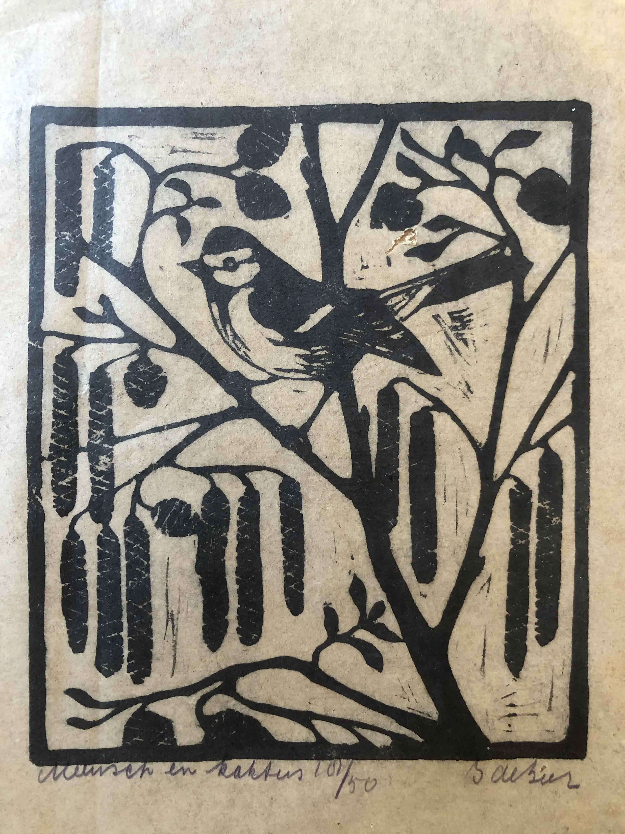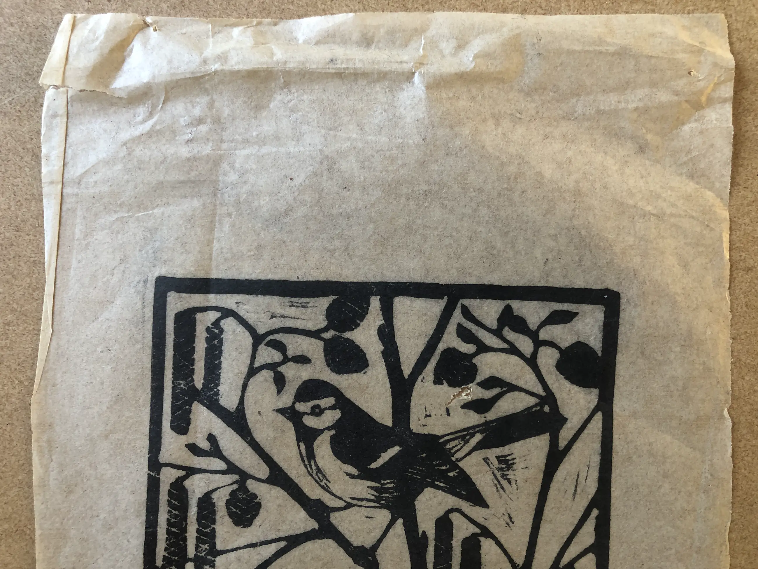 Boven de staart van het koolmees zit een gat in het papier. Bij het inlijsten een crèmekleurig papier achter plaatsen.