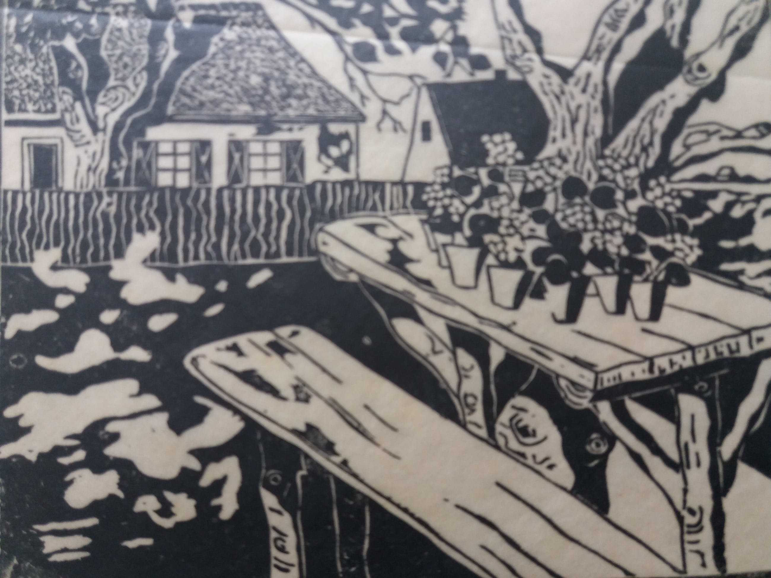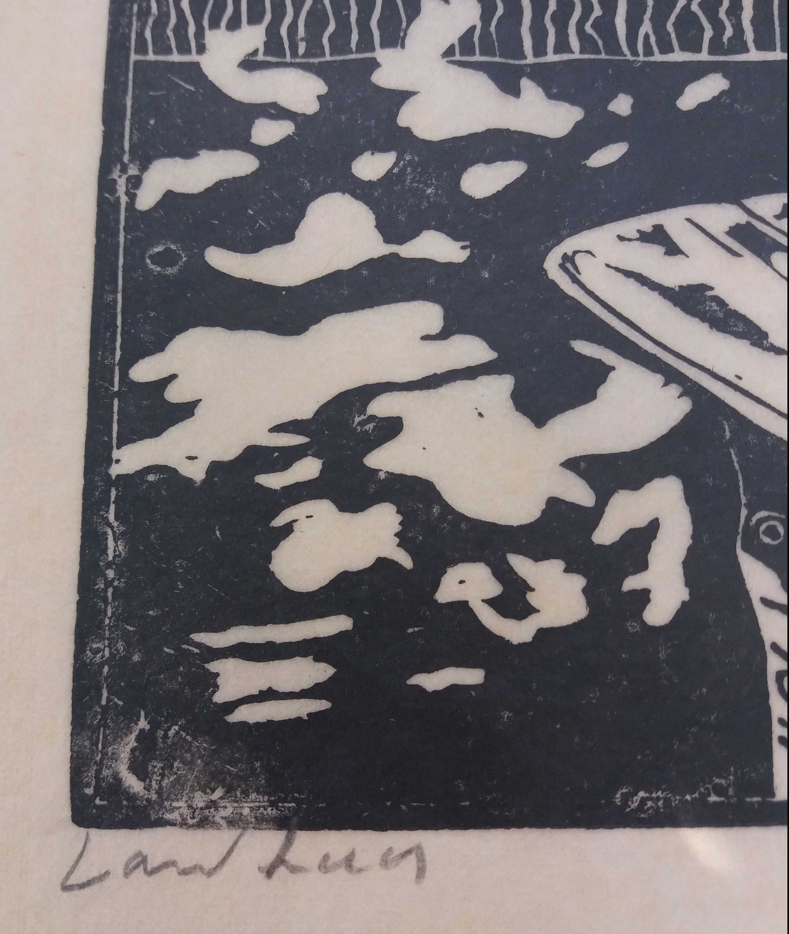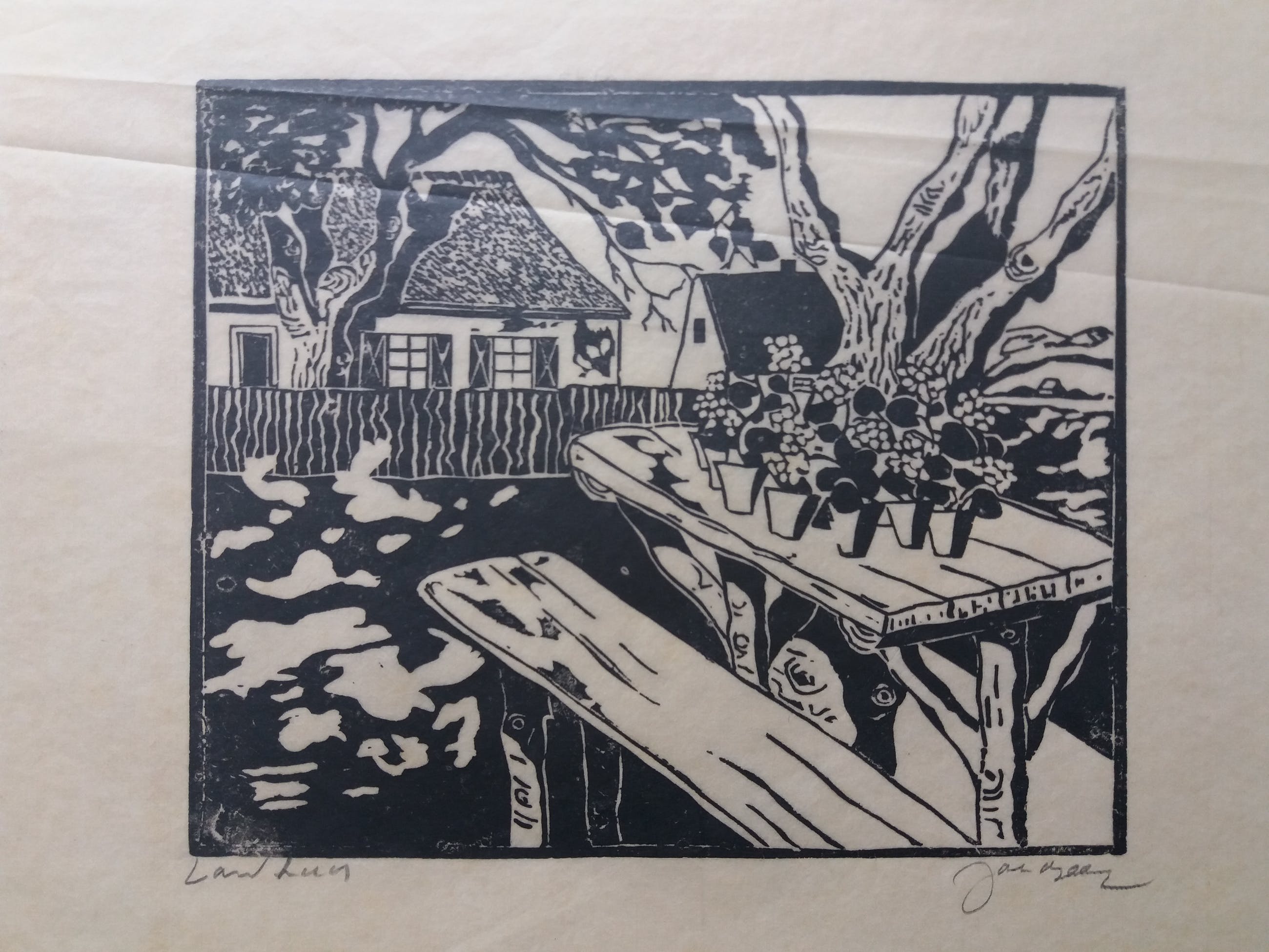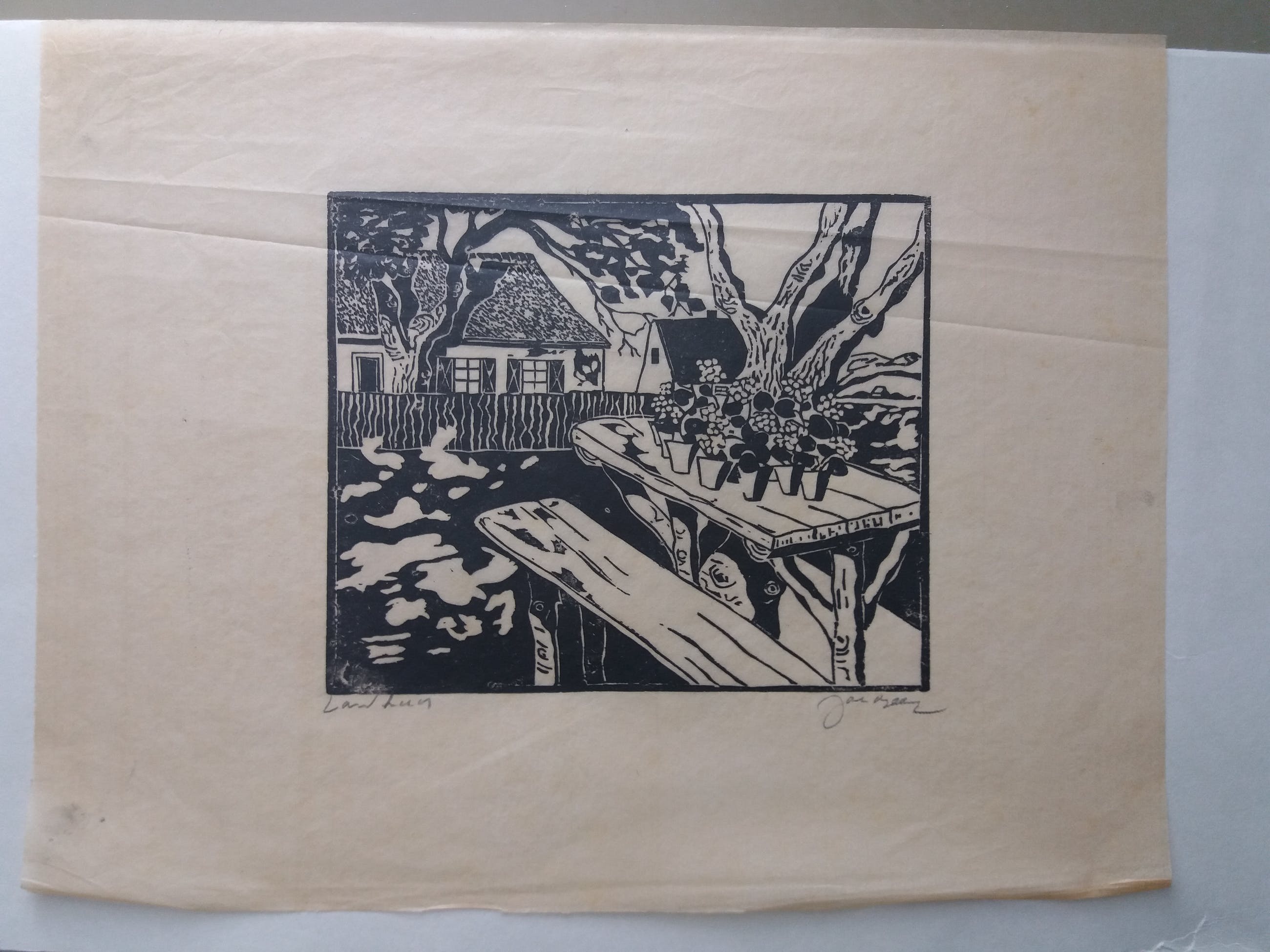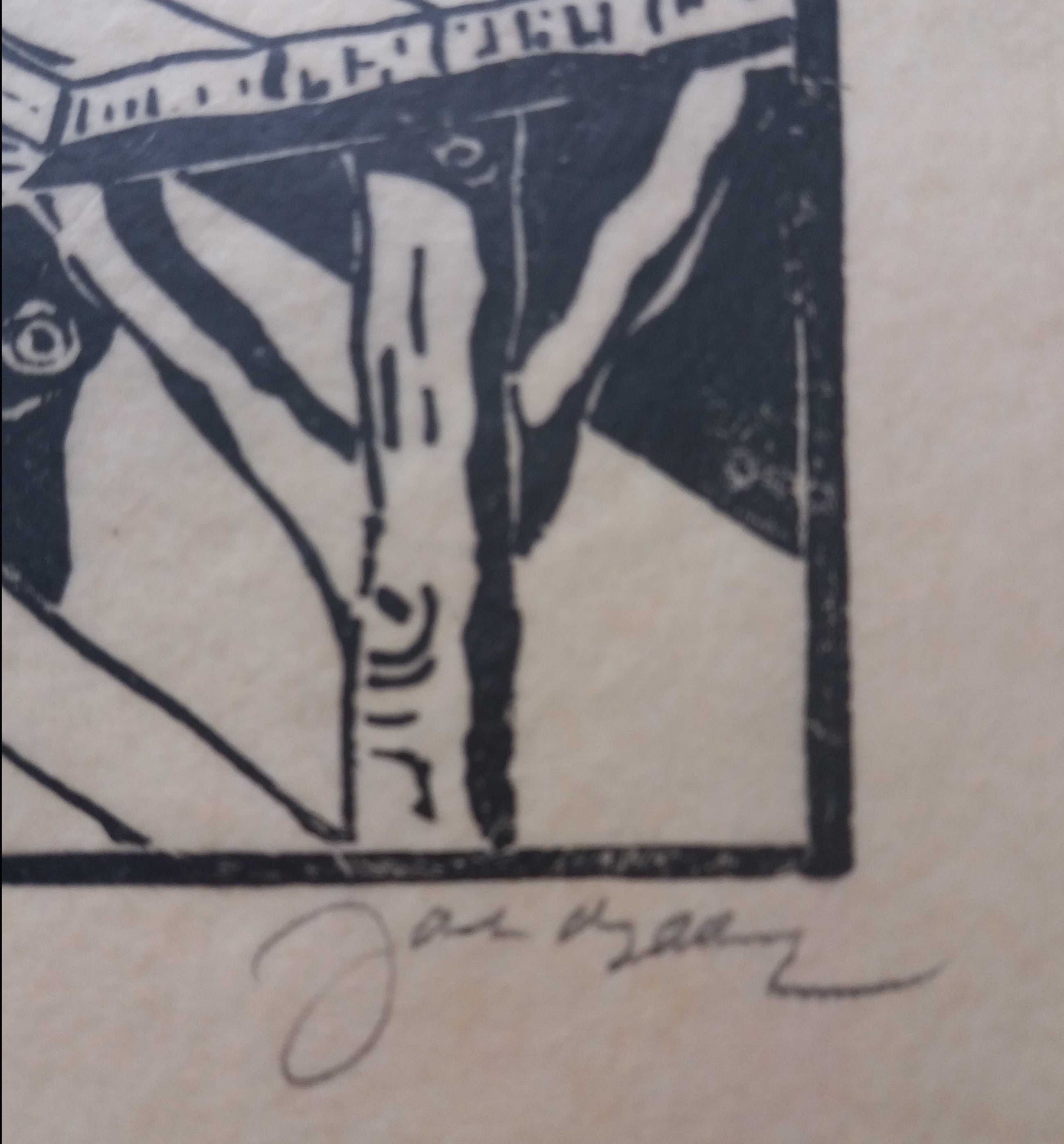 Door Jac de Beer zelf afgedrukte houtsnede en met potlood gesigneerd. Het papier is 43 breed en 34 hoog. Het werk zelf is 23 breed en 19 hoog.