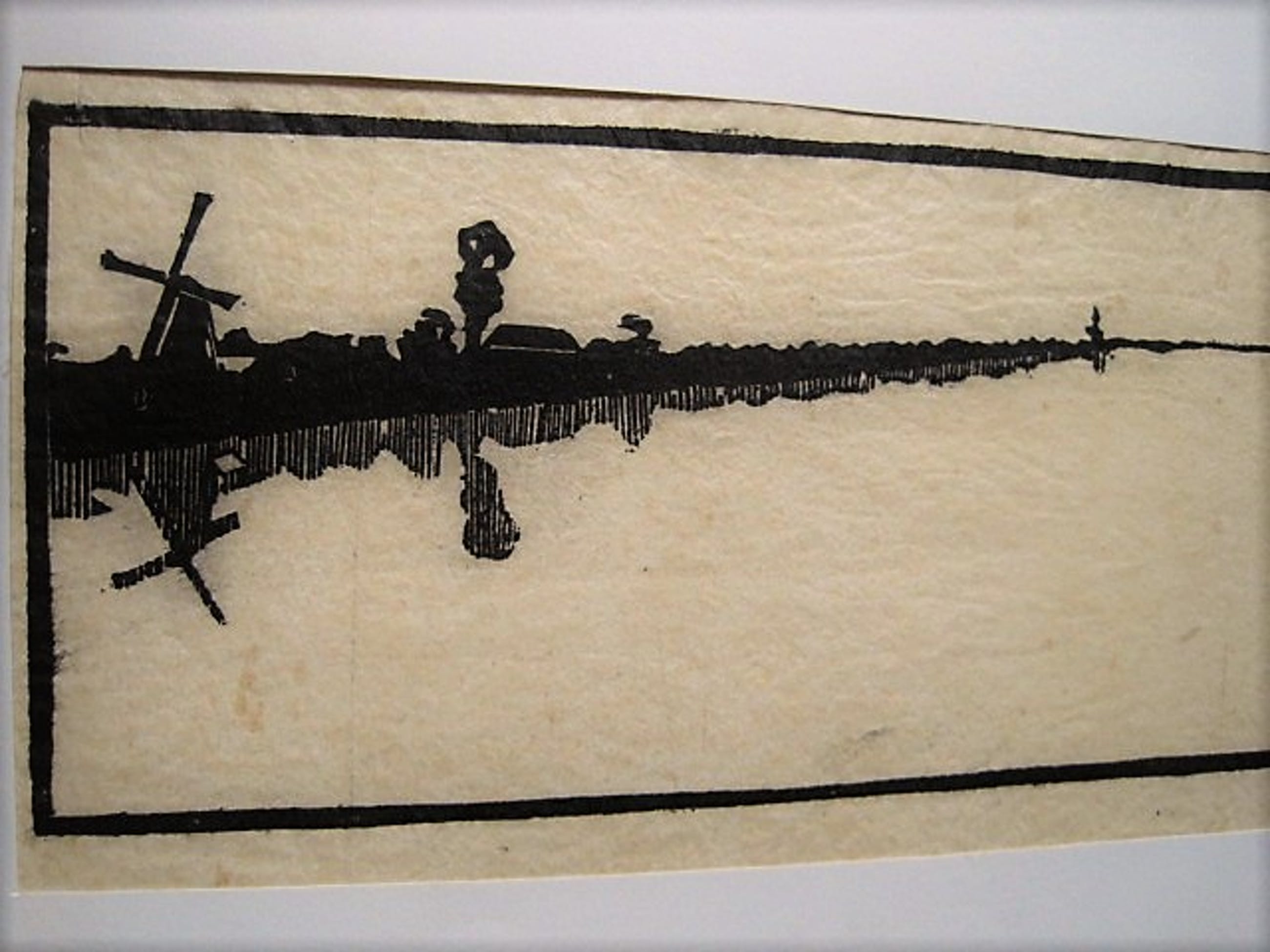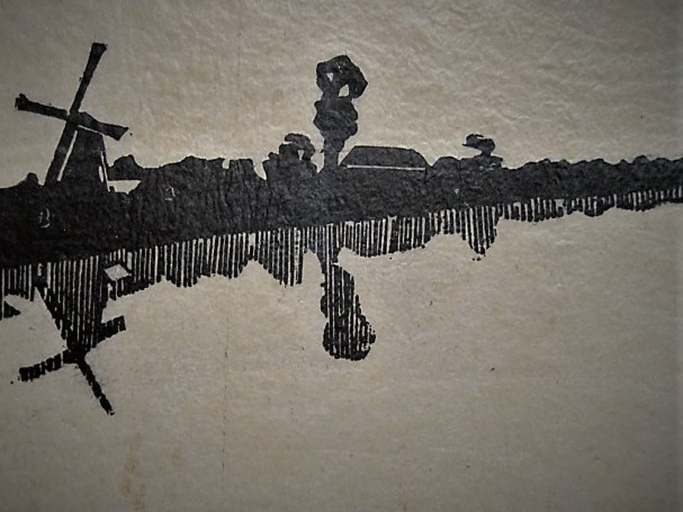 Gesigneerde Houtsnede van een karakteristiek Hollands rivierenlandschap inclusief Molen.