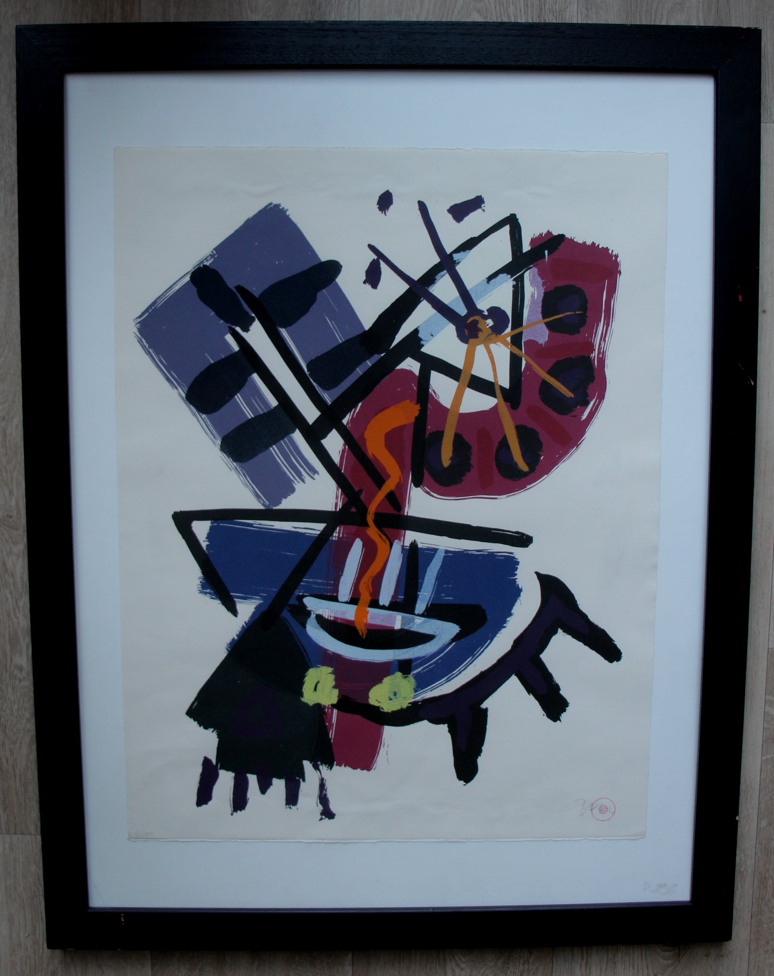 Ingelijste litho van Jac Gijzen. Abstracte compositie. Nummer: 4/100. De litho is met potlood, rechts onderaan het blad gesigneerd door de kunstenaar. Ook voorzien van een stempel. Afmetingen blad incl lijst: h87 x b67 cm. Afmetingen voorstelling: H64.5 x b50. De authenticiteit van dit werk wordt volledig gegarandeerd. Een certificaat van echtheid kan, op aanvraag, worden gemaild.