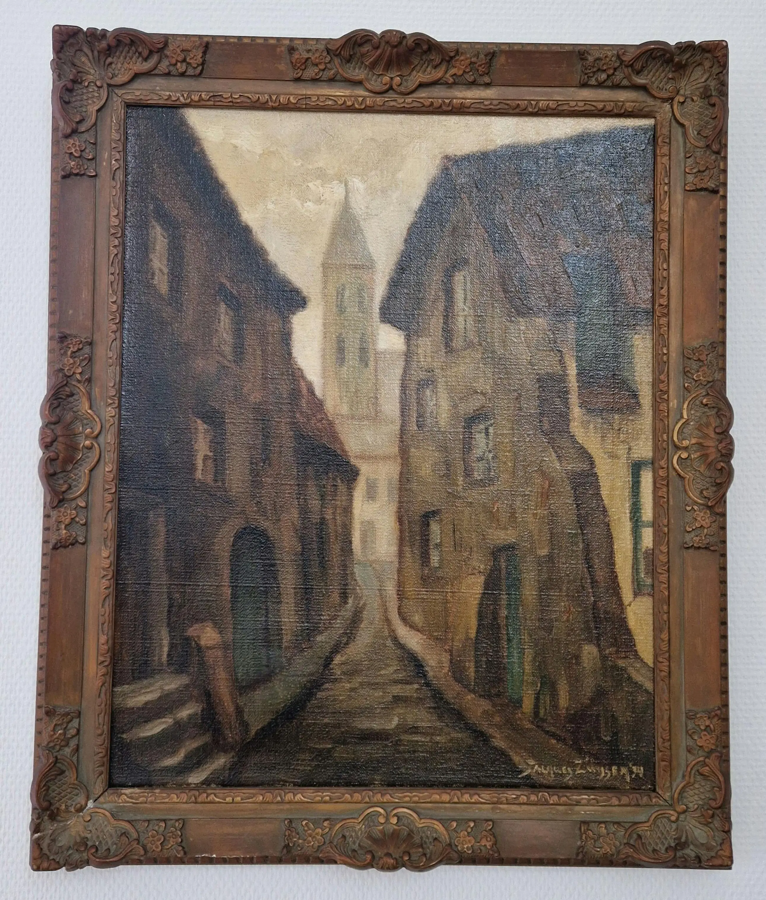 Jac Zwijssen schilderde veel.in Den Bosch. Mogelijknis dit dus een straatbeeld met zicht op een kerk in Den Bosch.