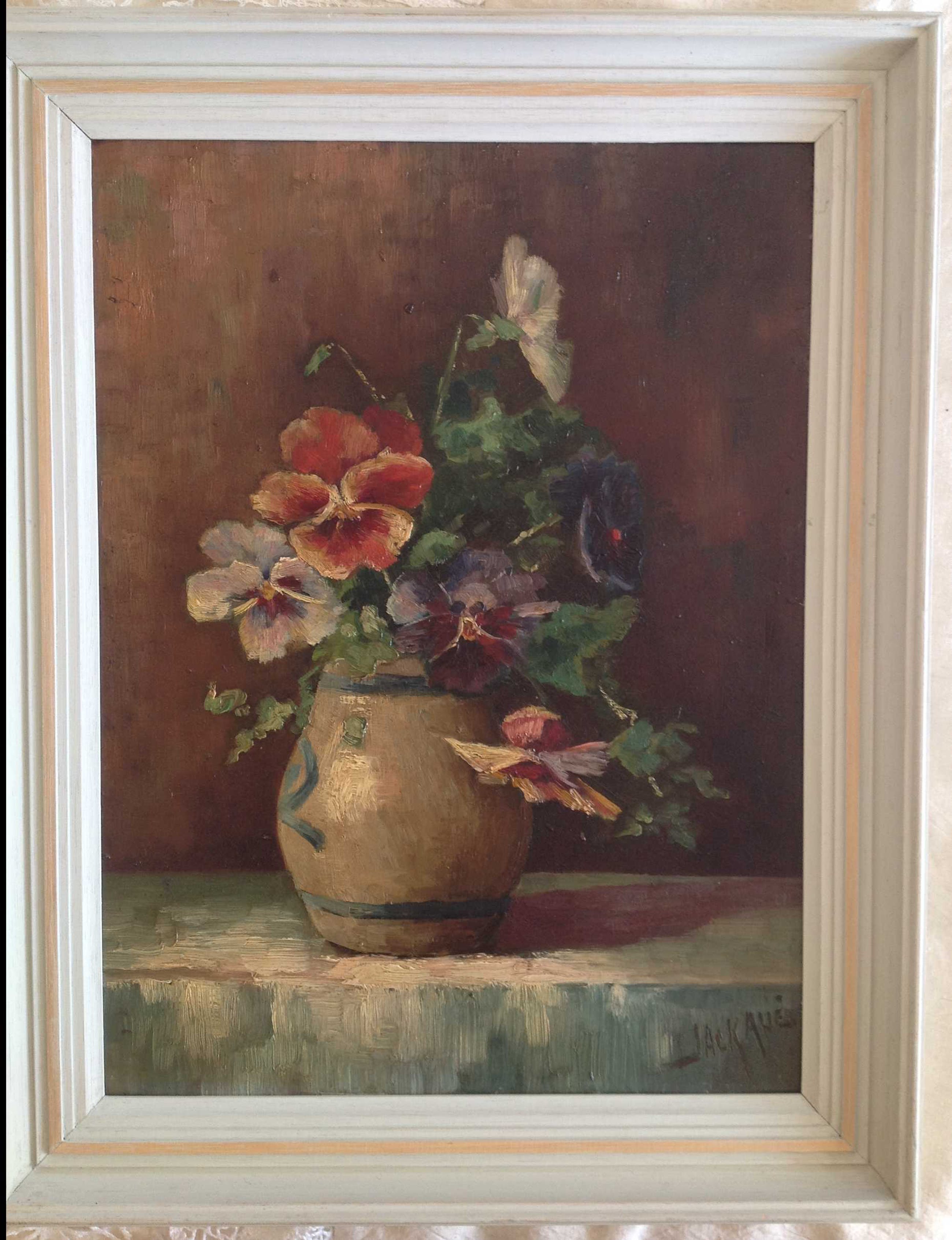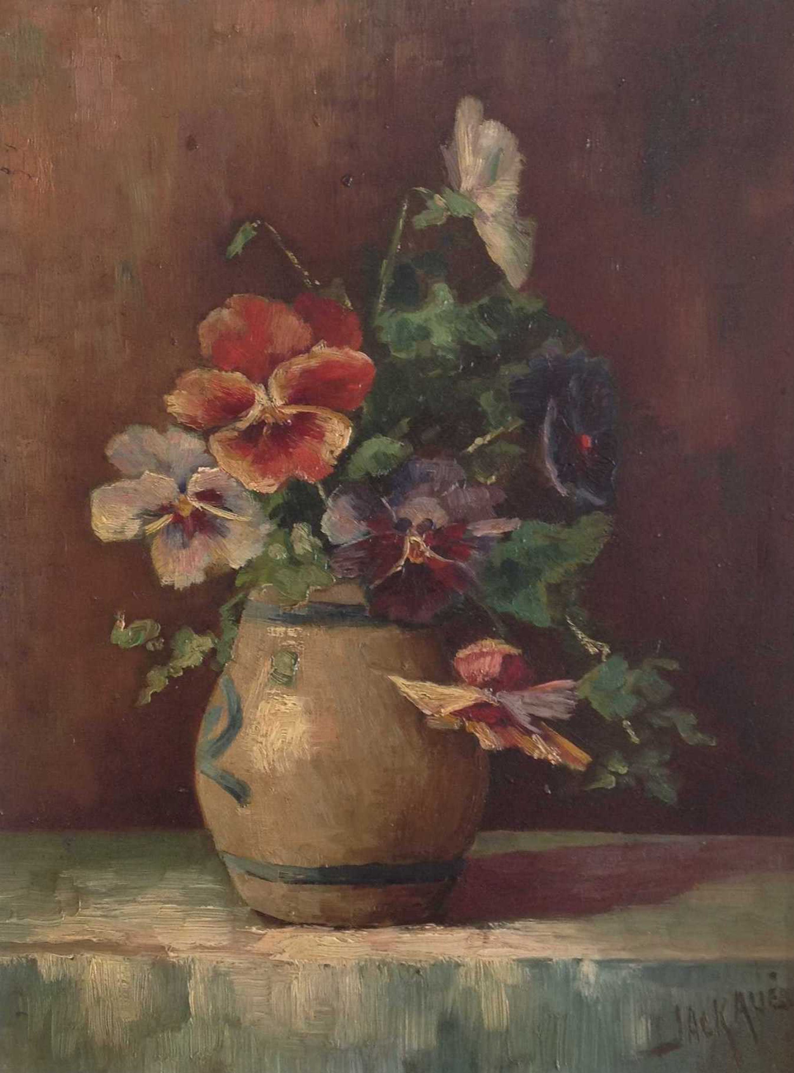 B2469 Jack Aué bloemstilleven met viooltje olie op paneel Buitenmaat 47 x 37 cm beeldmaat 38 x 28 cm gesigneerd r.o. Voor meer informatie over de conditie van dit werk, neem gerust contact met ons op. Ophalen bij ons in Nieuwersluis