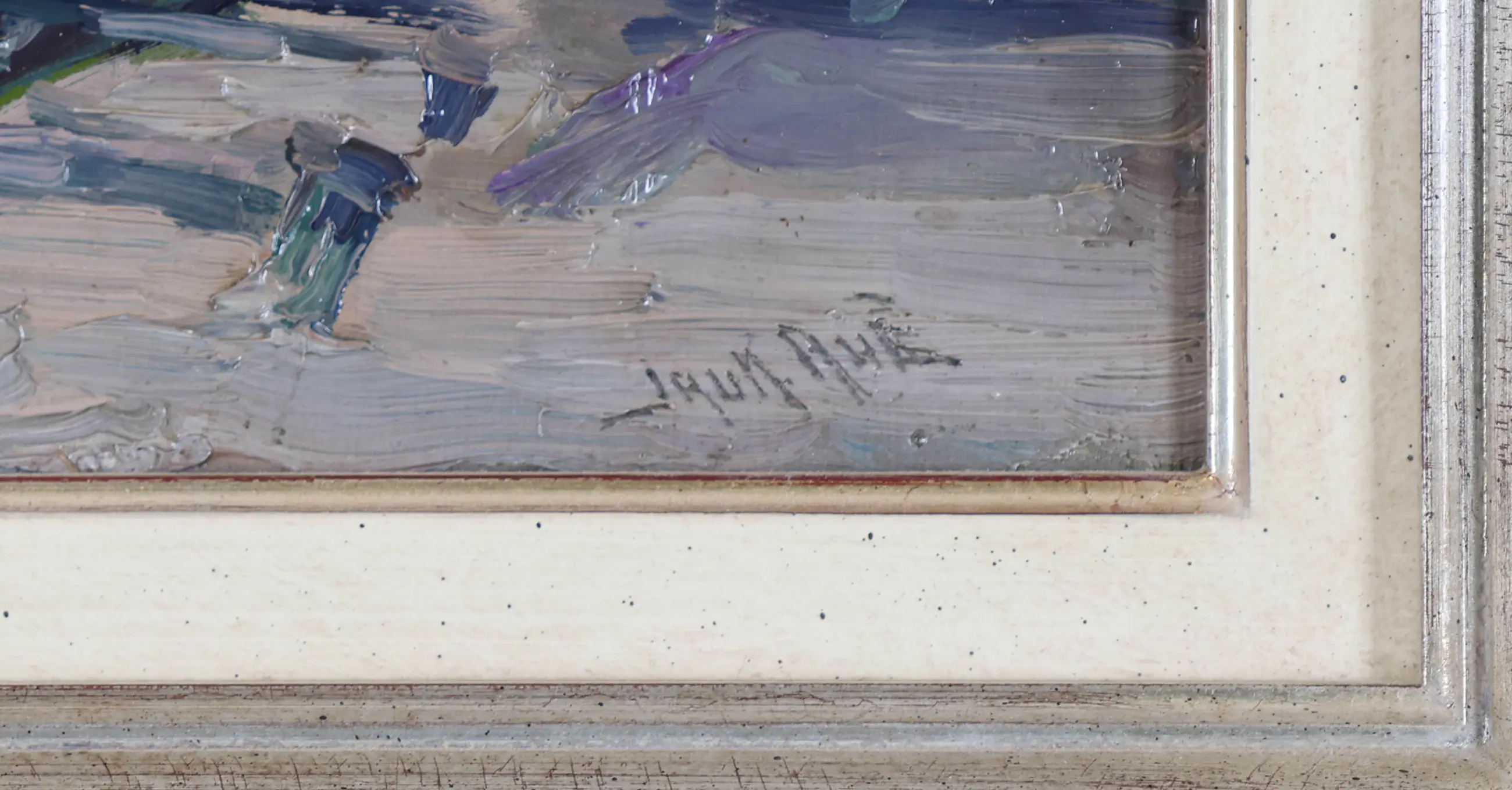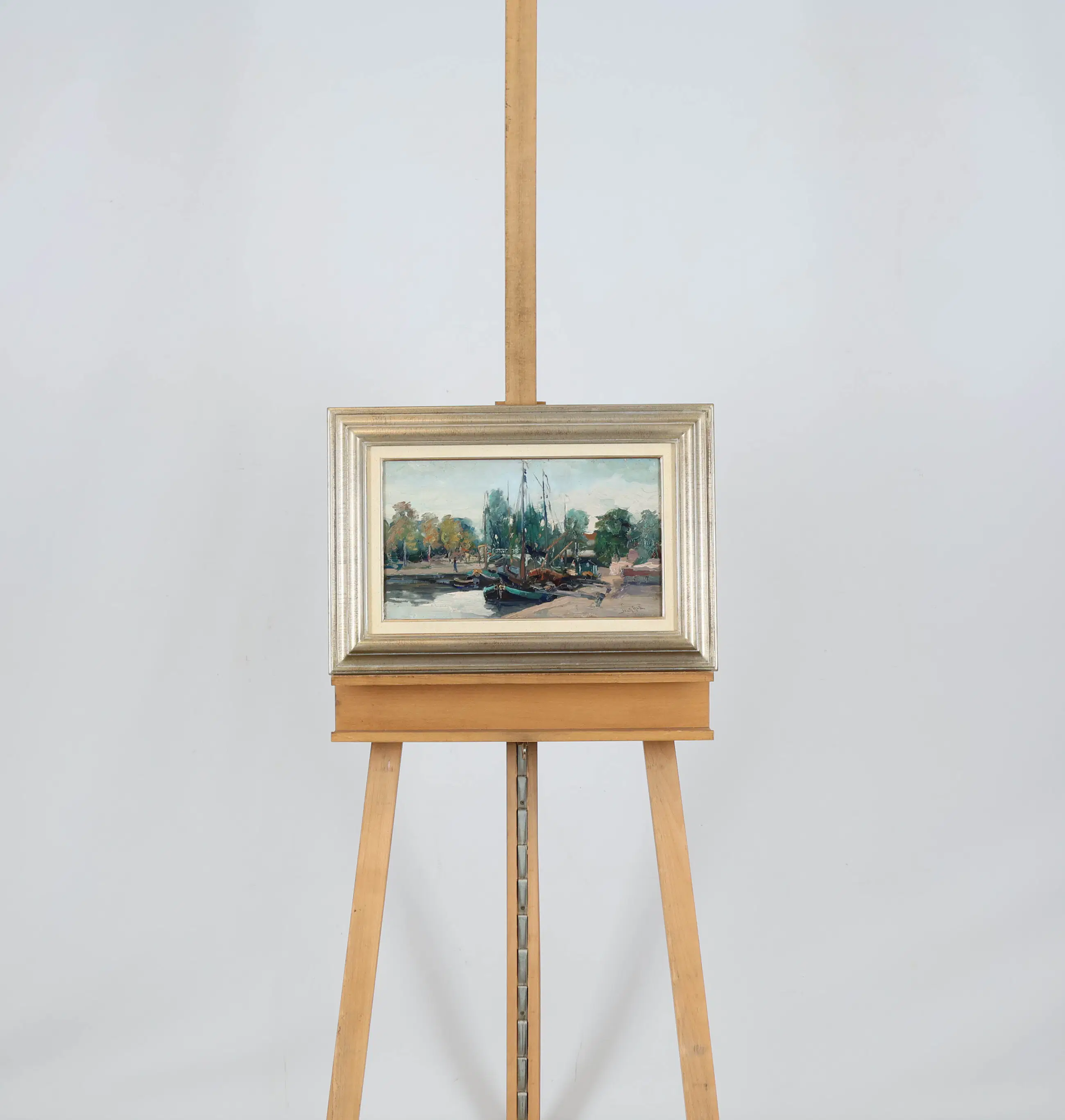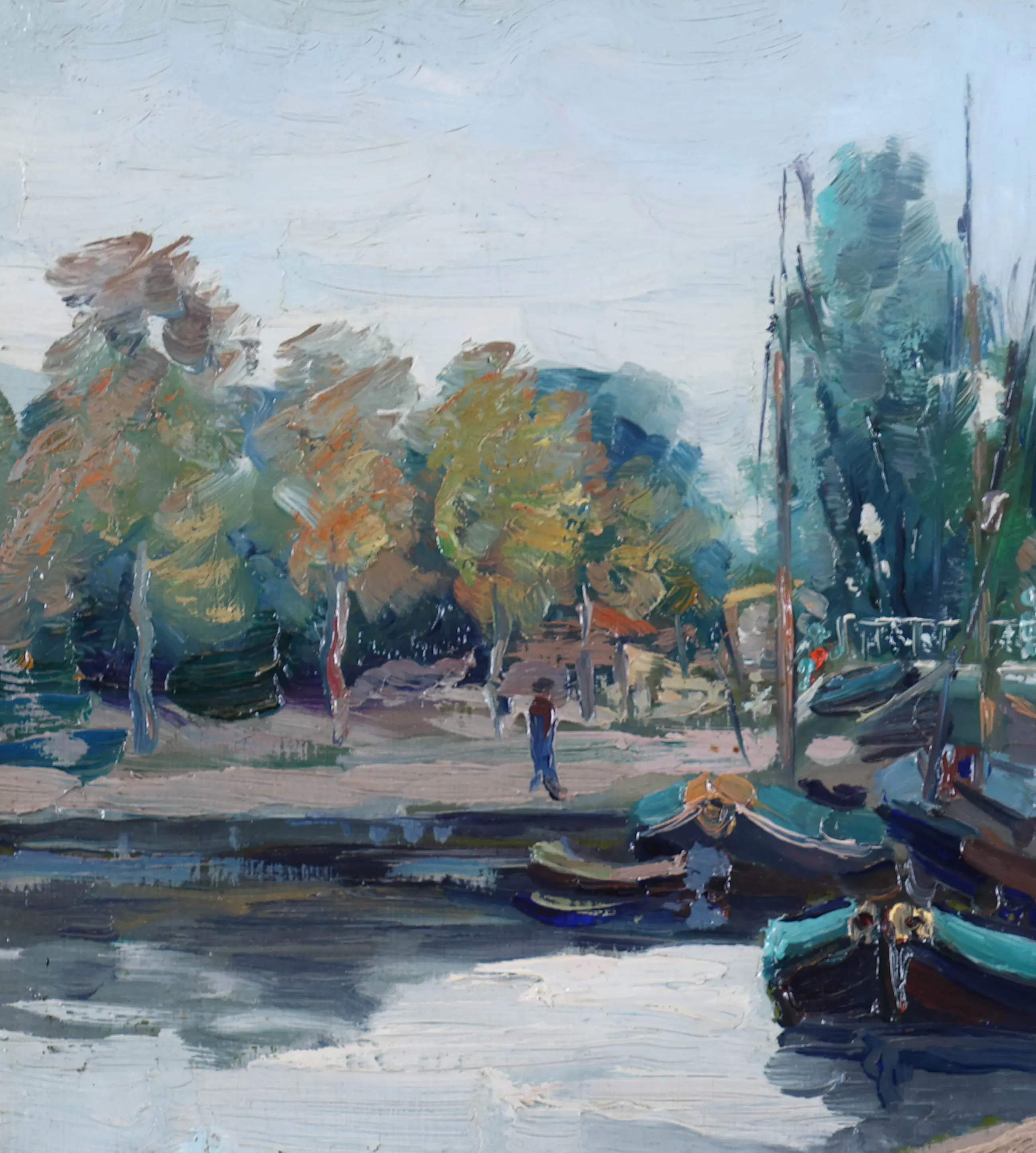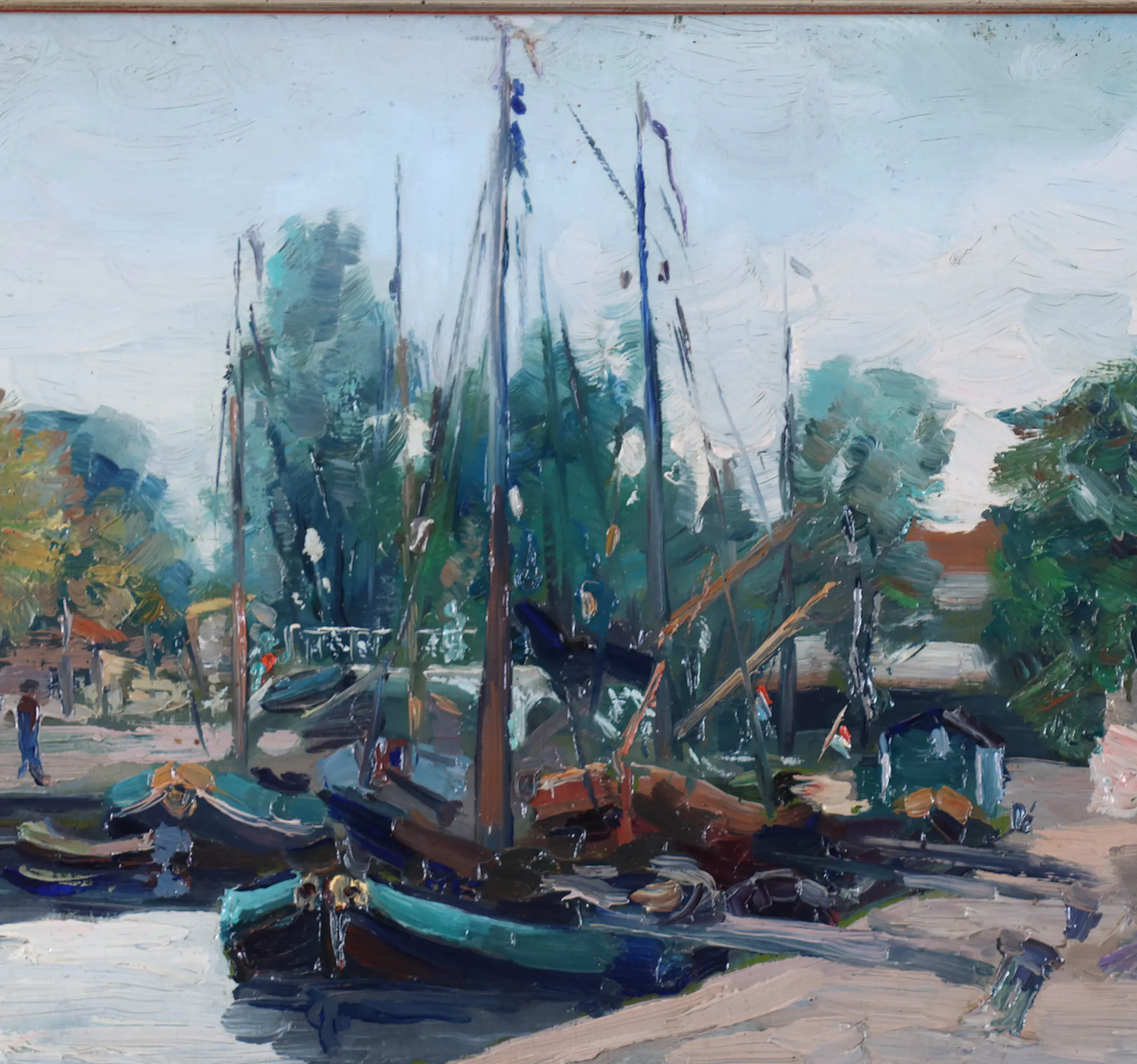 In dit levendige havengezicht brengt Aué met snelle, brede penseelstreken een dynamische indruk van schepen aan de waterkant tot leven. De speelse toets en de frisse kleurcontrasten geven het tafereel een spontane, bijna impressionistische uitstraling. De bomen en gebouwen op de achtergrond zijn in losse vegen gesuggereerd, waardoor de focus ligt op de lichte beweging van water, lucht en schepen. Het werk ademt een zomerse, open sfeer en toont Aué’s vermogen om met minimale middelen sfeer, diepte en activiteit in het landschap te vangen.