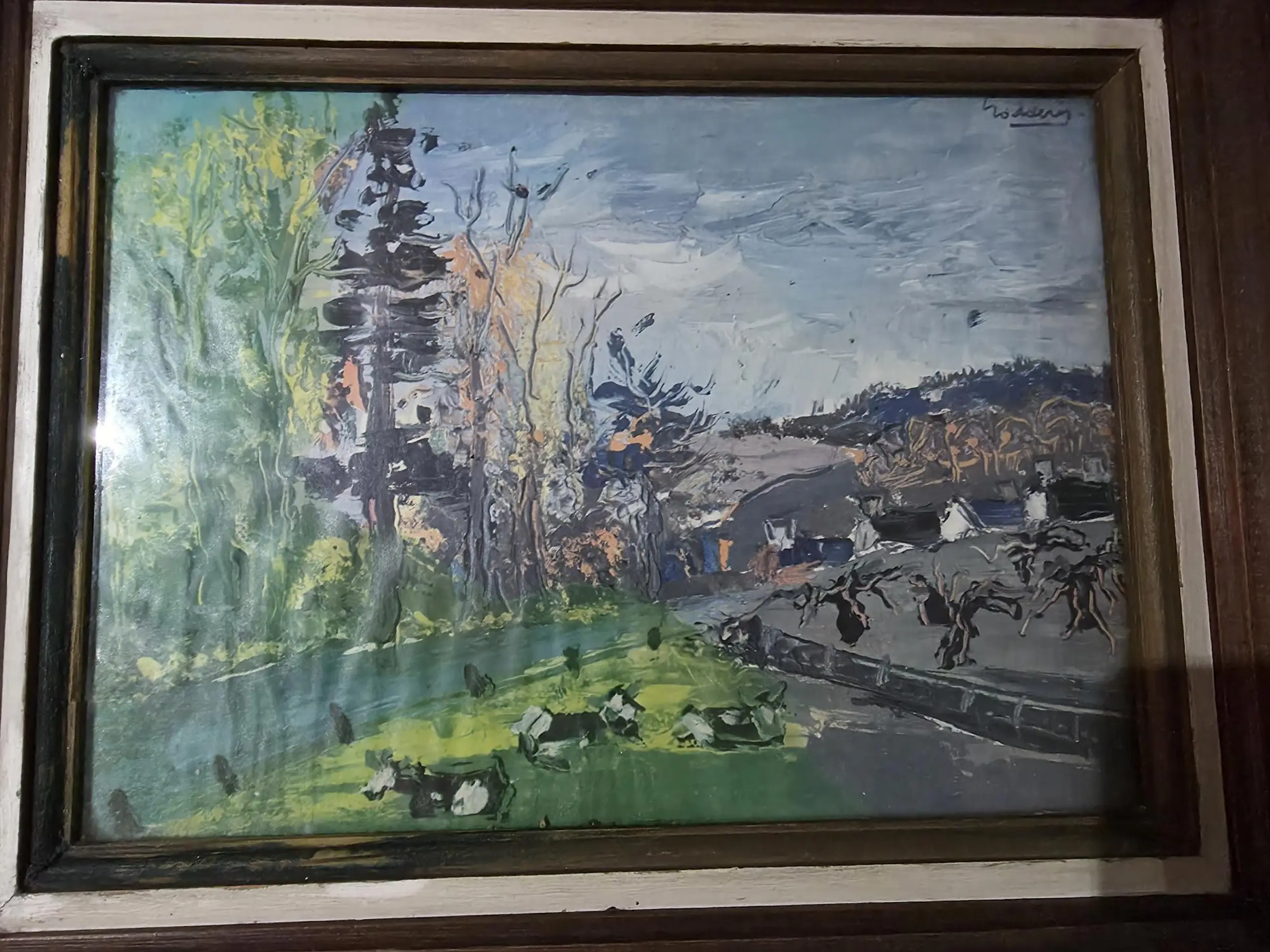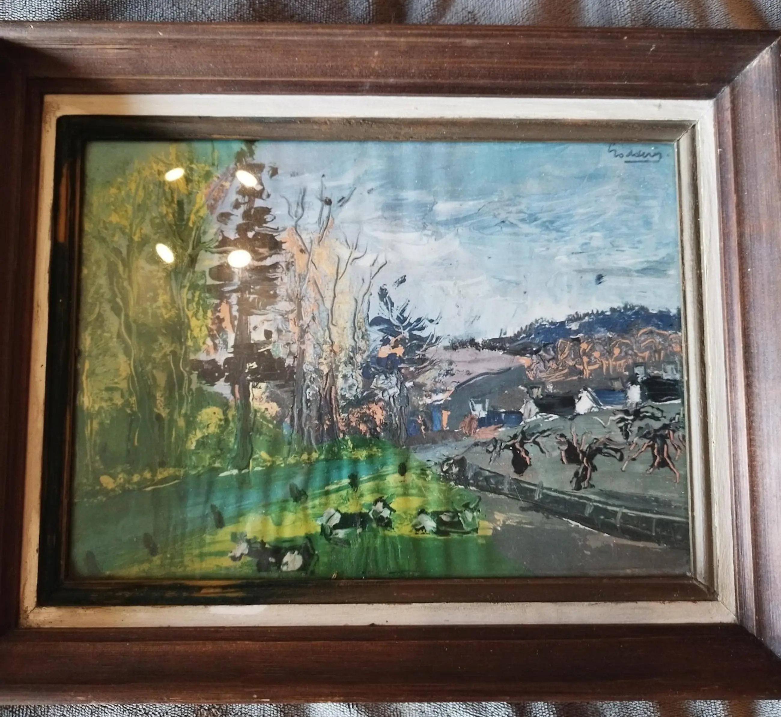 Dit is een werk van de Belgische schilder Jack Godderis. Het is een natuurlandschap met koeien. Werk is ingelijst achter glas.