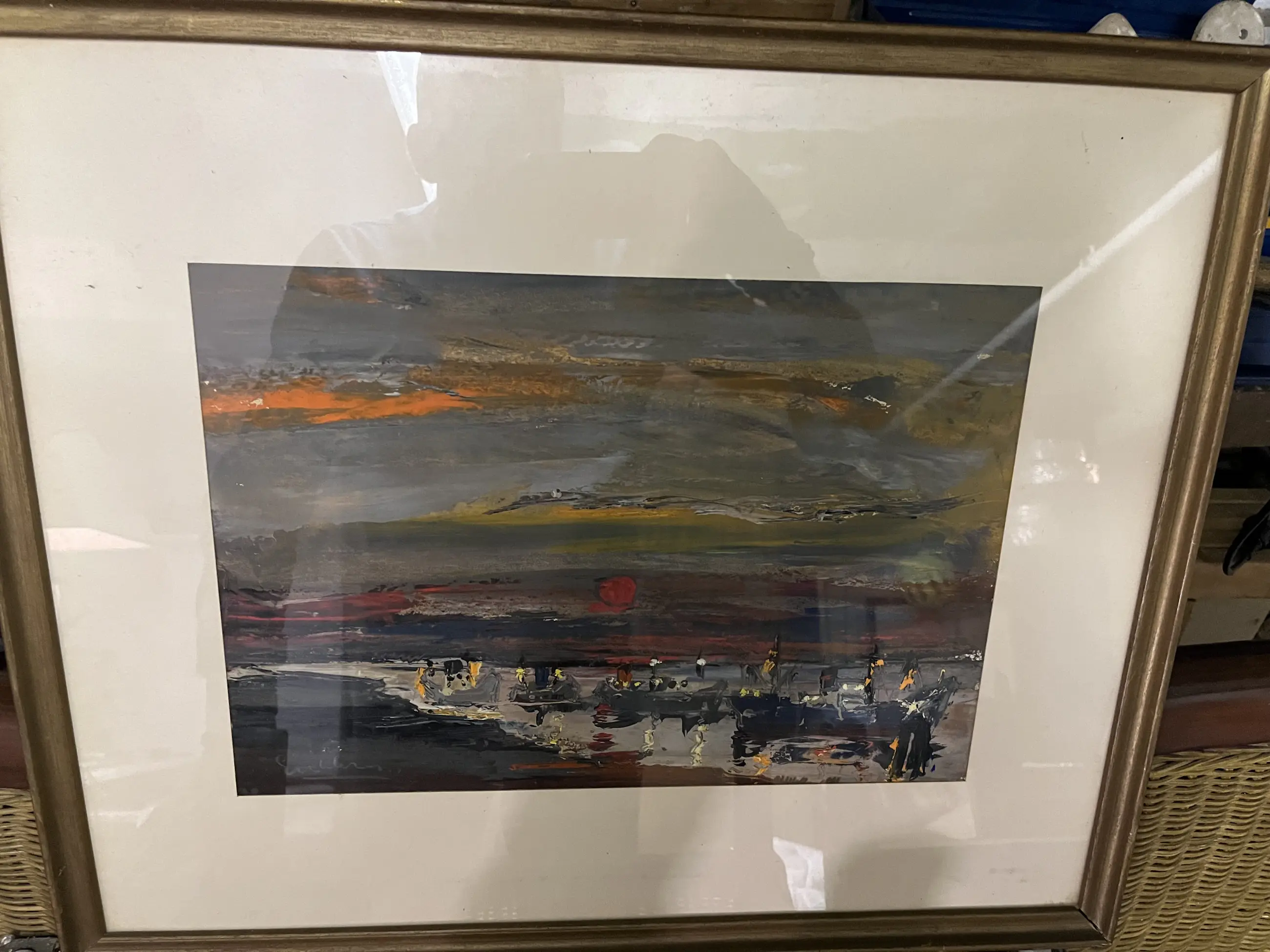 Origineel, getekend olieverfschilderij van post-expressionistisch schilder Godderis van een kleurrijke zondsondergang op zee met vissersboten op rust